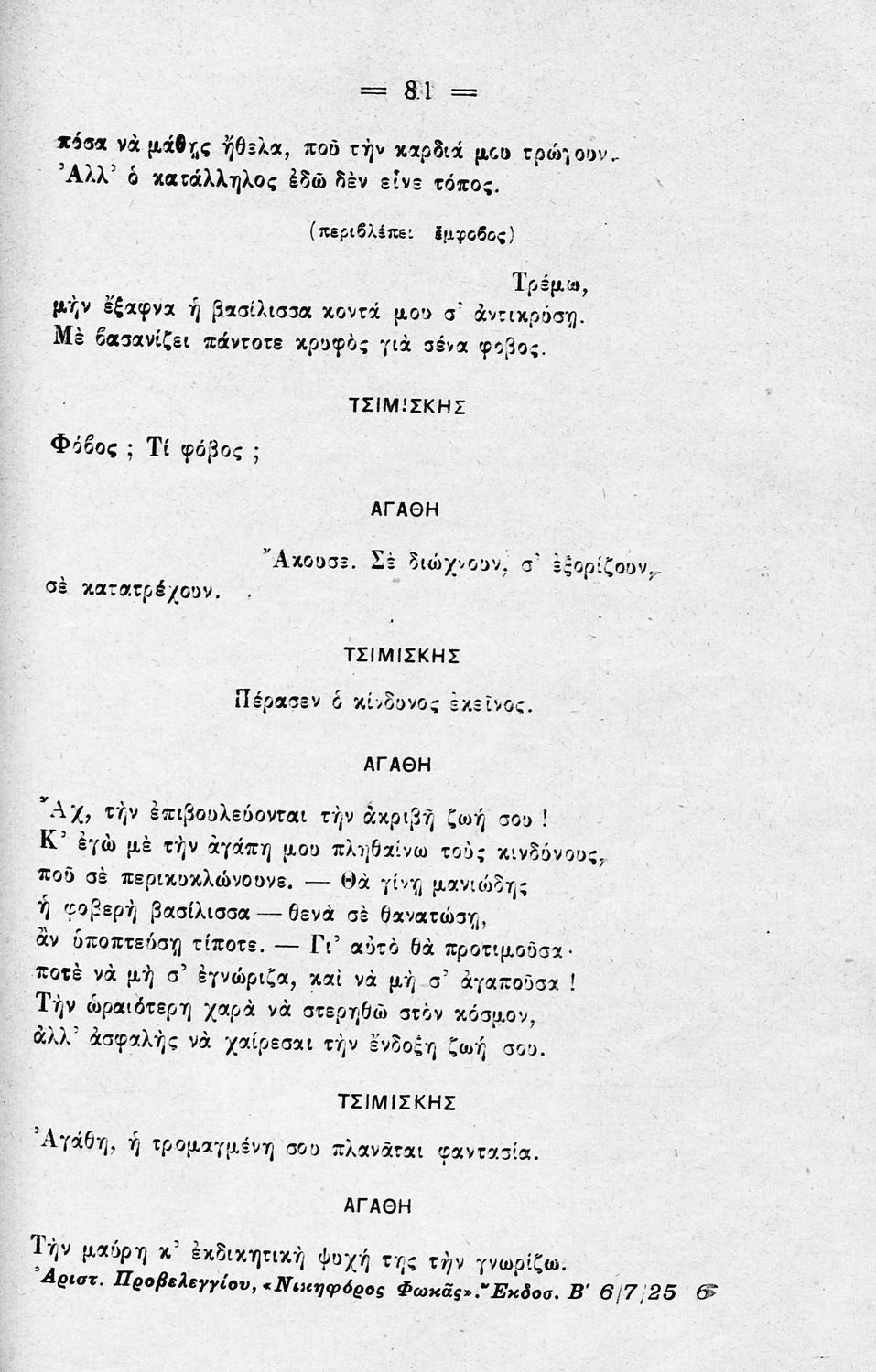 Παρουσίαση περιεχομένου: Τραγωδία γραμμένη από τον Αριστομένη Προβελέγγιο που χωρίζεται σε πέντε πράξεις και βραβεύτηκε στον Β΄ Αβερώφειο Διαγωνισμό του 1913.