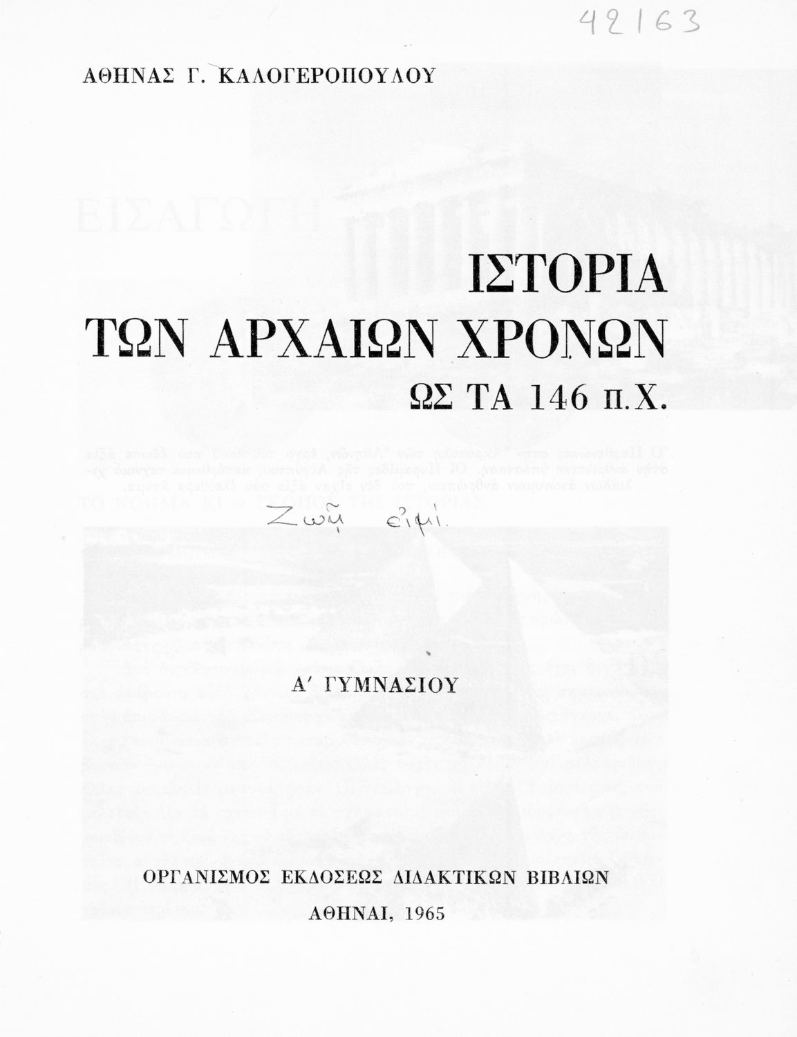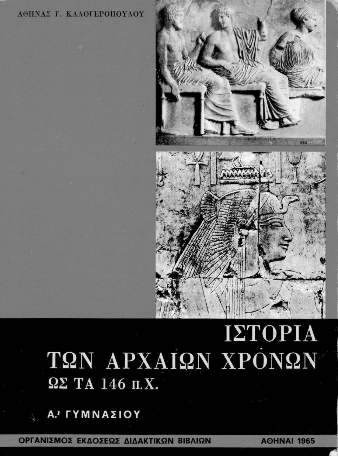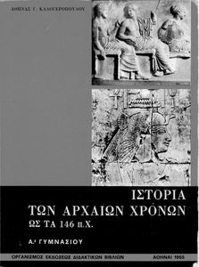 Κωδικός αναγνώρισης: 01-42163 Τίτλος: Ιστορία των αρχαίων χρόνων ως το 146 π. Χ. Α΄ Γυμνασίου Συγγραφέας: Αθηνά Γ. Καλογεροπούλου Εικονογράφος: Λουΐζα Μοντεσάντου Μέγεθος και υπόστρωμα: Σχολικό εγχειρίδιο, σκληρό εξώφυλλο, 351 σελίδες. Σκίτσα, χάρτης, εικόνες (ασπρόμαυρα). |