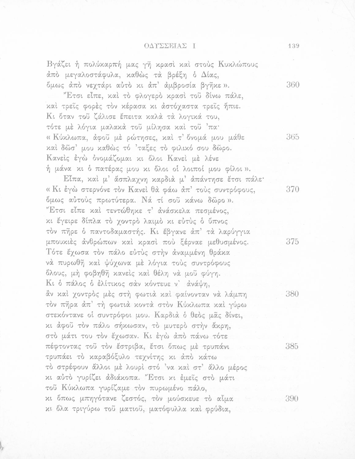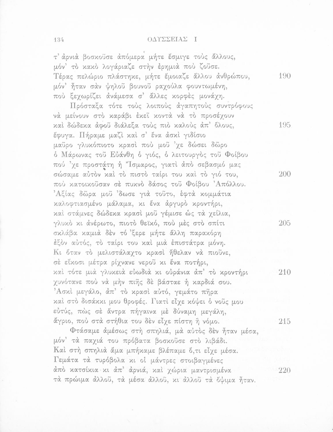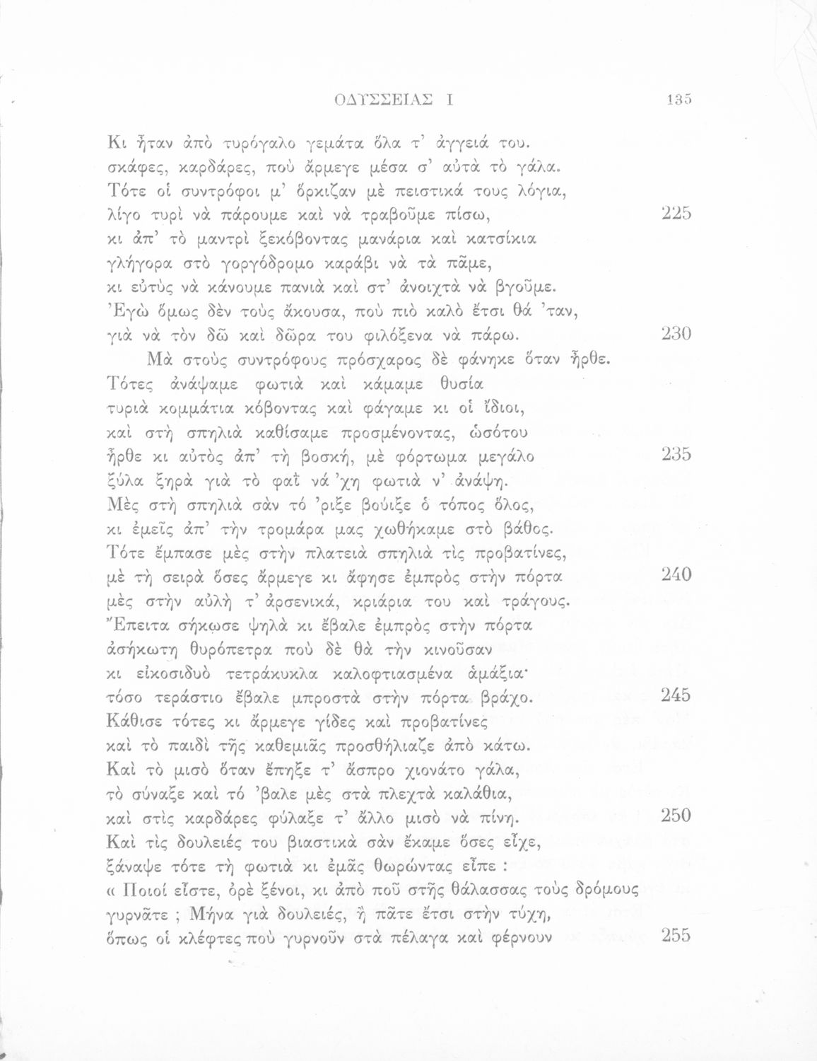 Σχολικό εγχειρίδιο του Γυμνασίου για το μάθημα των Αρχαίων Ελληνικών. Πρόκειται για το κείμενο της Οδύσσειας μεταφρασμένο στο τέλος περιλαμβάνει λεξιλόγιο.