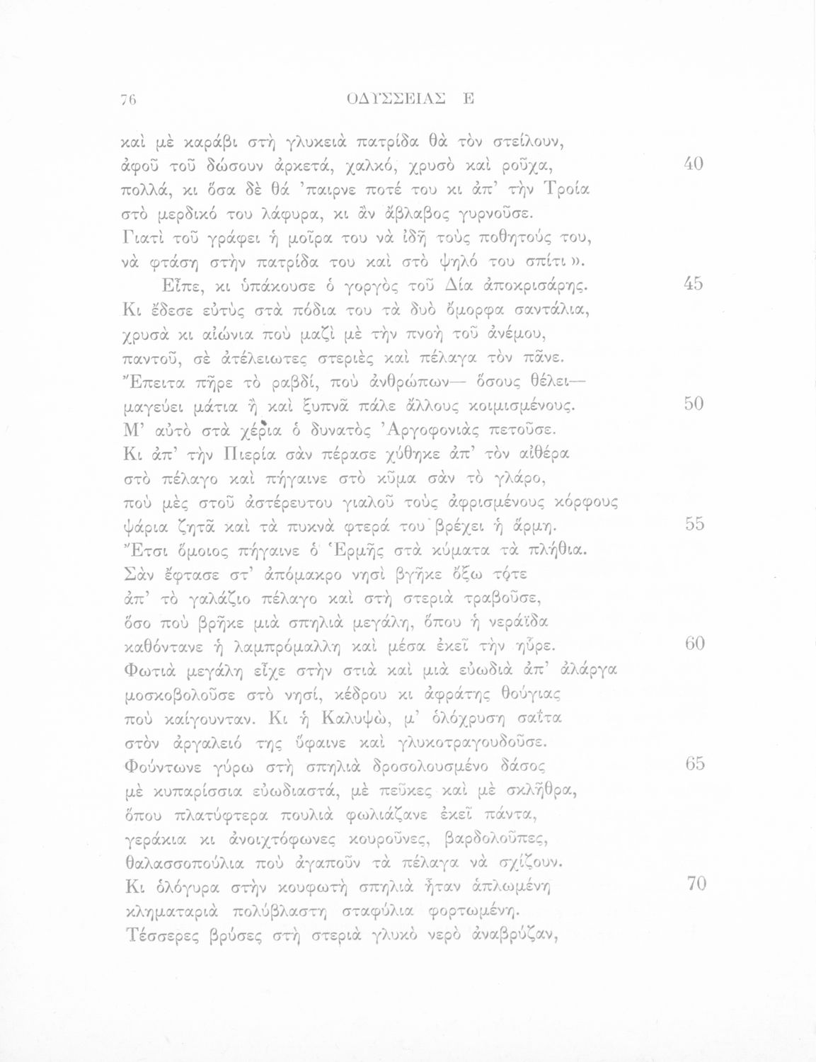 Σχολικό εγχειρίδιο της Δευτεροβάθμιας Εκπαίδευσης για το μάθημα των Αρχαίων Ελληνικών. Πρόκειται για το κείμενο της Οδύσσειας μεταφρασμένο, με πραγματολογικές παρατηρήσεις. Στο τέλος περιλαμβάνει λεξιλόγιο.