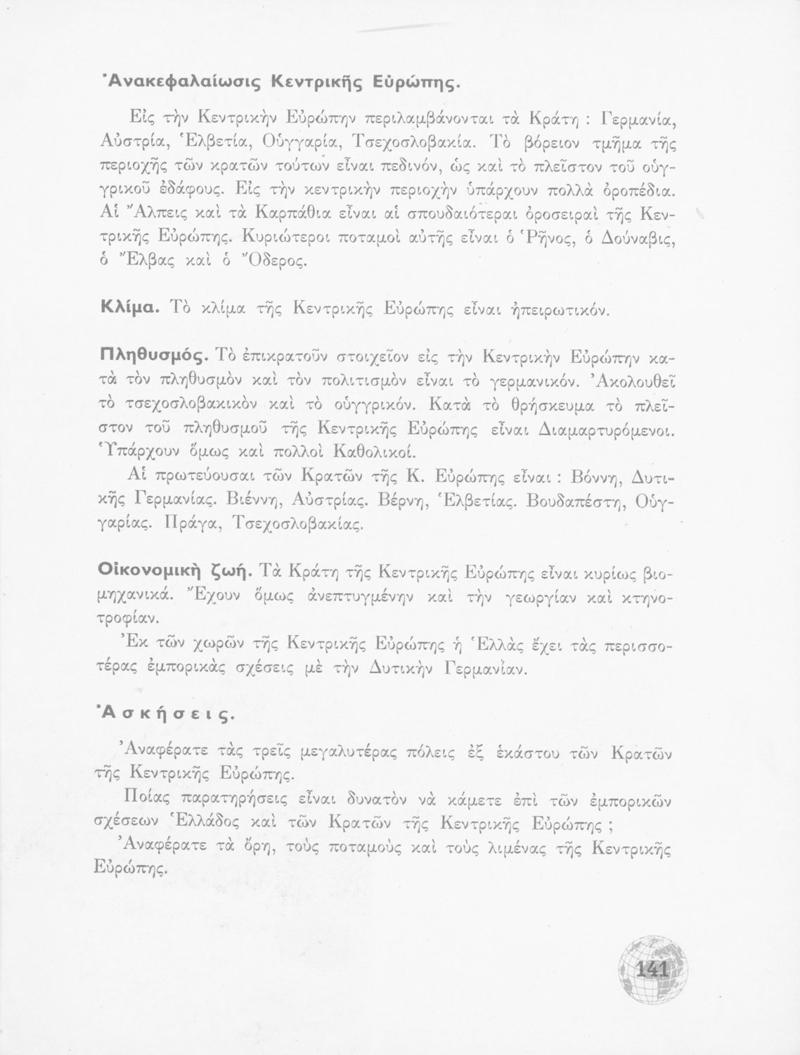 Σχολικό εγχειρίδιο Γεωγραφίας Α΄ Γυμνασίου που περιλαμβάνει στοιχεία φυσικής και μαθηματικής γεωγραφίας και εξετάζει τις χώρες της Ευρώπης από γεωφυσική, οικονομική και πολιτική άποψη.