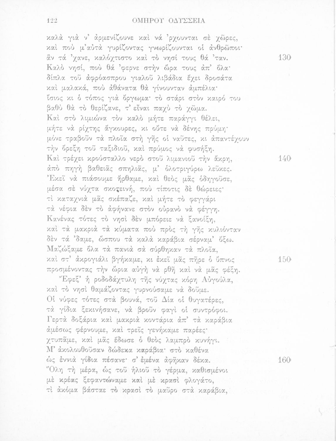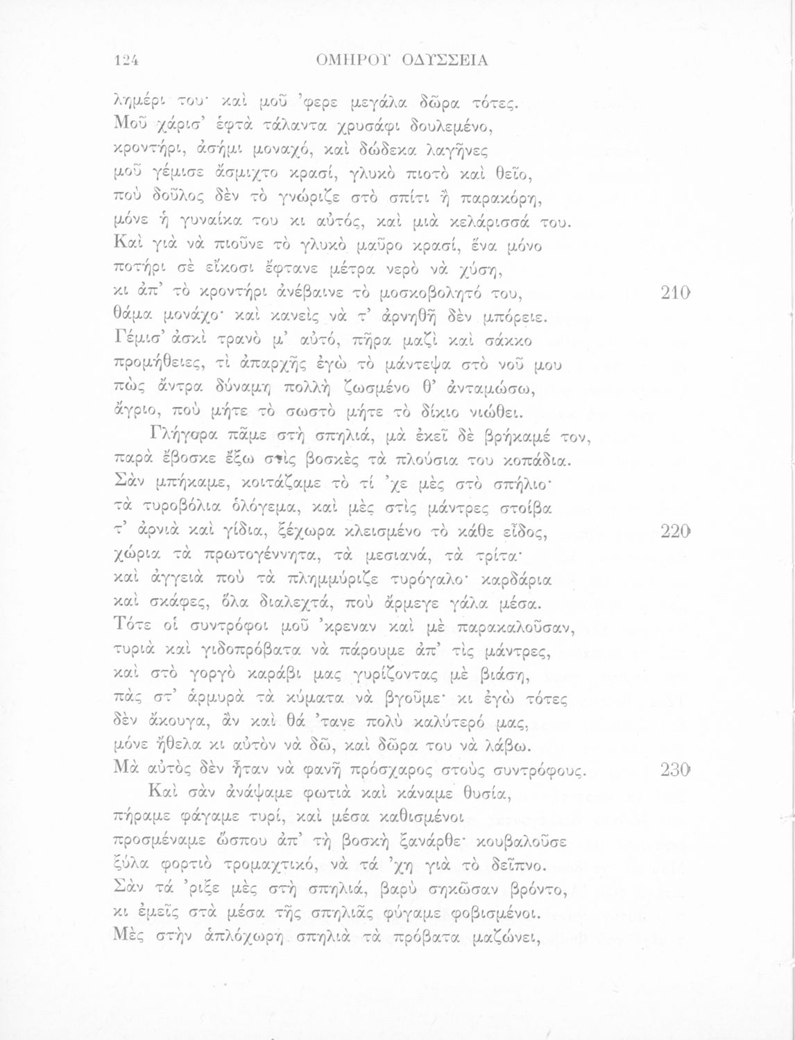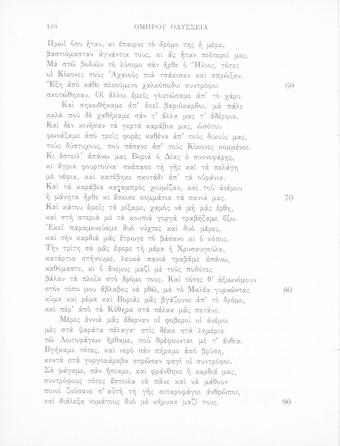 Σχολικό εγχειρίδιο της Δευτεροβάθμιας Εκπαίδευσης για το μάθημα των Αρχαίων Ελληνικών. Πρόκειται για το κείμενο της Οδύσσειας με έμμετρη μετάφραση. Στο τέλος περιλαμβάνει λεξιλόγιο.