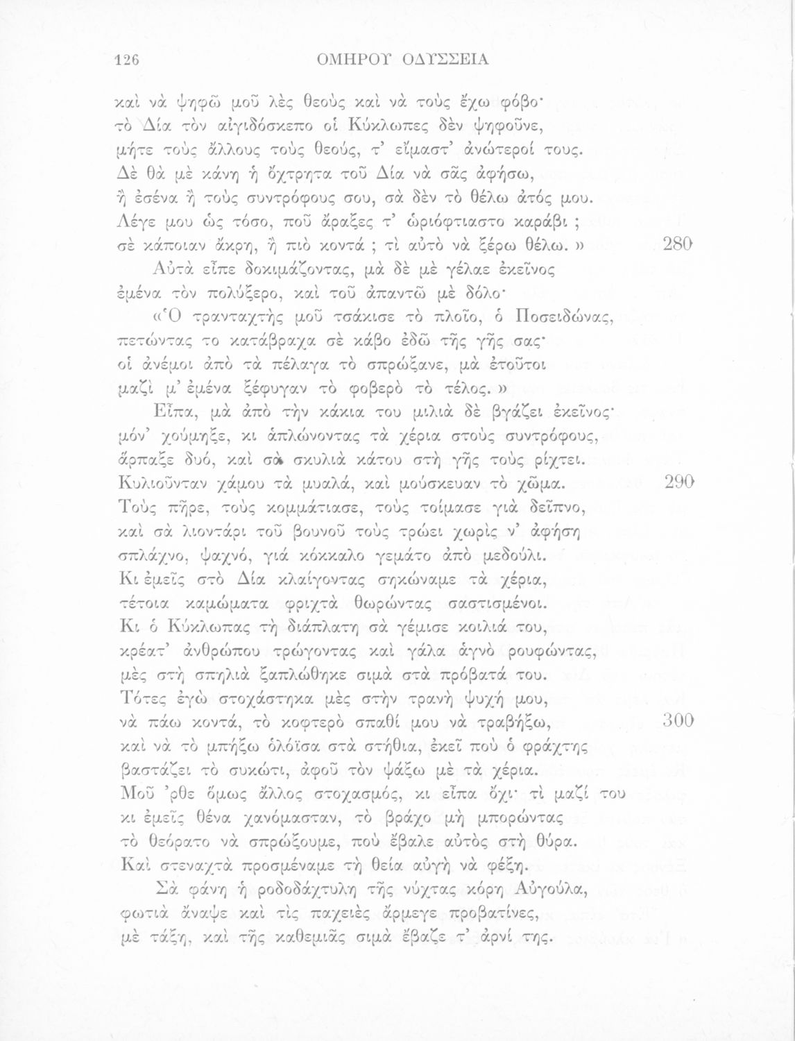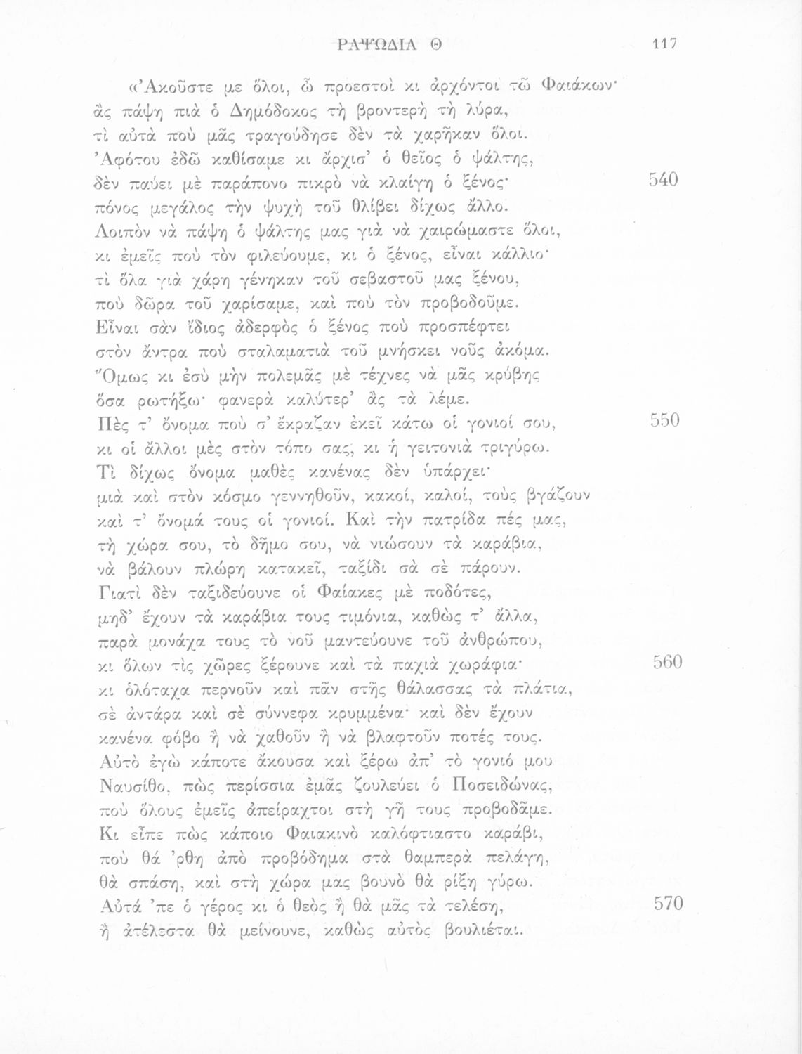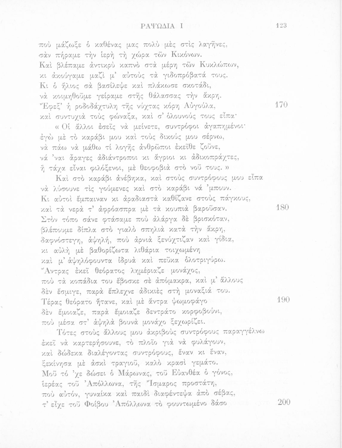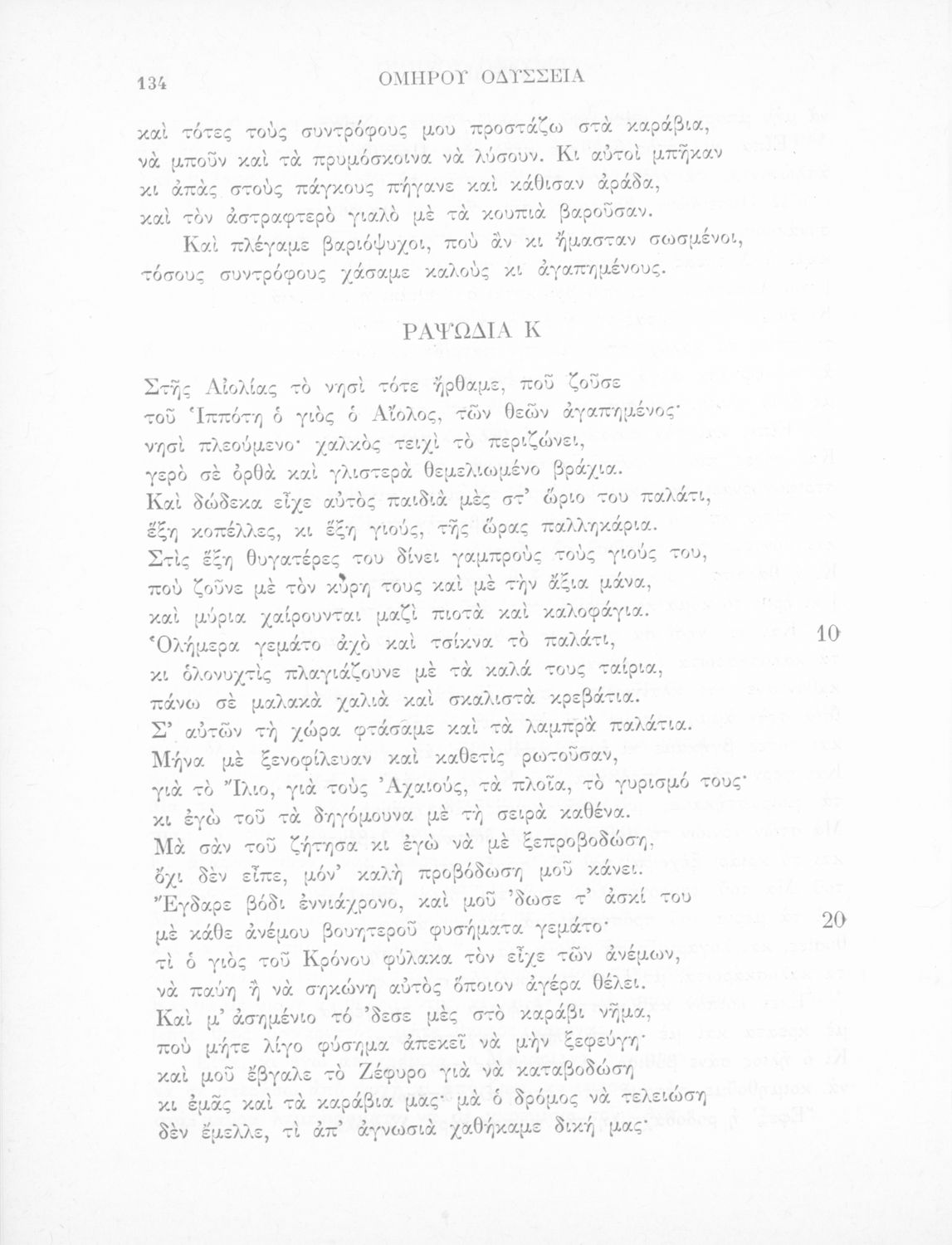 Σχολικό εγχειρίδιο της Δευτεροβάθμιας Εκπαίδευσης για το μάθημα των Αρχαίων Ελληνικών. Πρόκειται για το κείμενο της Οδύσσειας με έμμετρη μετάφραση. Στο τέλος περιλαμβάνει λεξιλόγιο.