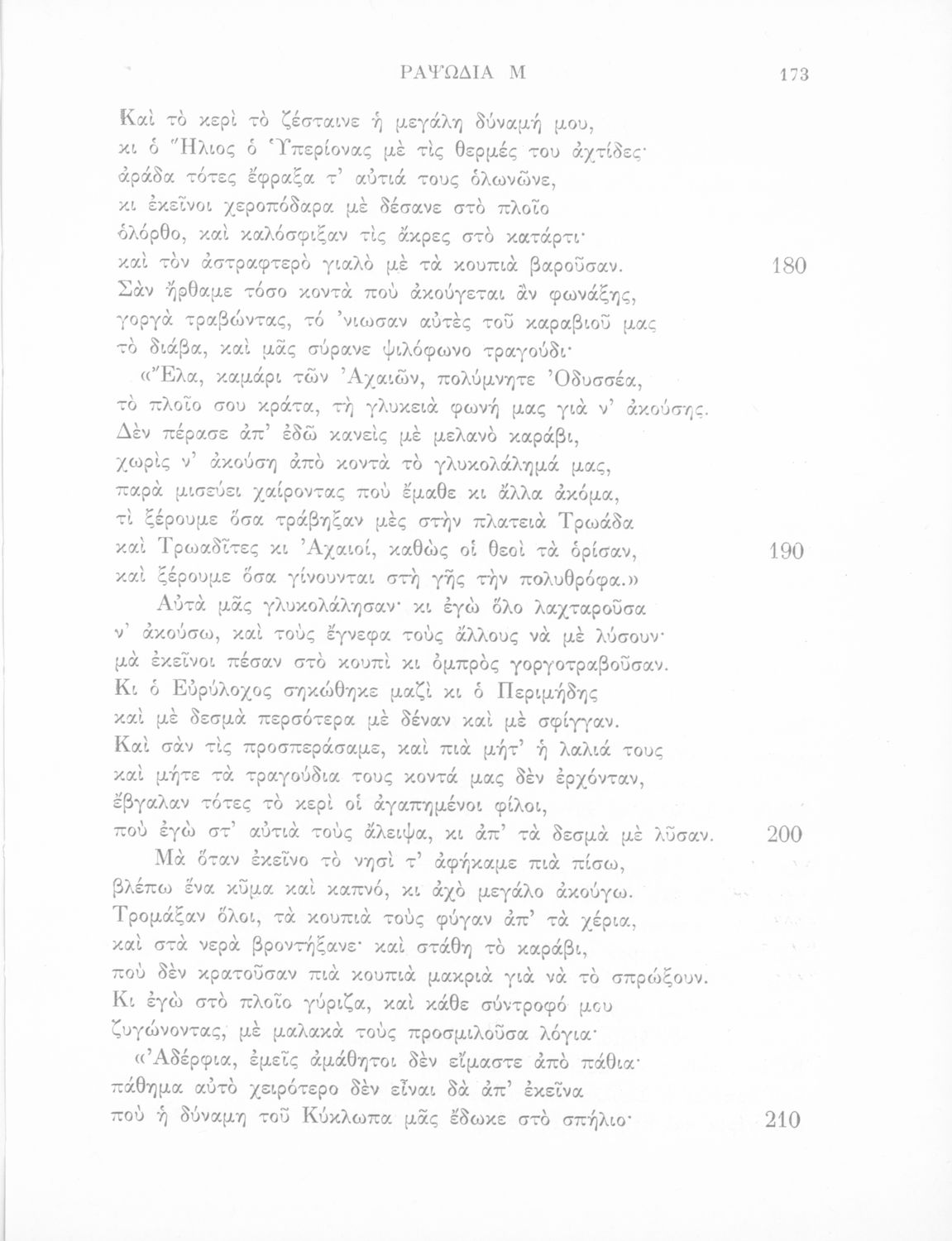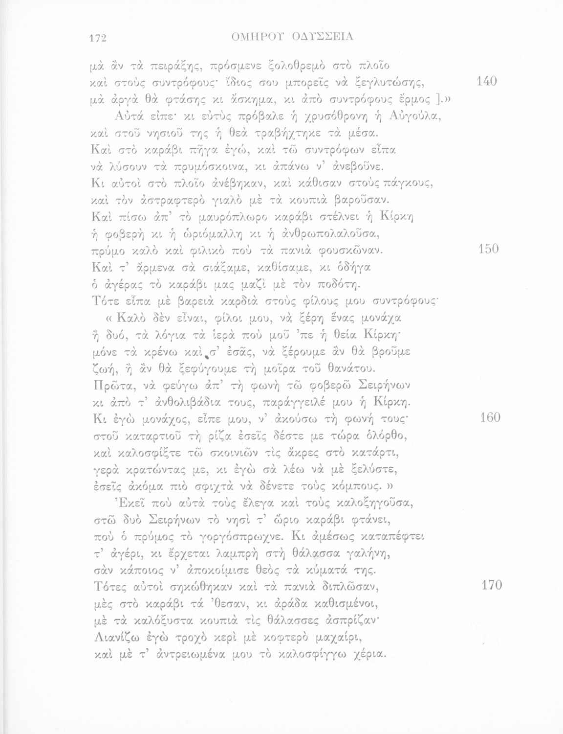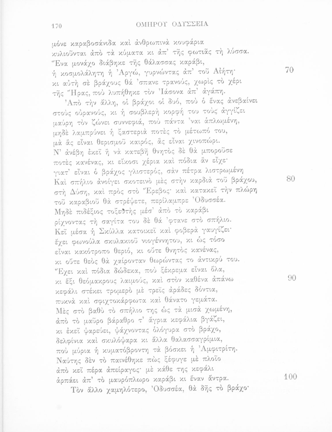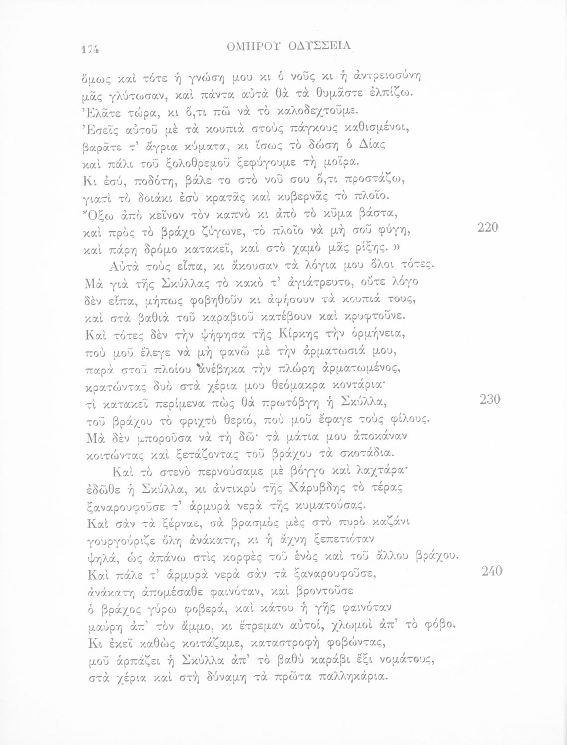 Σχολικό εγχειρίδιο της Δευτεροβάθμιας Εκπαίδευσης για το μάθημα των Αρχαίων Ελληνικών. Πρόκειται για το κείμενο της Οδύσσειας με έμμετρη μετάφραση. Στο τέλος περιλαμβάνει λεξιλόγιο.