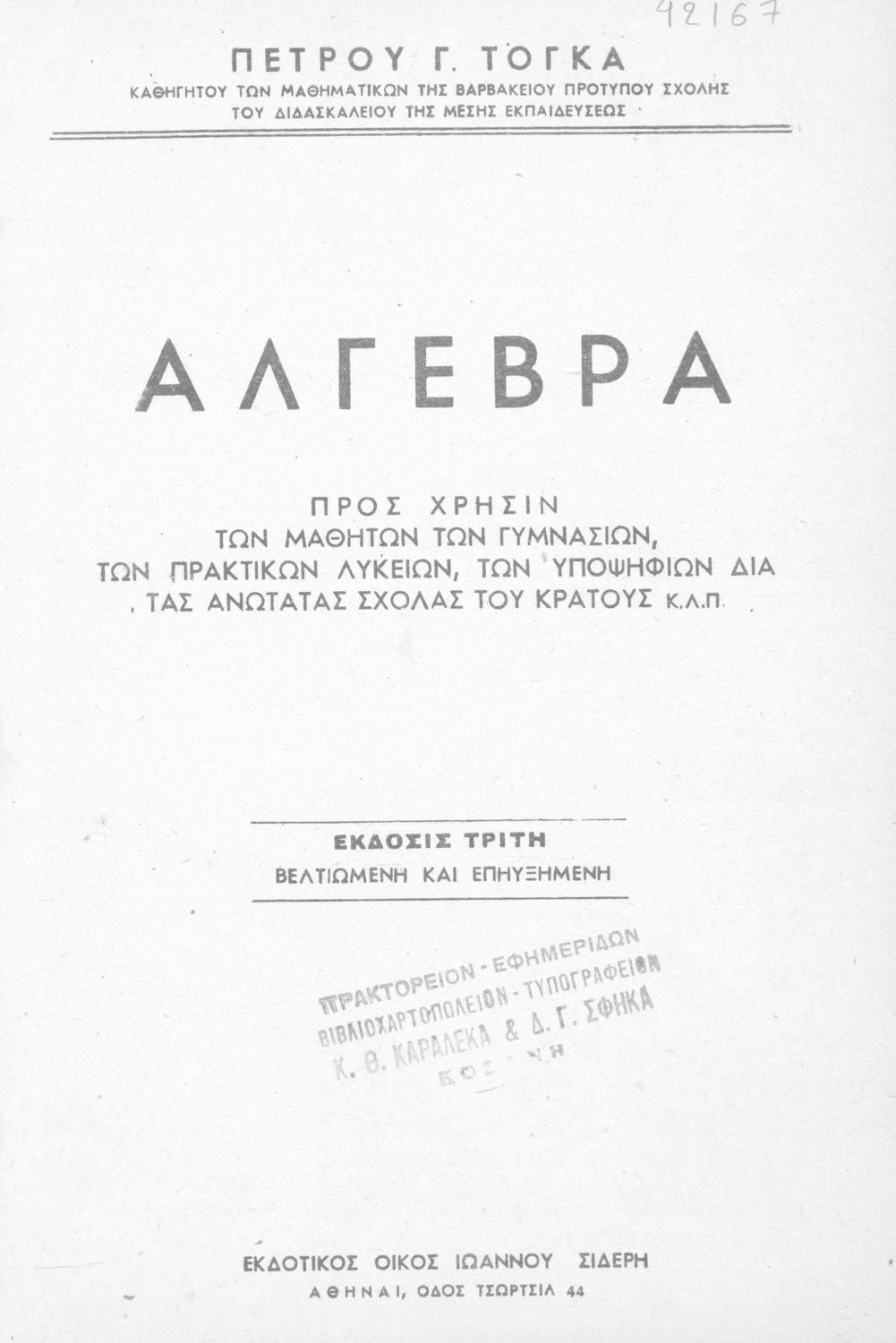 Άλγεβρα προς χρήσιν των μαθητών των Γυμνασίων, των Πρακτικών Λυκείων, των υποψηφίων δια τας ανωτάτας σχολάς του κράτους κ.λ.π.