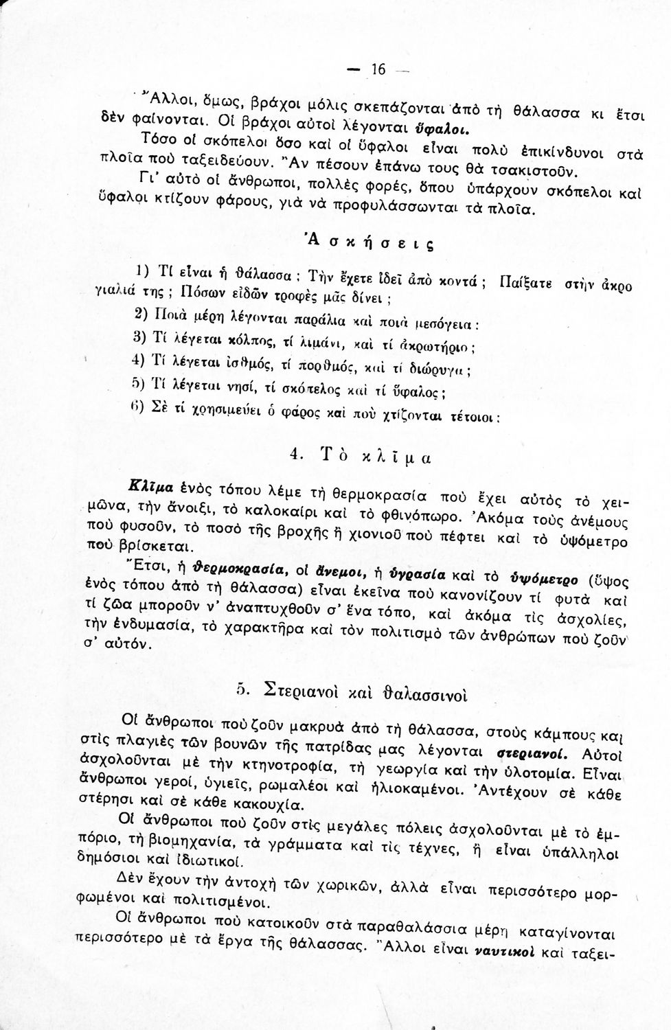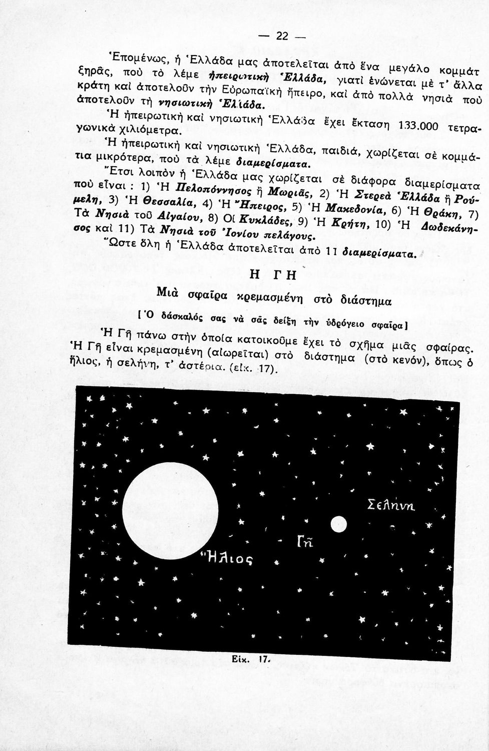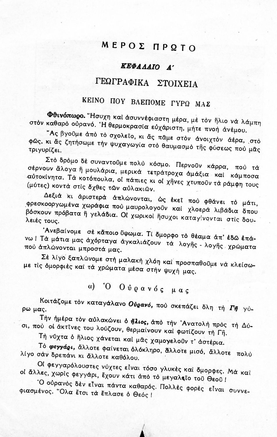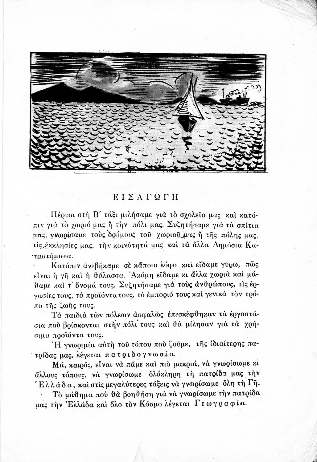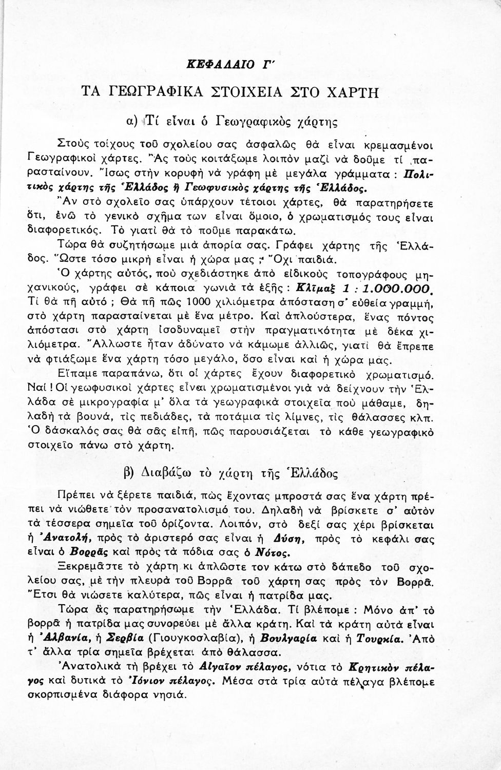 Μαθητικό βοήθημα Γεωγραφίας για τις Γ΄ και Δ΄ Δημοτικού που περιέχει εισαγωγή στη φυσική γεωγραφία και εξετάζει την Ελλάδα ανά διαμέρισμα και νομό από γεωφυσική, οικονομική και πολιτική άποψη.