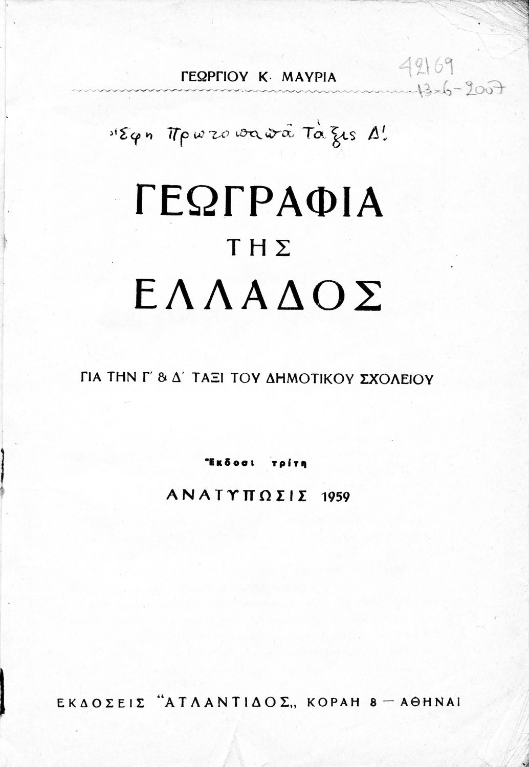 Κωδικός αναγνώρισης: 01-42169 Τίτλος: Γεωγραφία της Ελλάδος για την Γ΄ και Δ΄ τάξι του Δημοτικού Σχολείου Συγγραφέας: Γεώργιος Κ. Μαυριάς Μέγεθος και υπόστρωμα: Μαθητικό βοήθημα, 23εκ., μαλακό εξώφυλλο, 144 σελίδες. Φωτογραφίες και χάρτες (ασπρόμαυρες). |
