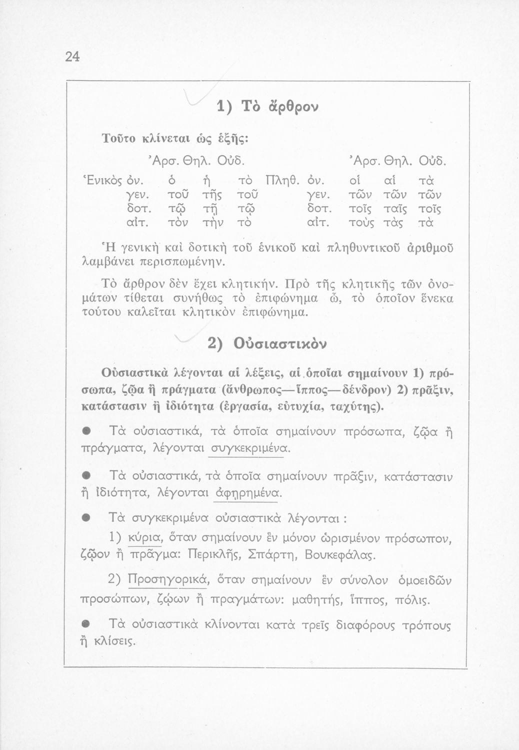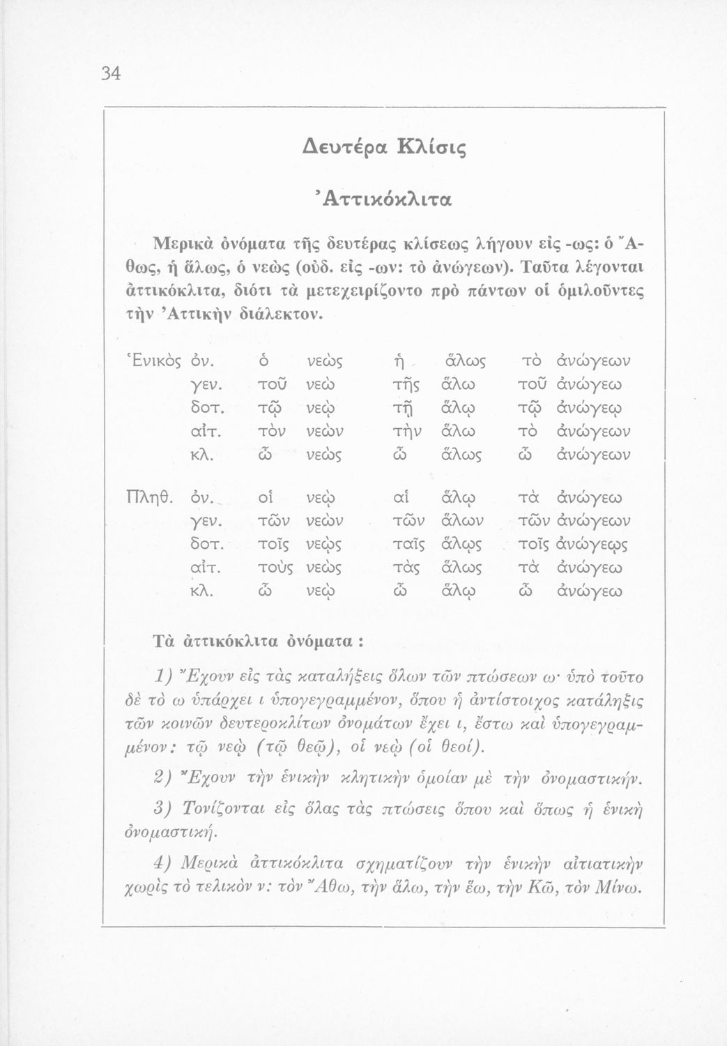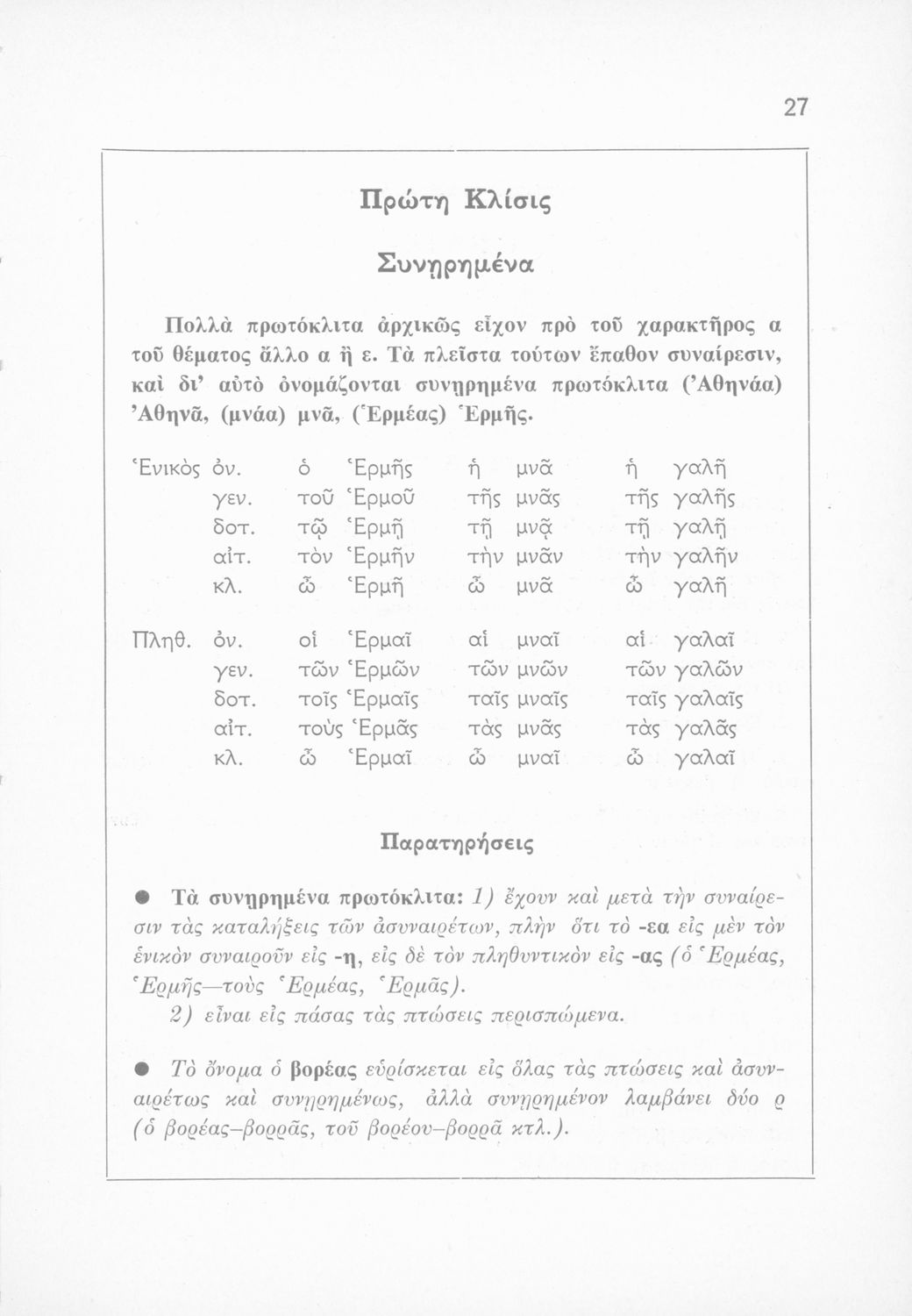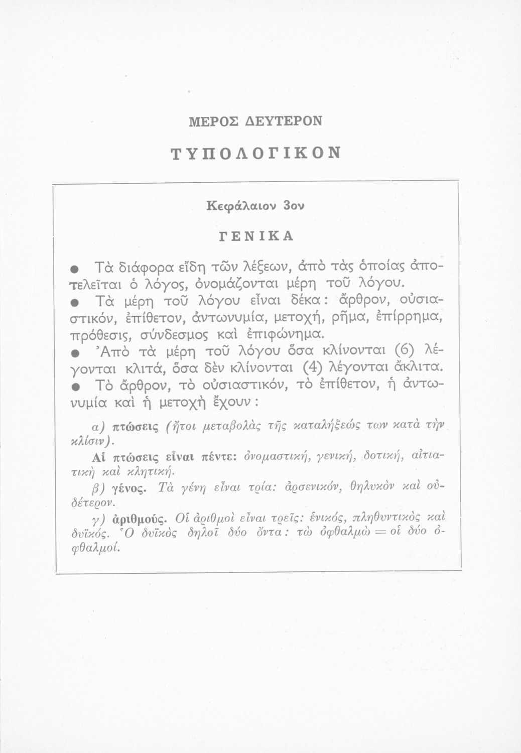 Σχολικό εγχειρίδιο Αρχαίων Ελληνικών Γυμνασίου που περιλαμβάνει τη γραμματική της αρχαίας ελληνικής και είναι χωρισμένο σε φθογγολογικό και τυπολογικό μέρος Περιέχει και κατάλογο ανωμάλων ρημάτων, ασκήσεις και