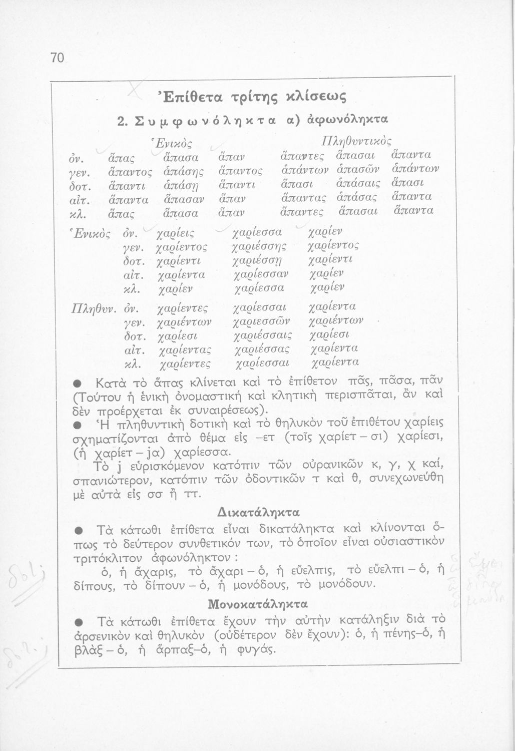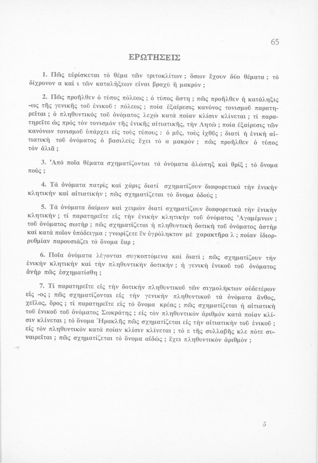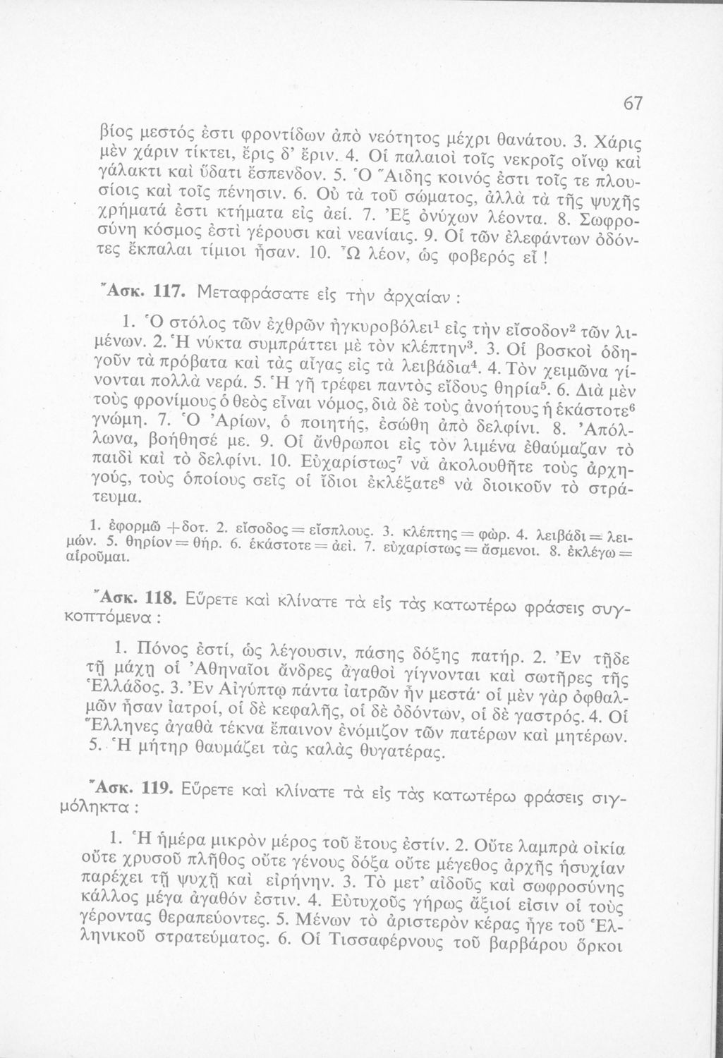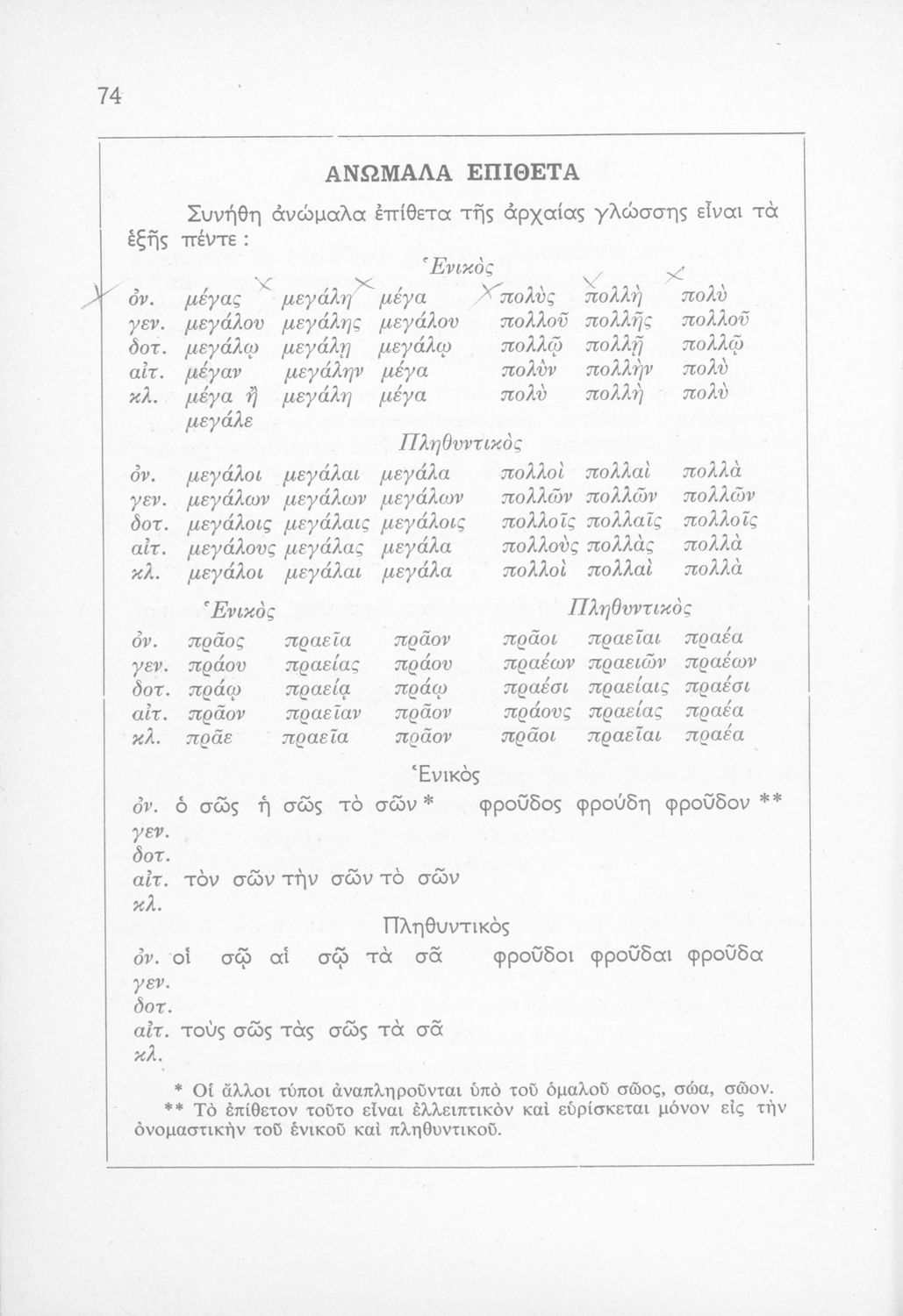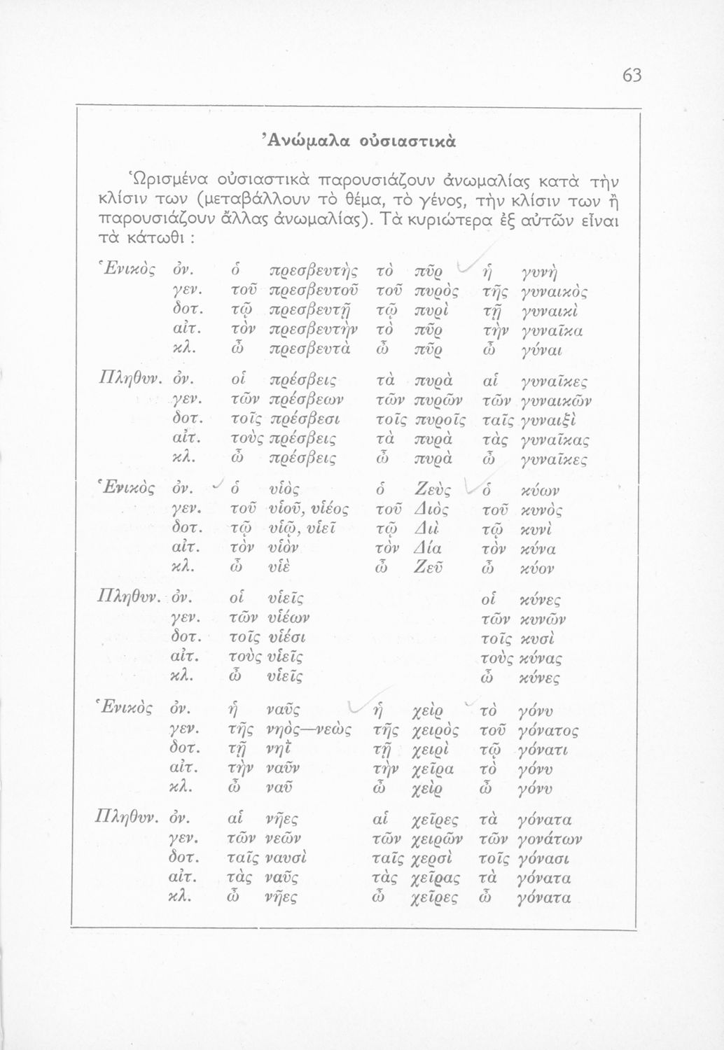 Σχολικό εγχειρίδιο Αρχαίων Ελληνικών Γυμνασίου που περιλαμβάνει τη γραμματική της αρχαίας ελληνικής και είναι χωρισμένο σε φθογγολογικό και τυπολογικό μέρος Περιέχει και κατάλογο ανωμάλων ρημάτων, ασκήσεις και