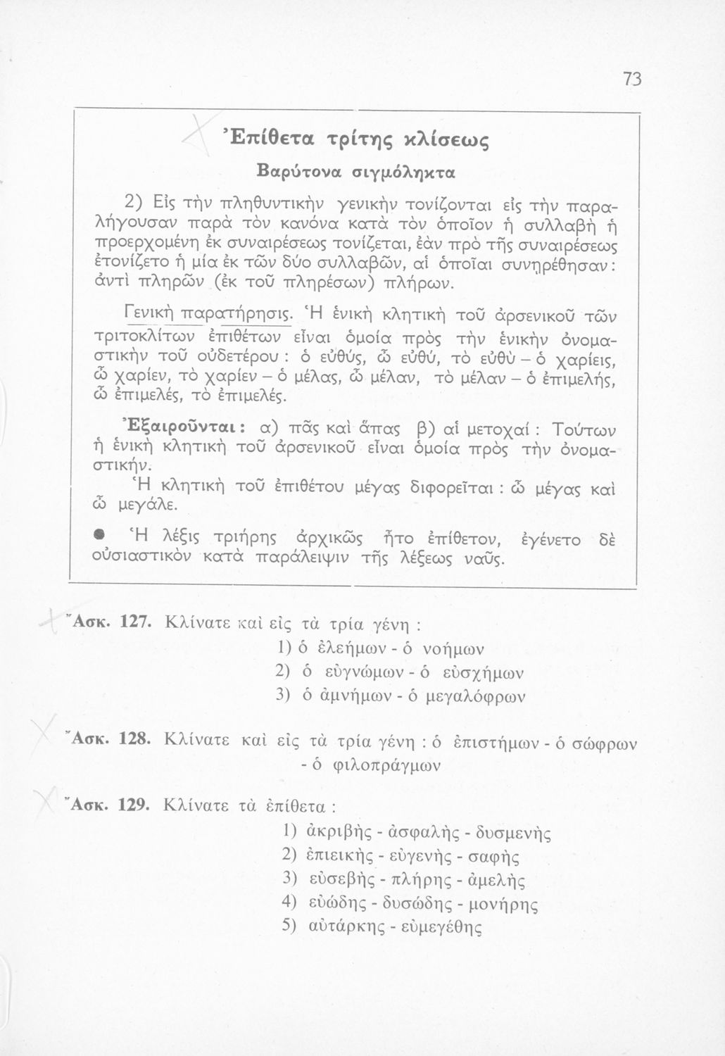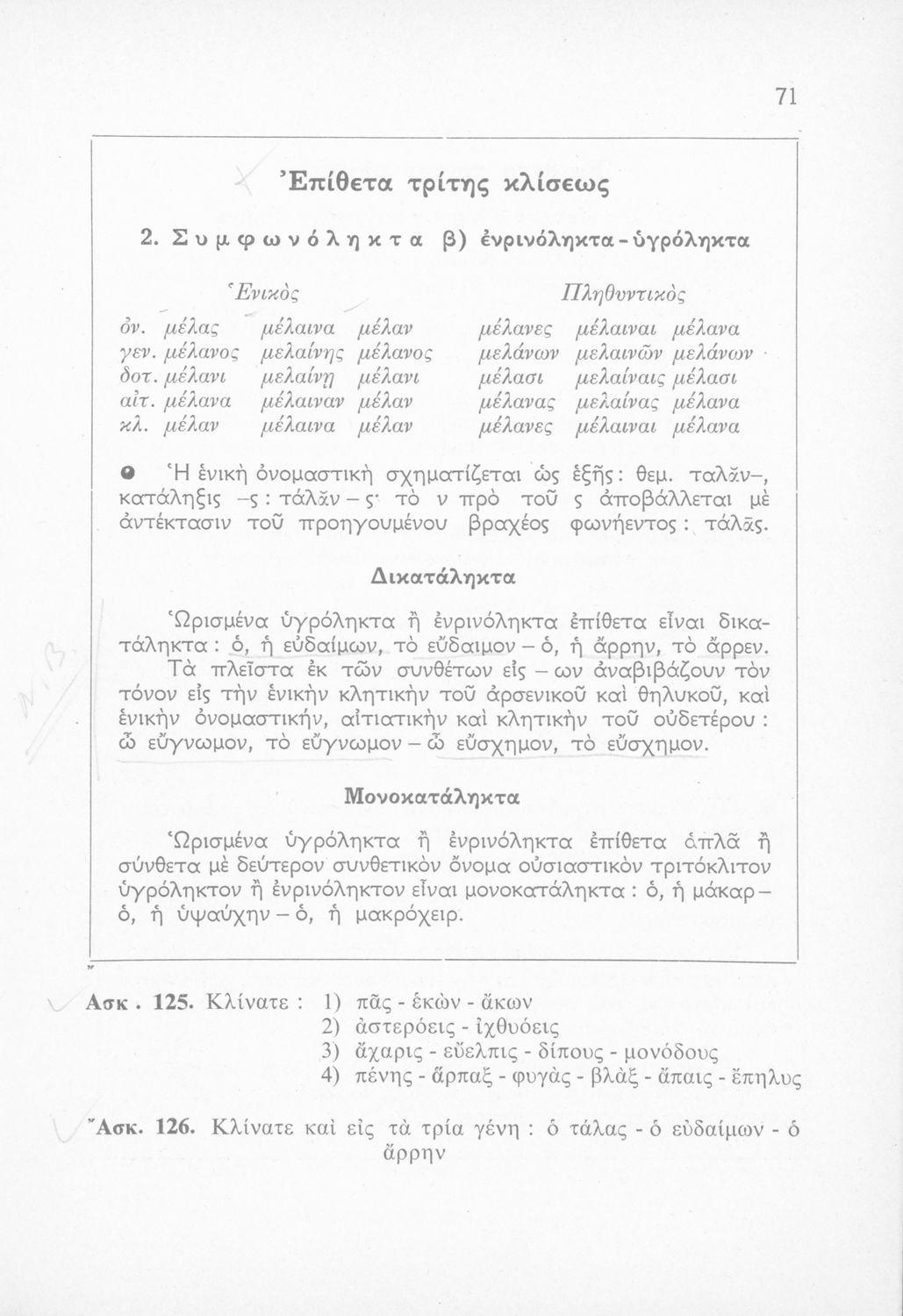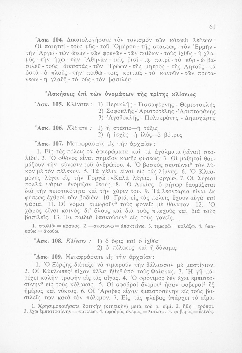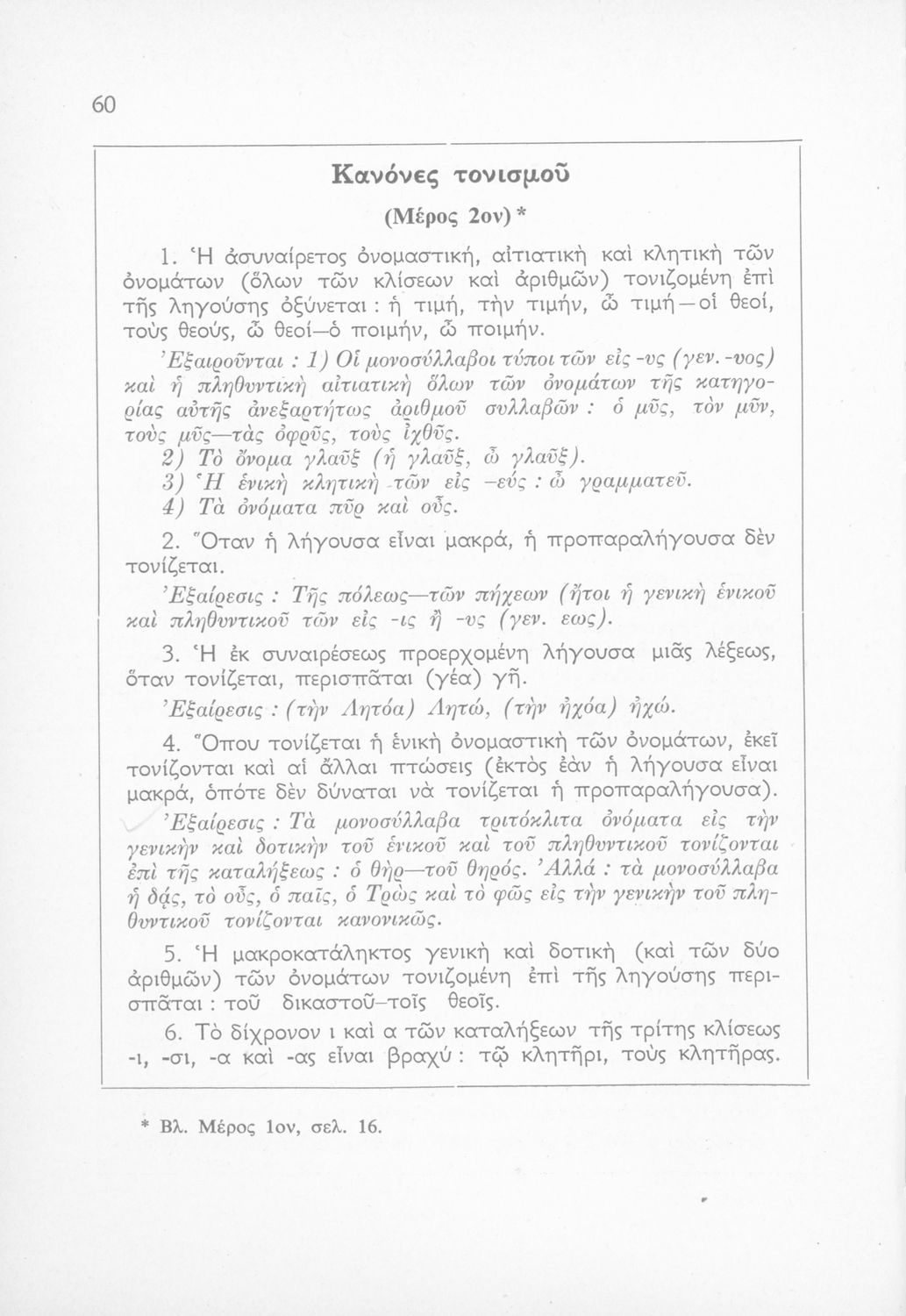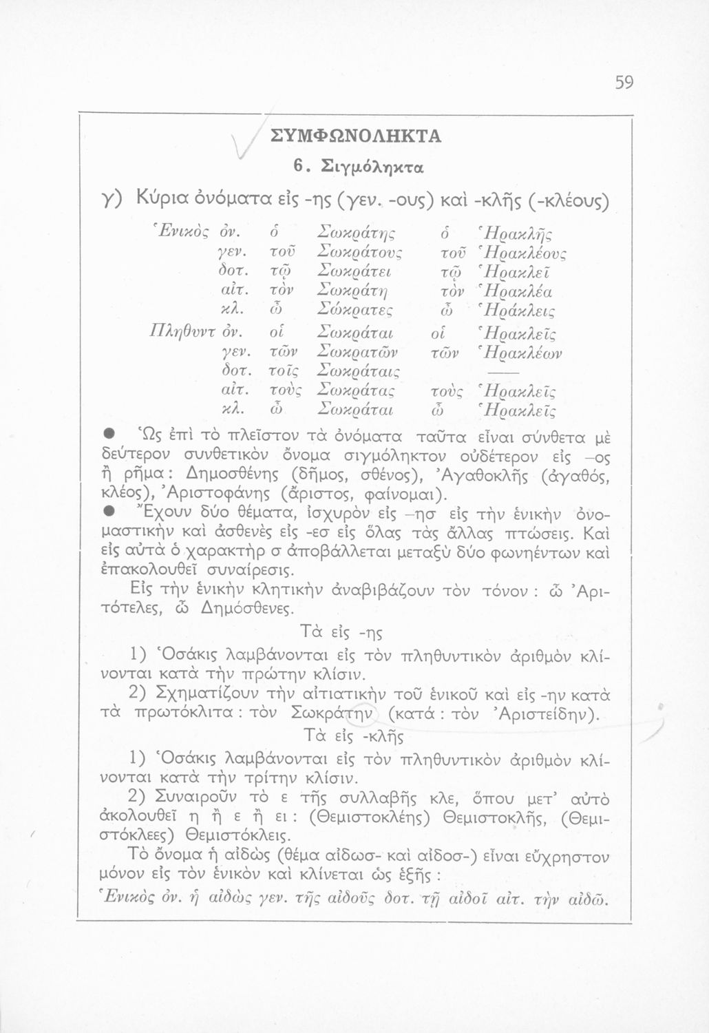 Σχολικό εγχειρίδιο Αρχαίων Ελληνικών Γυμνασίου που περιλαμβάνει τη γραμματική της αρχαίας ελληνικής και είναι χωρισμένο σε φθογγολογικό και τυπολογικό μέρος Περιέχει και κατάλογο ανωμάλων ρημάτων, ασκήσεις και