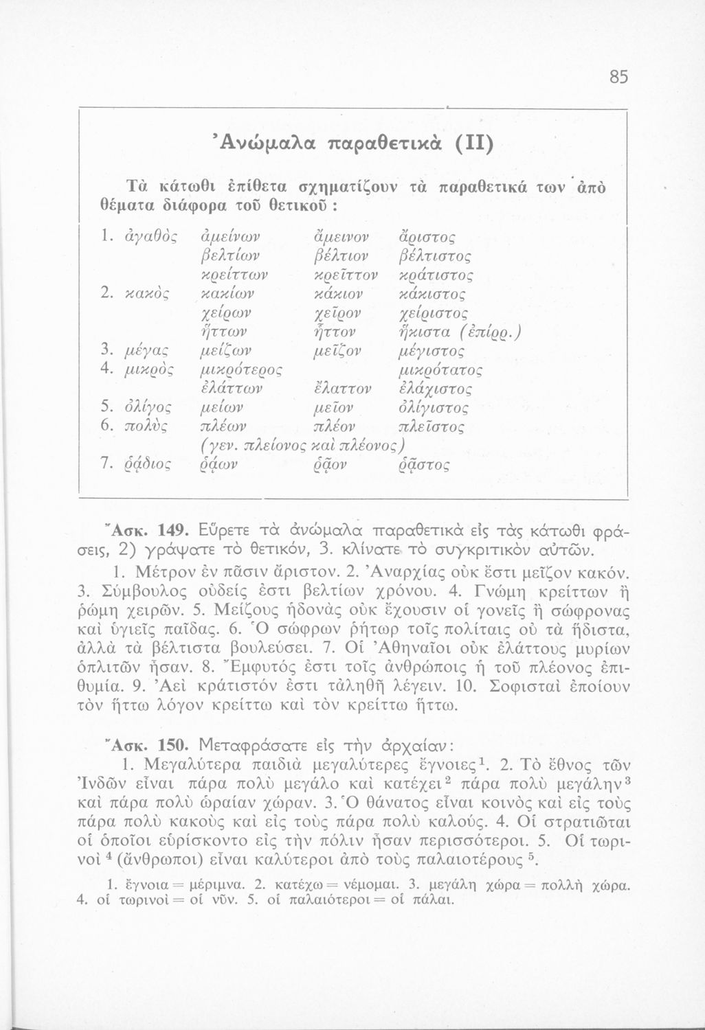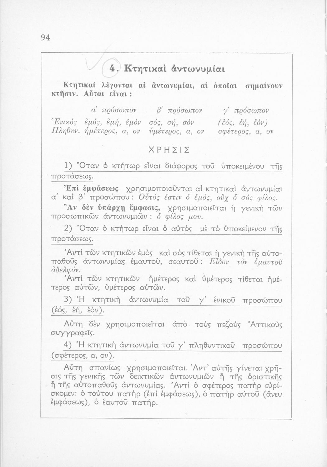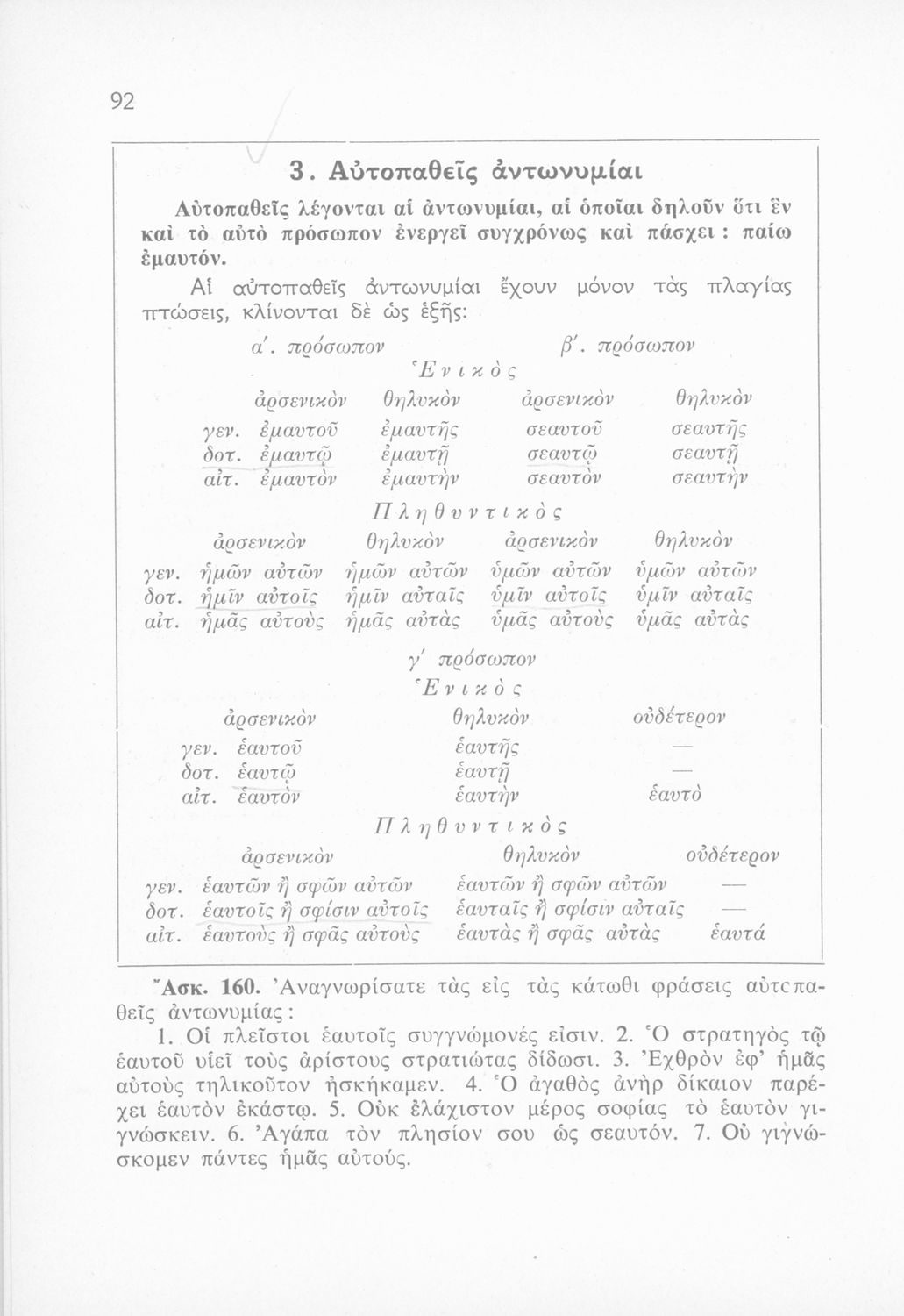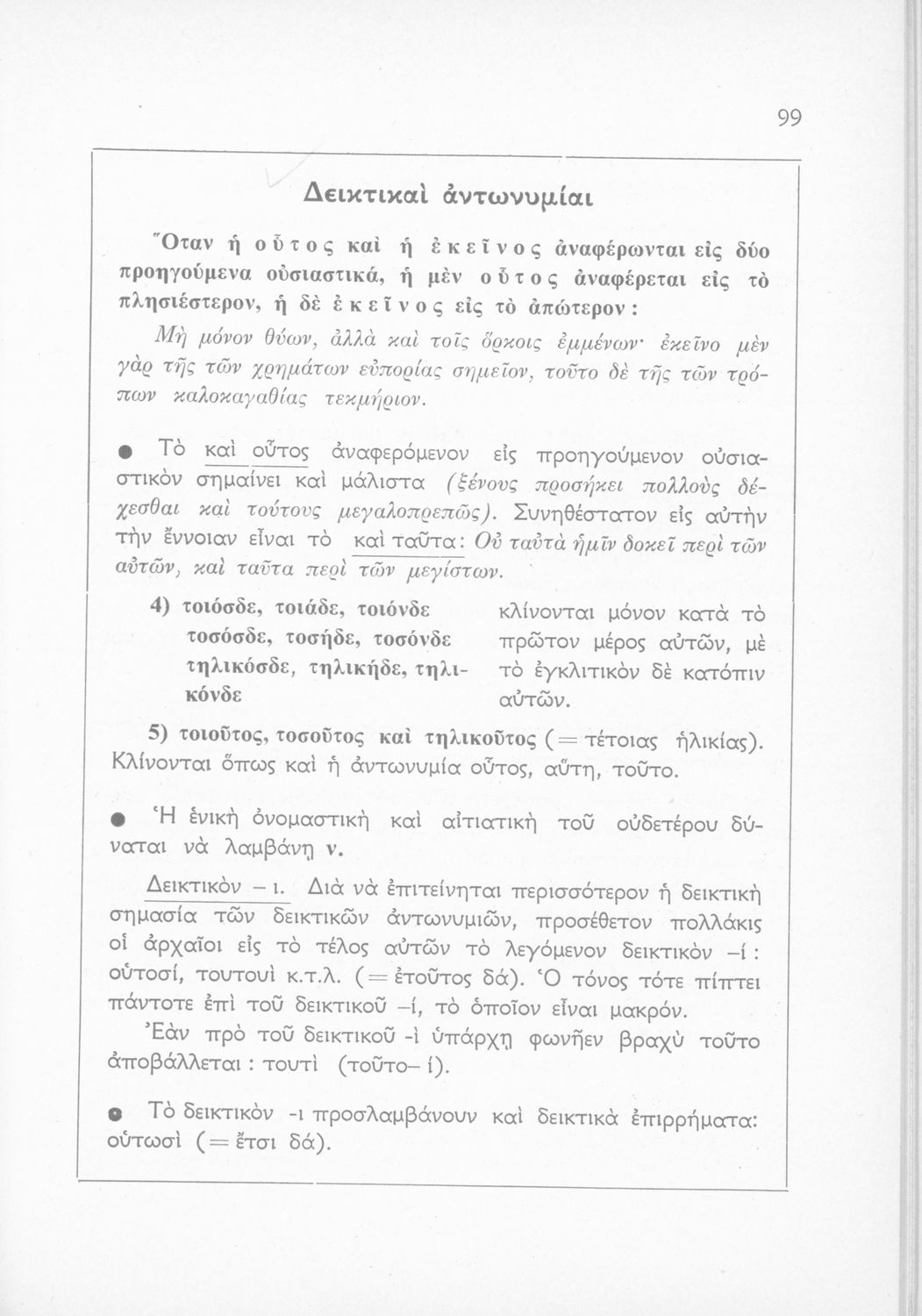 Σχολικό εγχειρίδιο Αρχαίων Ελληνικών Γυμνασίου που περιλαμβάνει τη γραμματική της αρχαίας ελληνικής και είναι χωρισμένο σε φθογγολογικό και τυπολογικό μέρος Περιέχει και κατάλογο ανωμάλων ρημάτων, ασκήσεις και