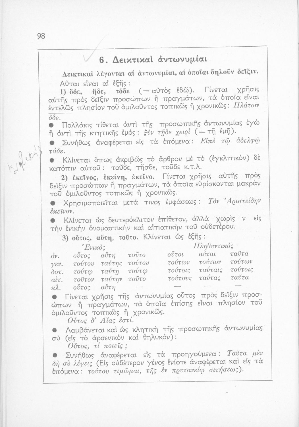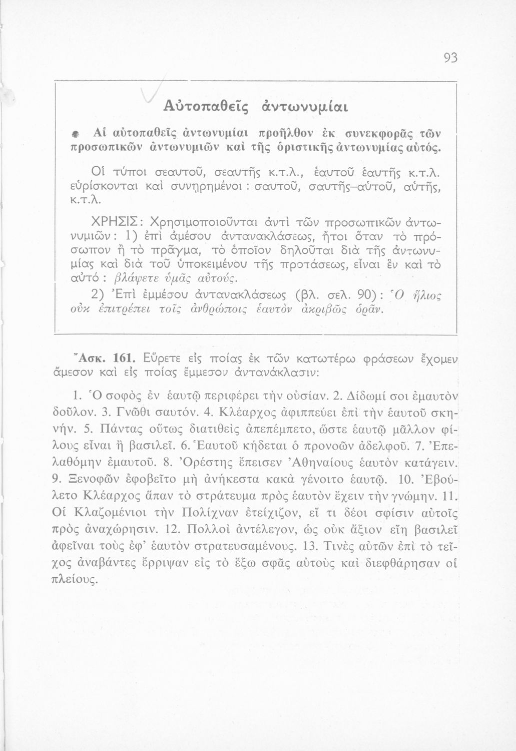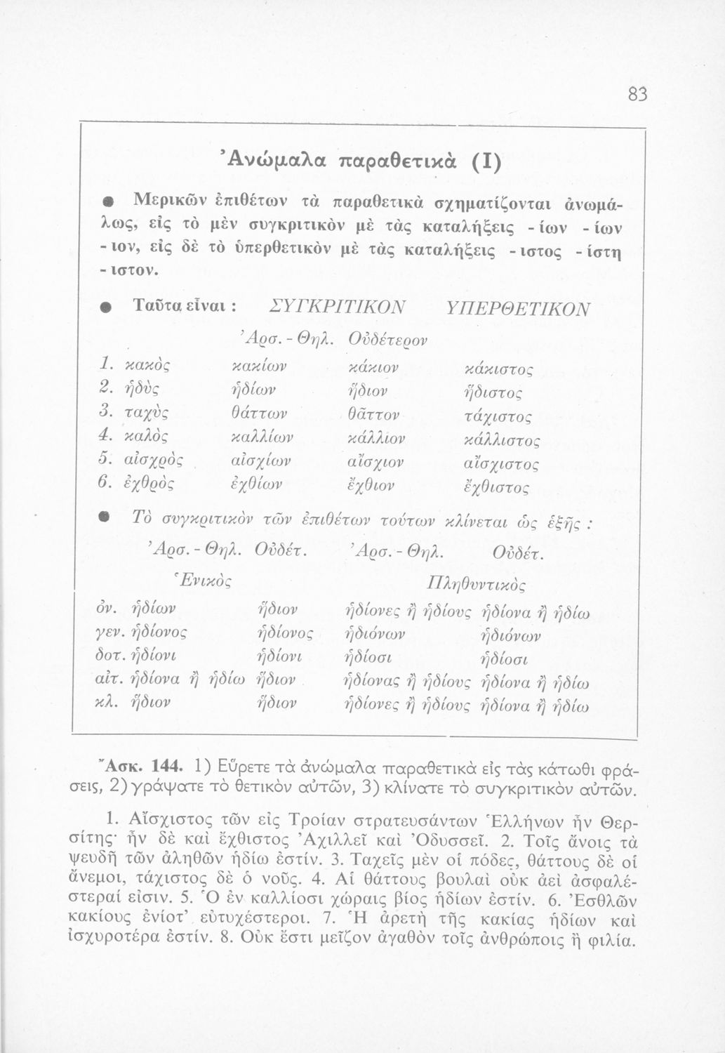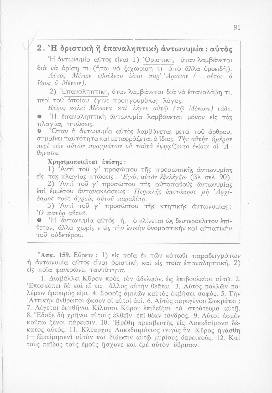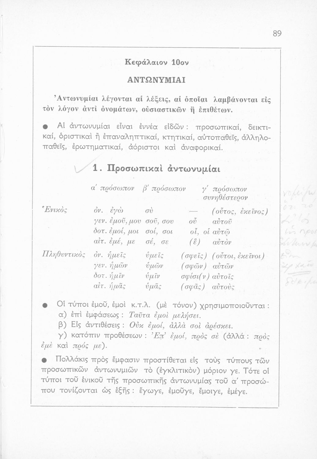 Σχολικό εγχειρίδιο Αρχαίων Ελληνικών Γυμνασίου που περιλαμβάνει τη γραμματική της αρχαίας ελληνικής και είναι χωρισμένο σε φθογγολογικό και τυπολογικό μέρος Περιέχει και κατάλογο ανωμάλων ρημάτων, ασκήσεις και