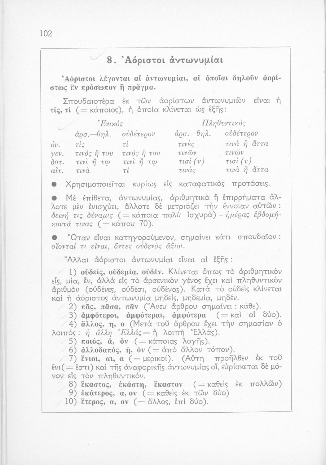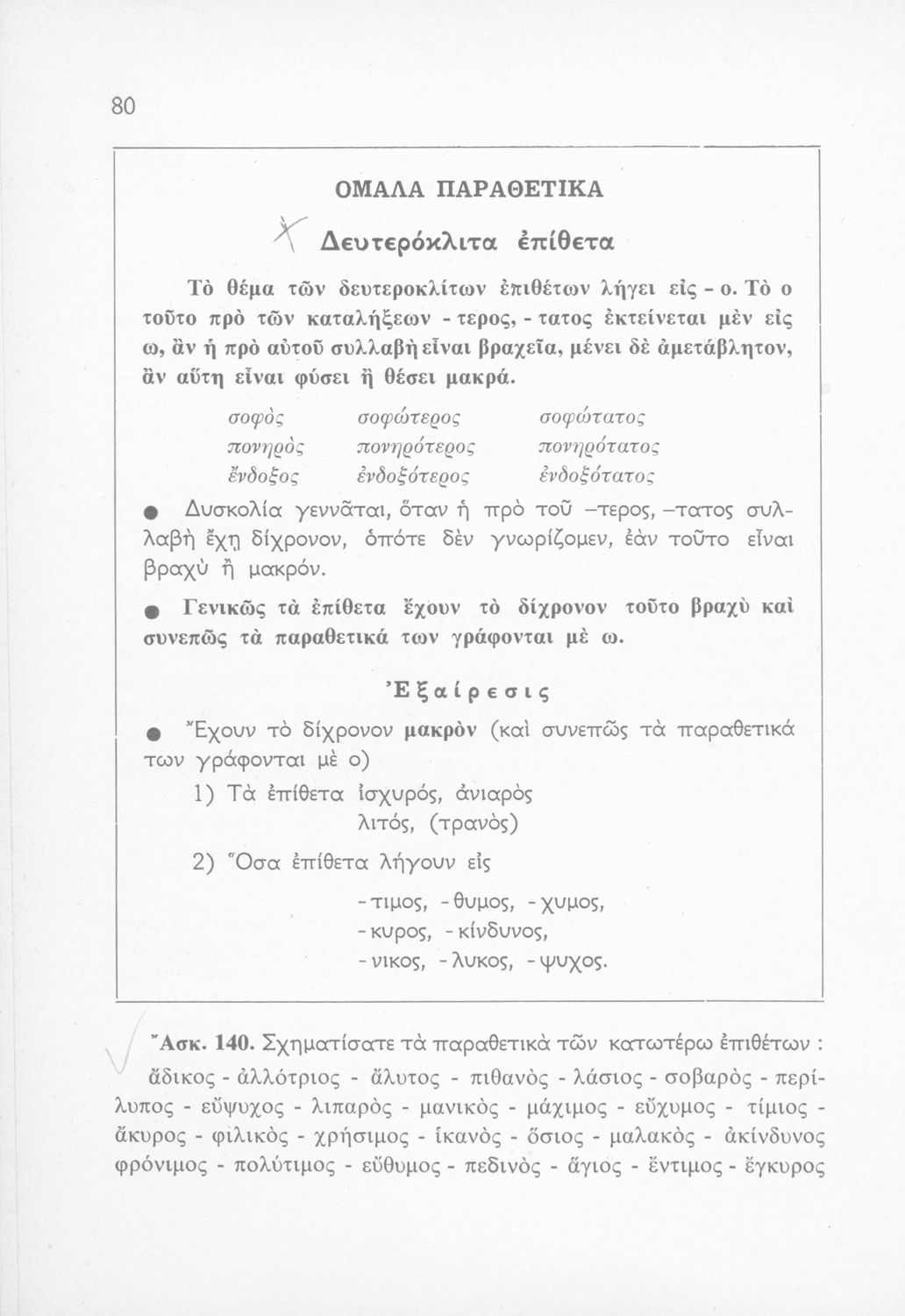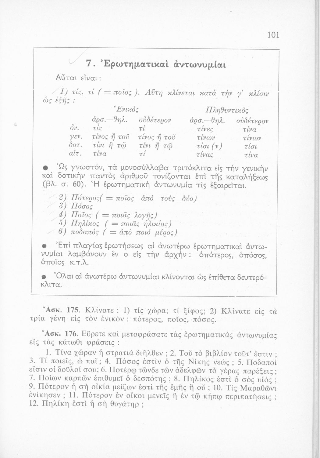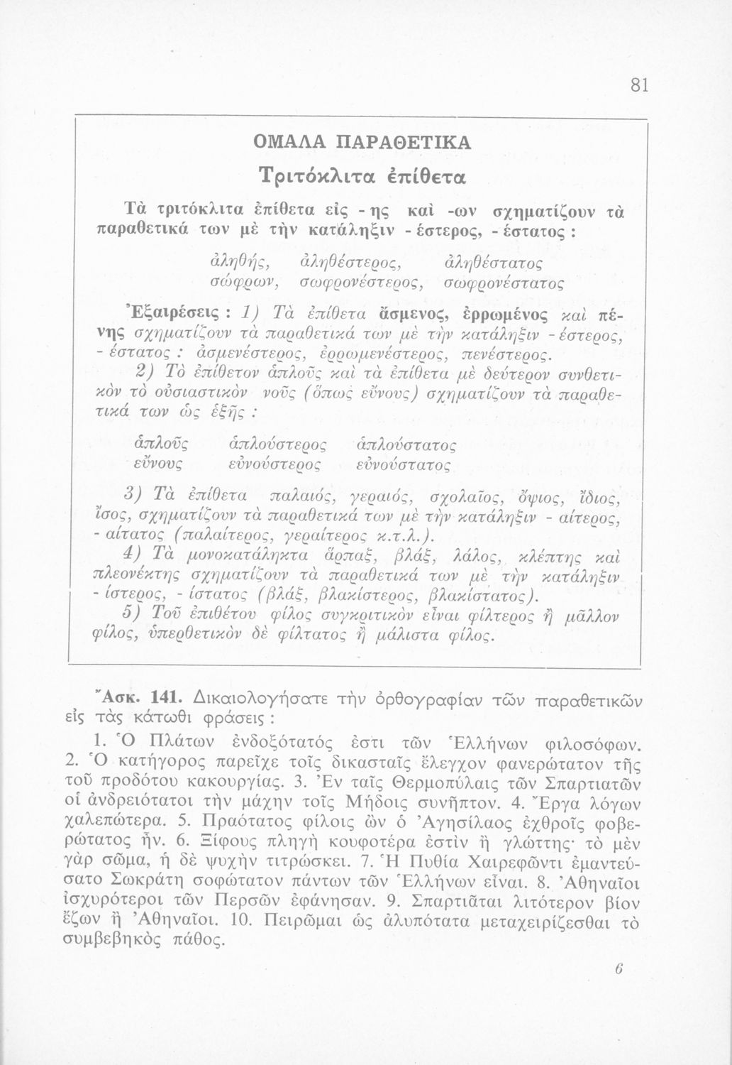 Σχολικό εγχειρίδιο Αρχαίων Ελληνικών Γυμνασίου που περιλαμβάνει τη γραμματική της αρχαίας ελληνικής και είναι χωρισμένο σε φθογγολογικό και τυπολογικό μέρος Περιέχει και κατάλογο ανωμάλων ρημάτων, ασκήσεις και