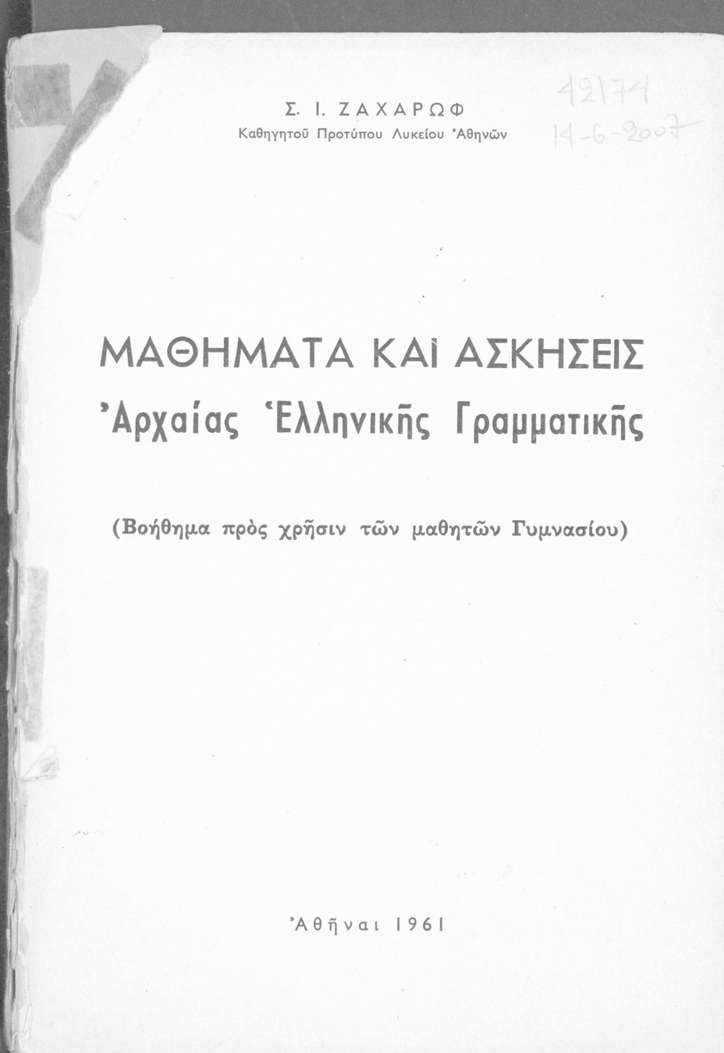 Κωδικός αναγνώρισης: 01-42174 Τίτλος: Μαθήματα και ασκήσεις αρχαίας ελληνικής γραμματικής (Βοήθημα προς χρήσιν των μαθητών Γυμνασίου) Συγγραφέας: Σ. Ι. Ζαχάρωφ Μέγεθος και υπόστρωμα: Μαθητικό βοήθημα, μαλακό εξώφυλλο, 145 σελίδες. |