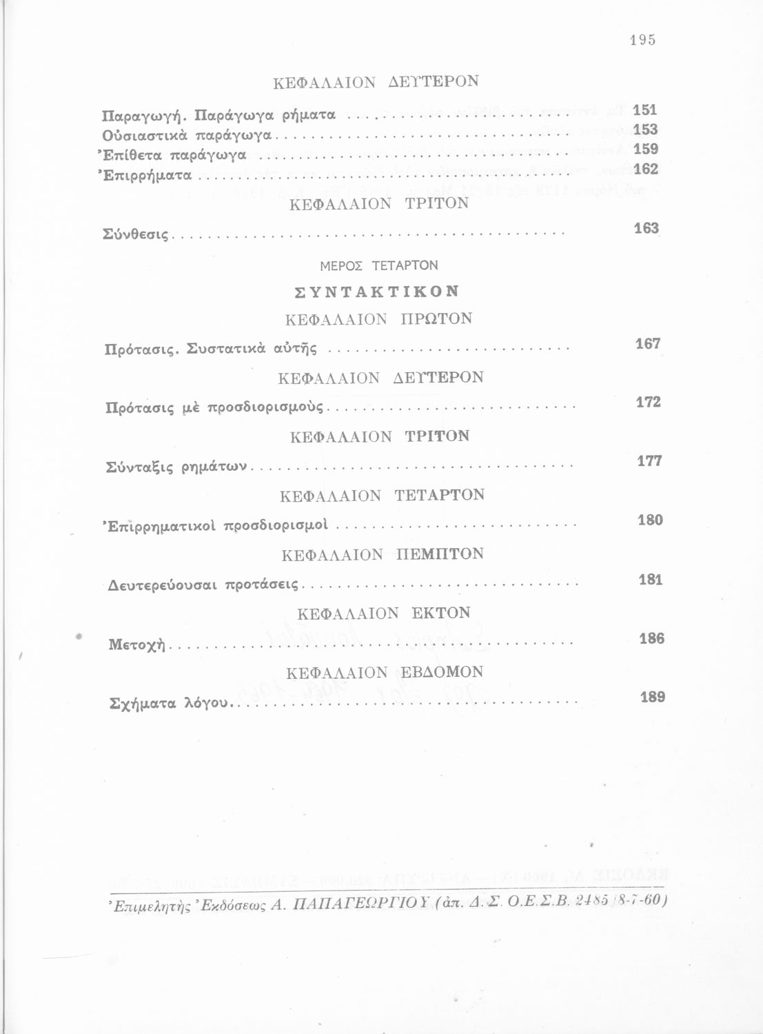 Κωδικός αναγνώρισης: 01-42175 Τίτλος: Γραμματική της ελληνικής γλώσσης προς χρήσιν των μαθητών του Δημοτικού Σχολείου Συγγραφέας: Λ. Βαμπούλης, Γ. Ζούκης Μέγεθος και υπόστρωμα: Σχολικό εγχειρίδιο, 20εκ., σκληρό εξώφυλλο, 196 σελίδες. |