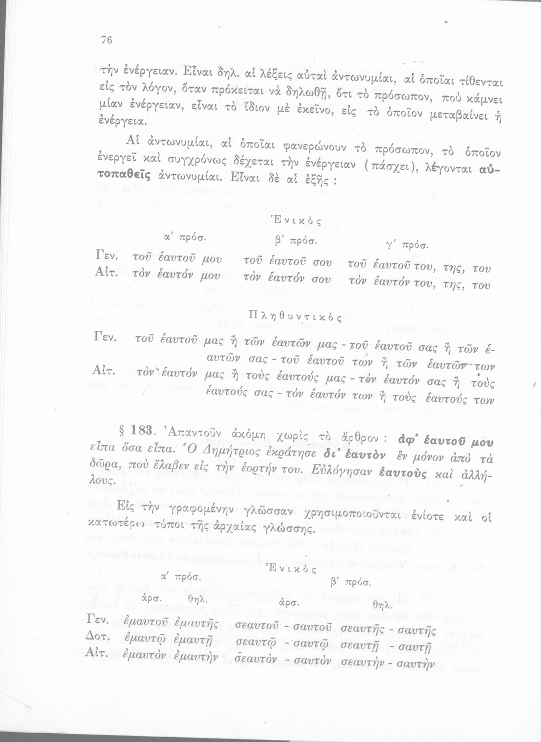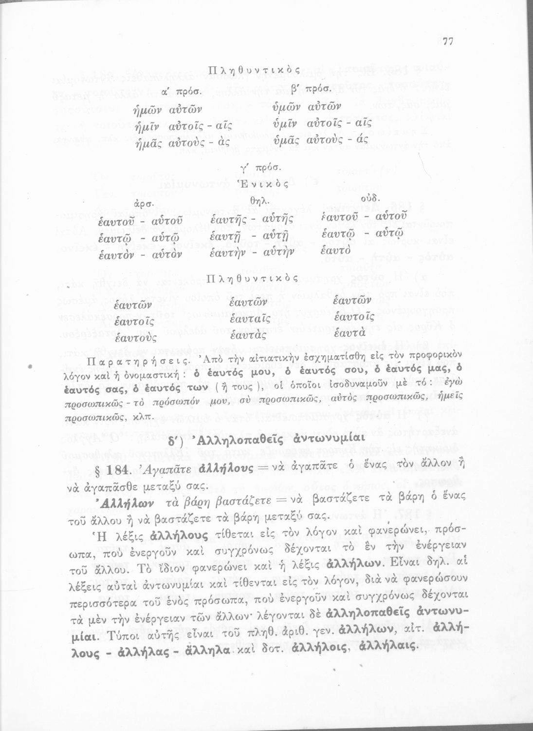 Σχολικό εγχειρίδιο Γλώσσας Δημοτικού που περιλαμβάνει γραμματική και συντακτικό και είναι χωρισμένο σε φθογγολογικό, τυπολογικό και ετυμολογικό μέρος. Φέρει το σύμβολο της δικτατορίας.