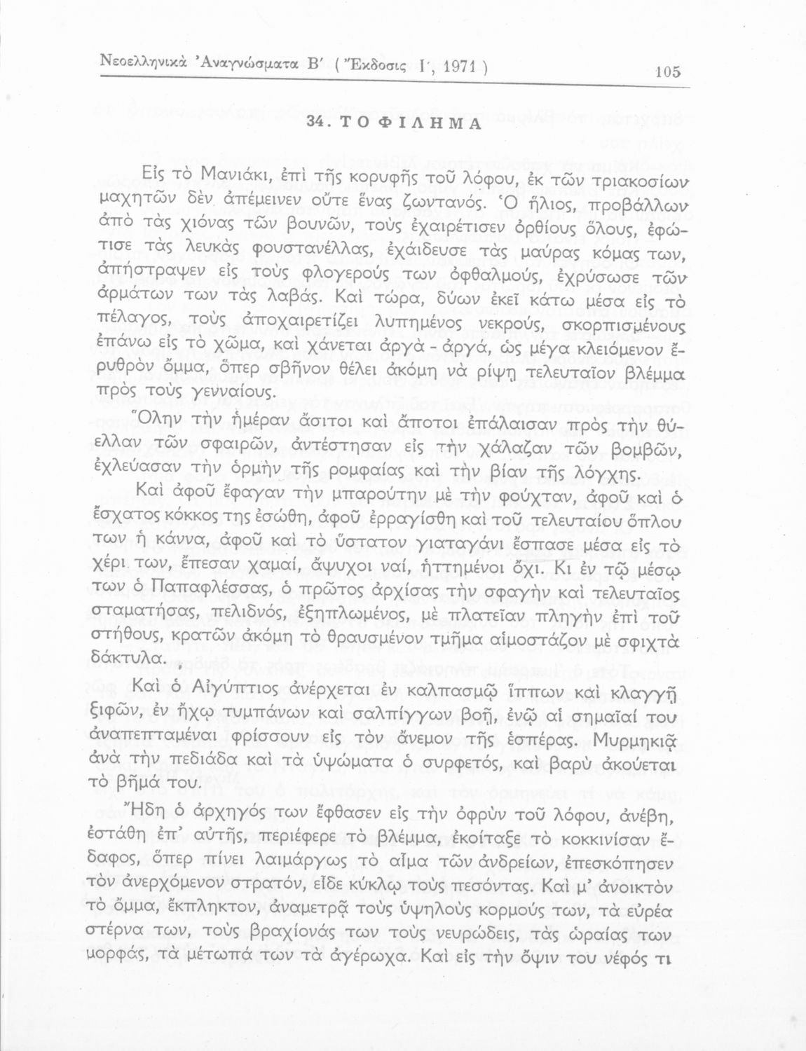 Παρουσίαση περιεχομένου: Σχολικό εγχειρίδιο Νέων Ελληνικών Β' Γυμνασίου που περιέχει ποιήματα και πεζά Ελλήνων συγγραφέων εμπνευσμένα από τη θρησκευτική, εθνική, οικογενειακή και κοινωνική ζωή και την ελληνική φύση. Περιέχει παράρτημα με βιογραφίες των συγγραφέων και λεξιλόγιο. Φέρει το σύμβολο της δικτατορίας.