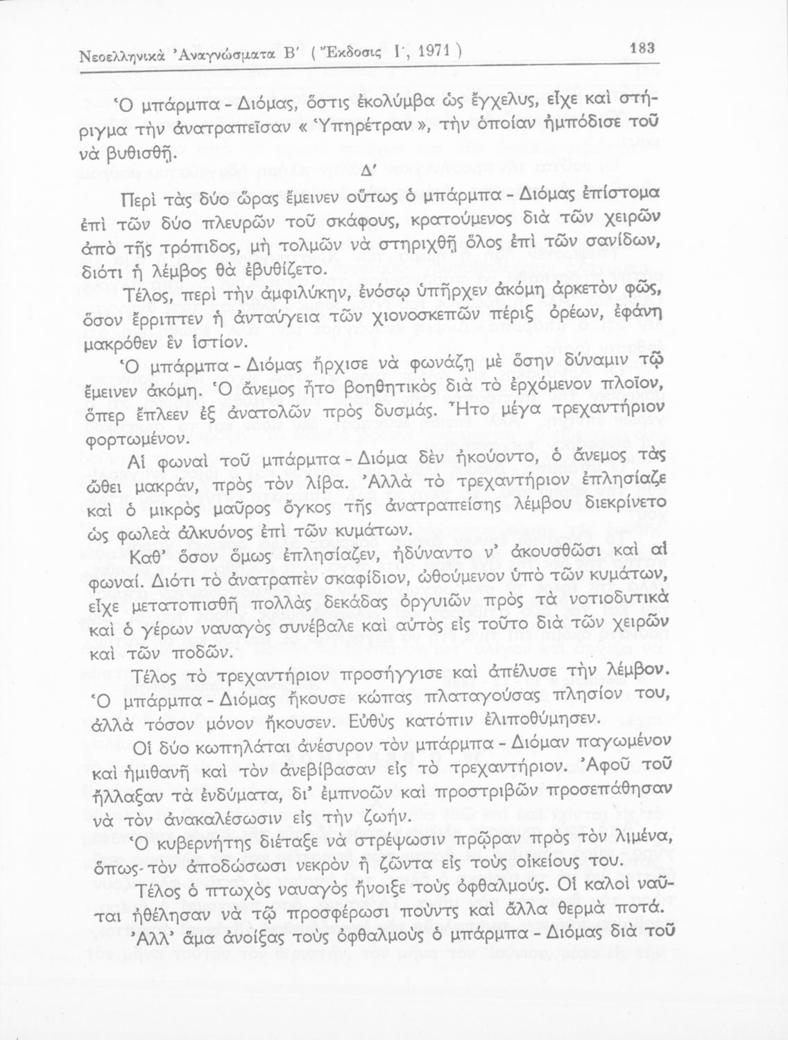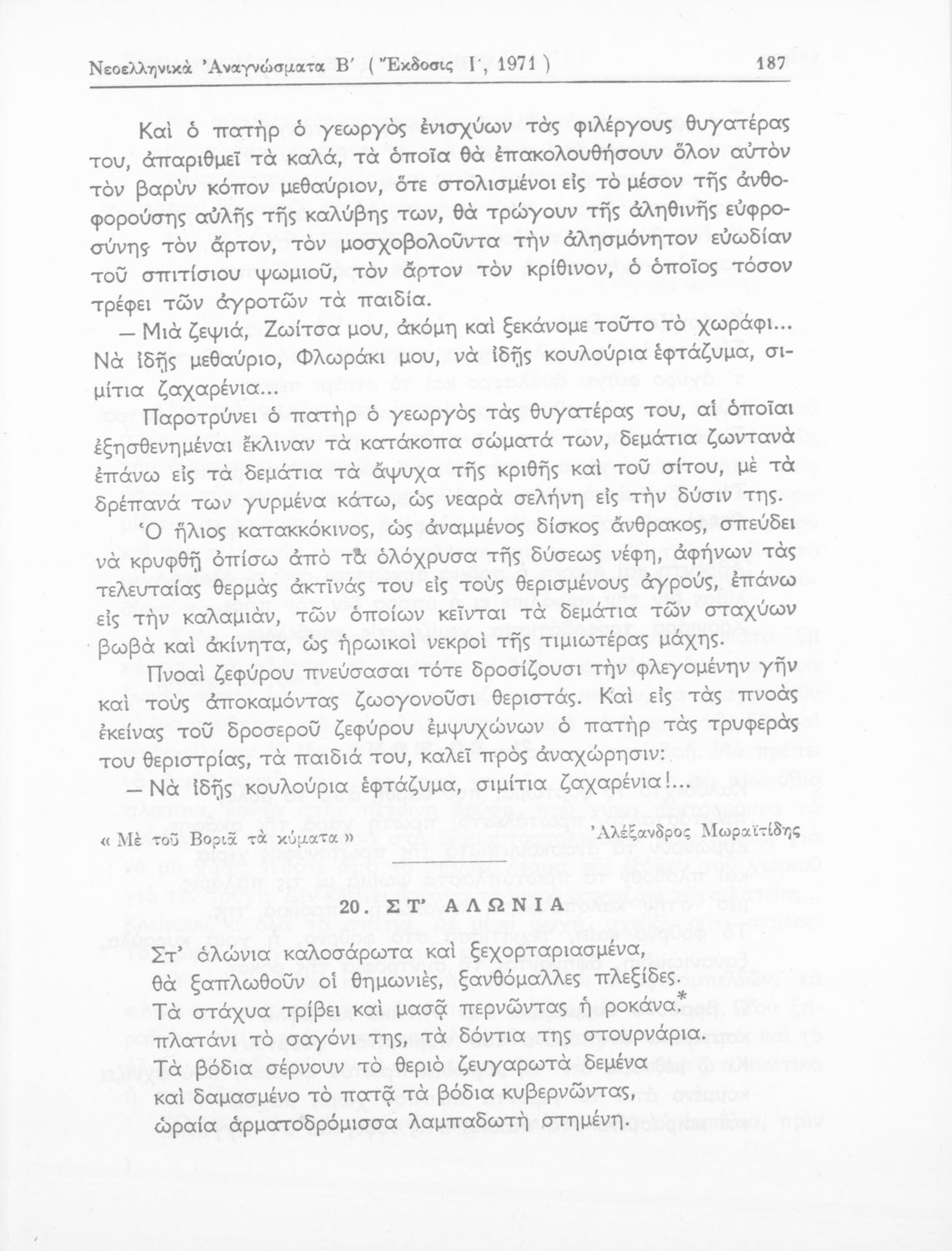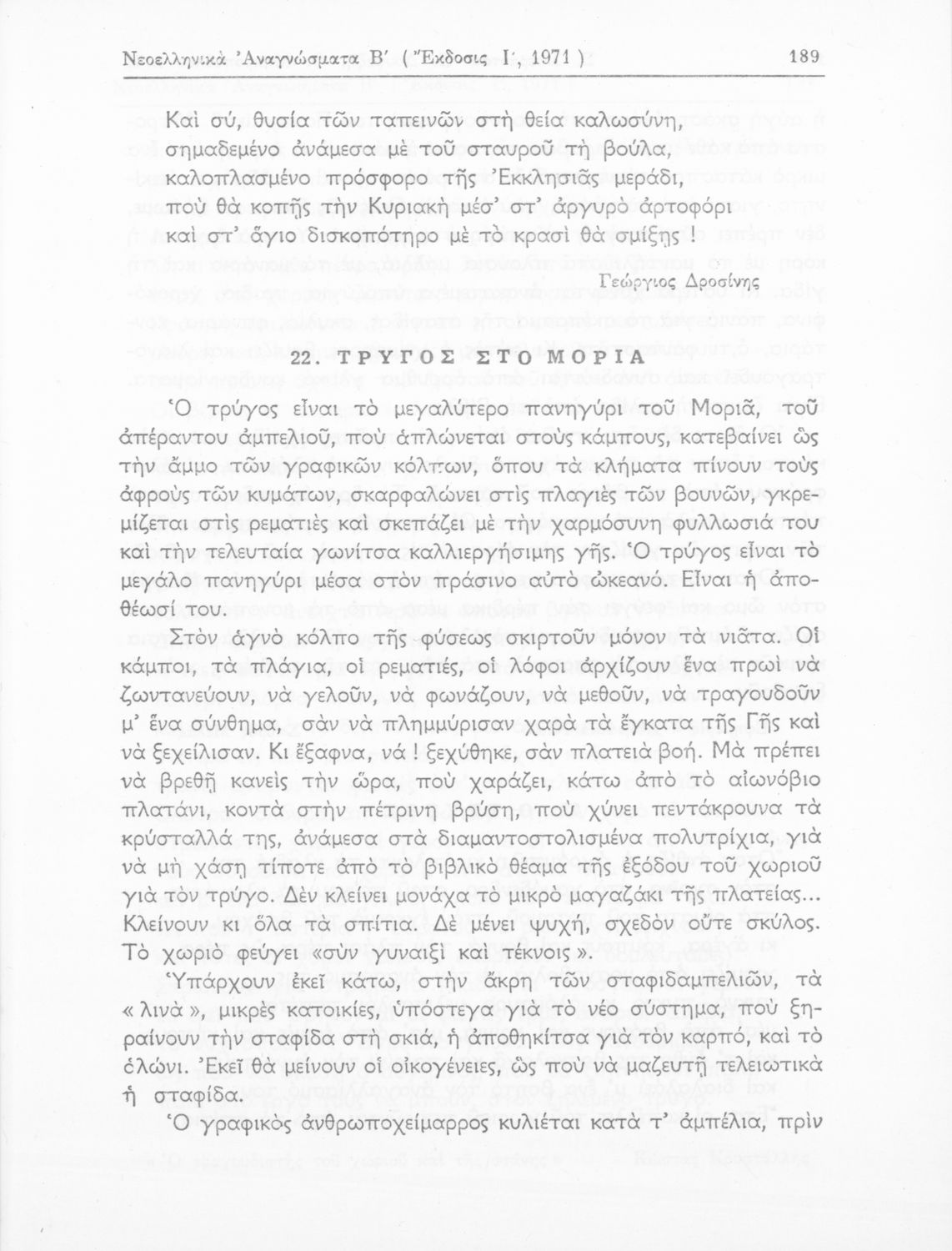 Σχολικό εγχειρίδιο Νέων Ελληνικών Β' Γυμνασίου που περιέχει ποιήματα και πεζά Ελλήνων συγγραφέων εμπνευσμένα από τη θρησκευτική, εθνική, οικογενειακή και κοινωνική ζωή και την ελληνική φύση. Περιέχει παράρτημα με βιογραφίες των συγγραφέων και λεξιλόγιο. Φέρει το σύμβολο της δικτατορίας.