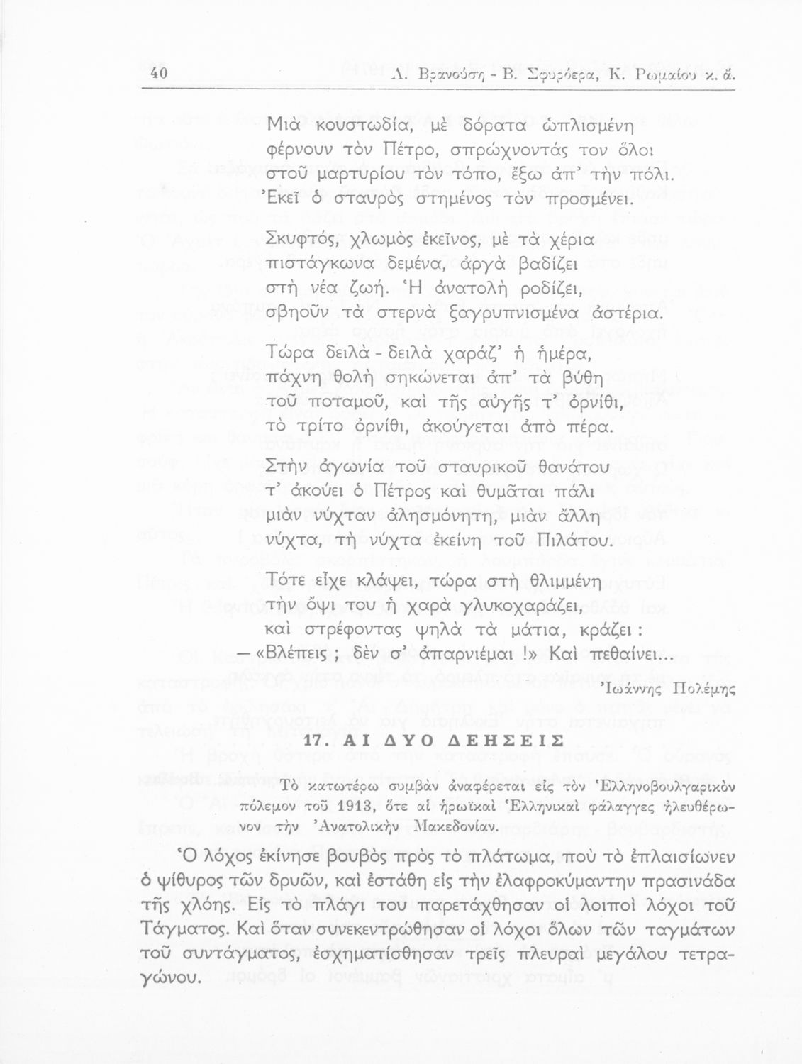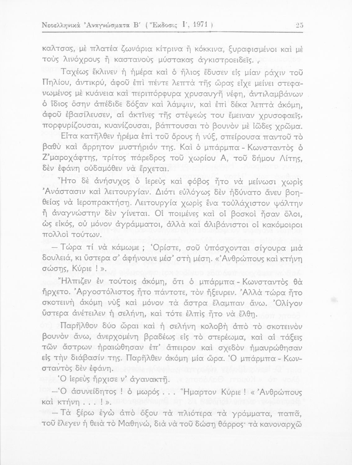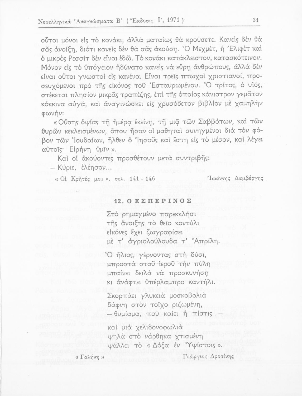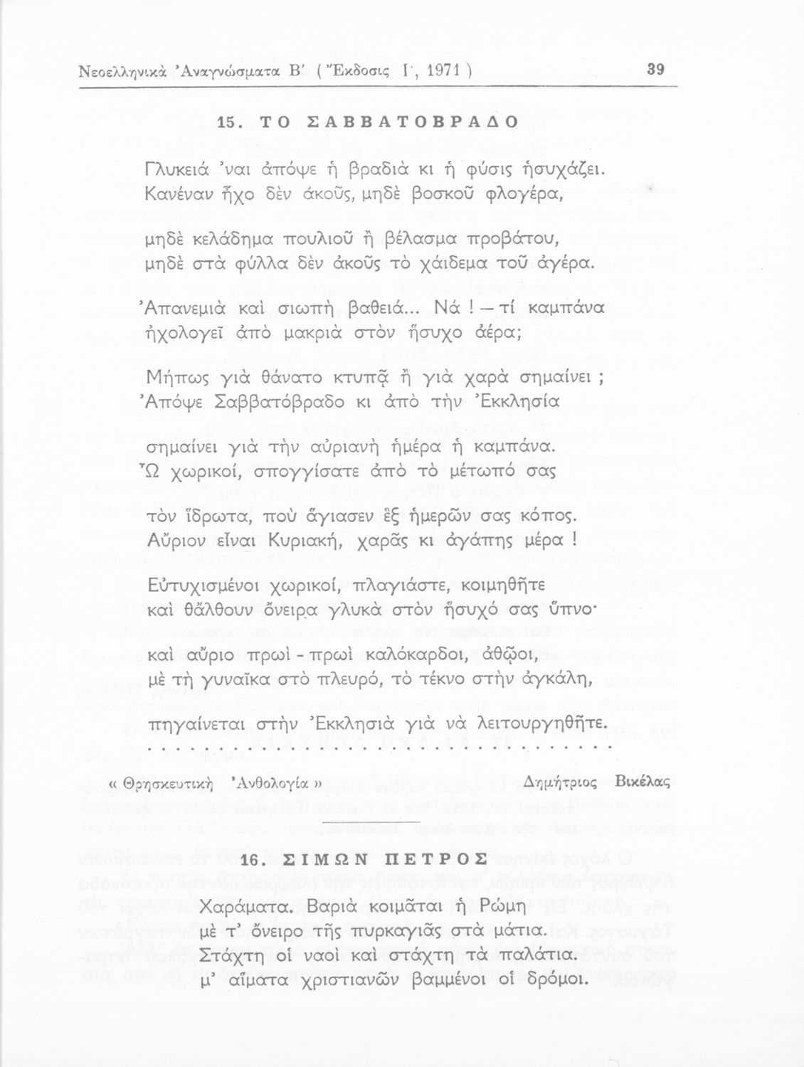 Σχολικό εγχειρίδιο Νέων Ελληνικών Β' Γυμνασίου που περιέχει ποιήματα και πεζά Ελλήνων συγγραφέων εμπνευσμένα από τη θρησκευτική, εθνική, οικογενειακή και κοινωνική ζωή και την ελληνική φύση. Περιέχει παράρτημα με βιογραφίες των συγγραφέων και λεξιλόγιο. Φέρει το σύμβολο της δικτατορίας.