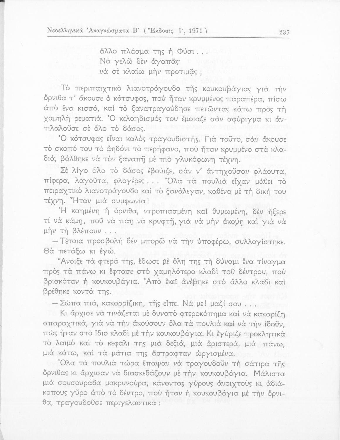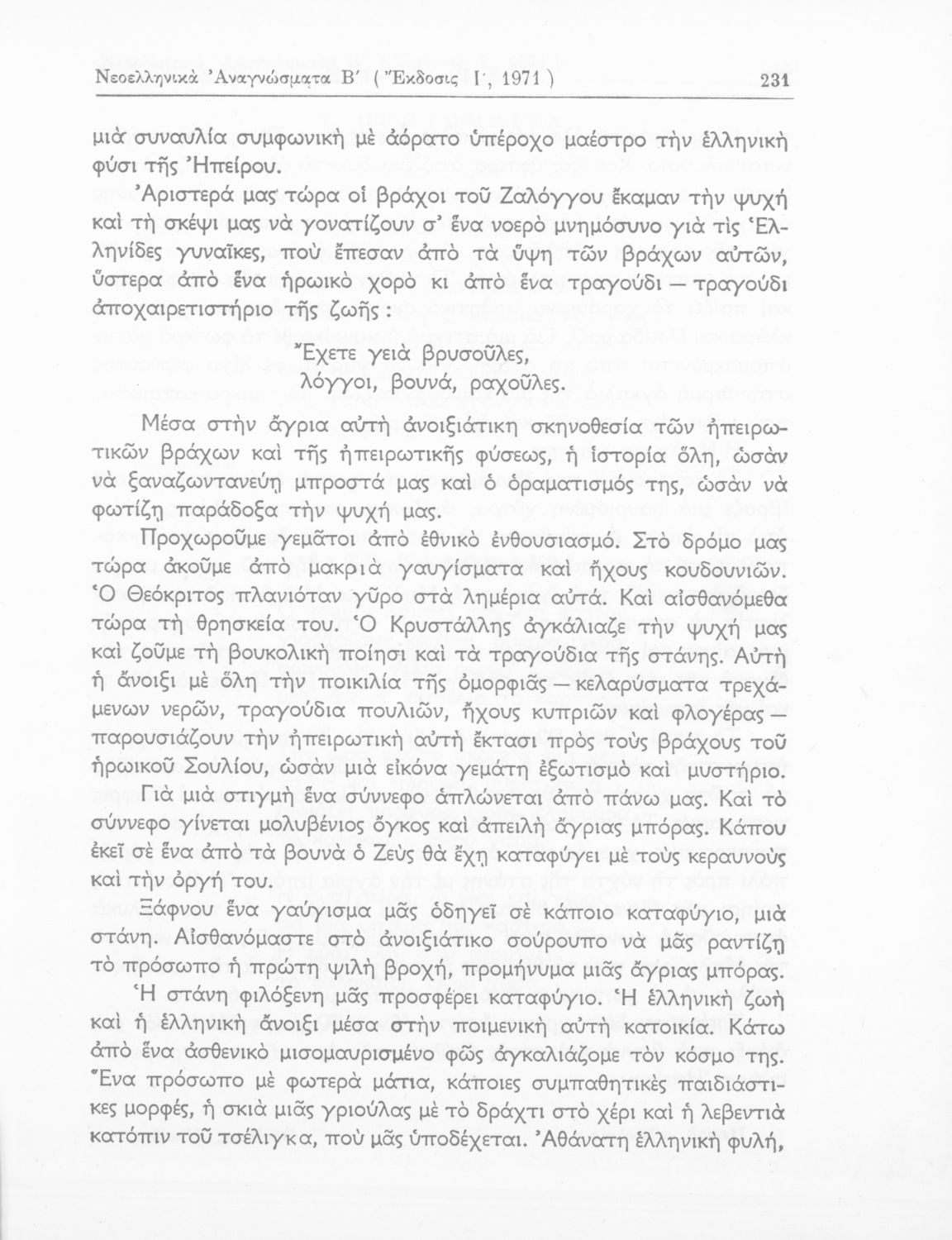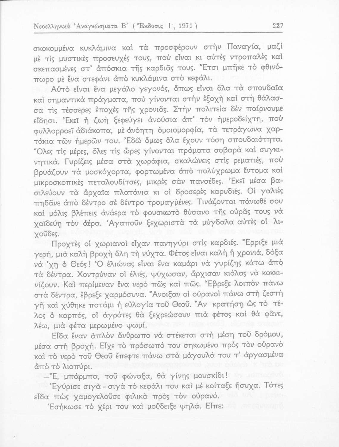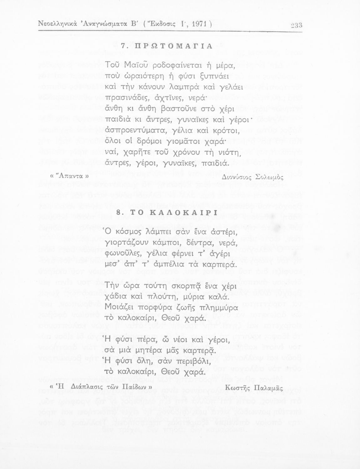 Σχολικό εγχειρίδιο Νέων Ελληνικών Β' Γυμνασίου που περιέχει ποιήματα και πεζά Ελλήνων συγγραφέων εμπνευσμένα από τη θρησκευτική, εθνική, οικογενειακή και κοινωνική ζωή και την ελληνική φύση. Περιέχει παράρτημα με βιογραφίες των συγγραφέων και λεξιλόγιο. Φέρει το σύμβολο της δικτατορίας.
