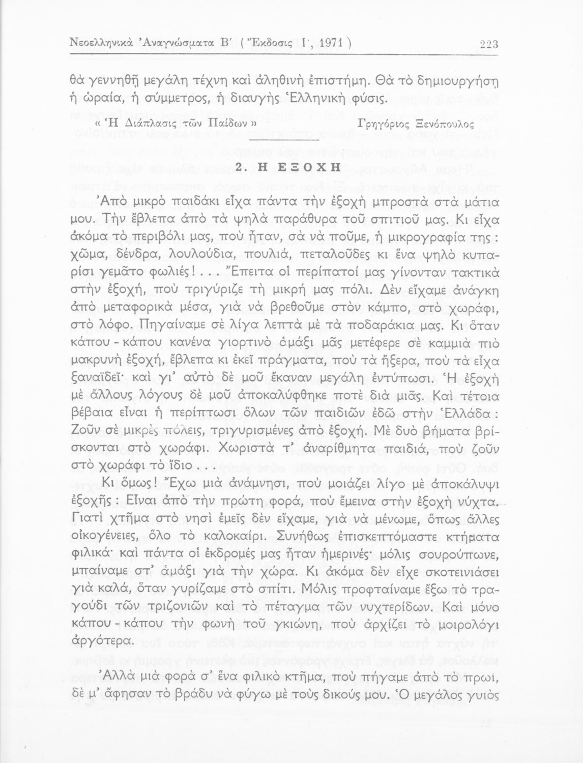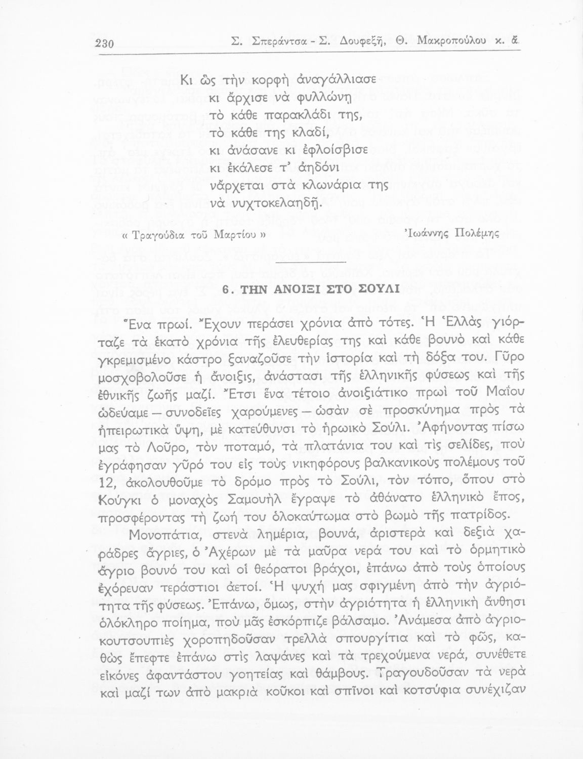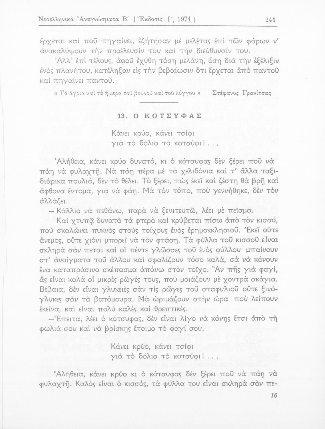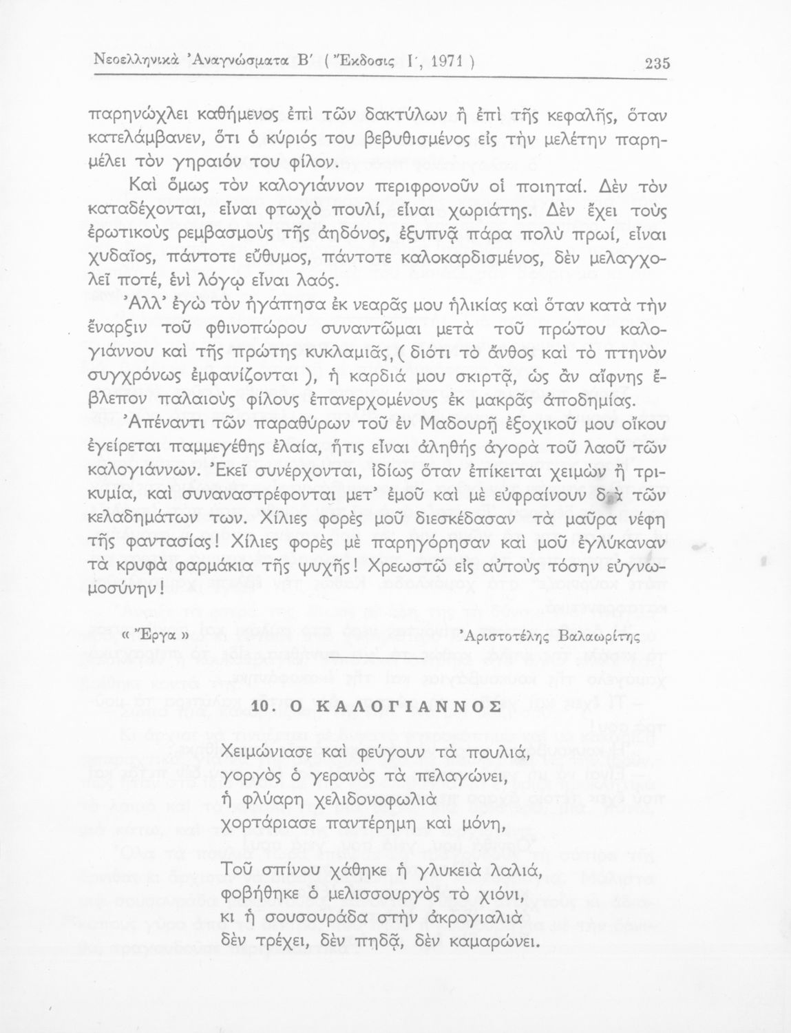 Σχολικό εγχειρίδιο Νέων Ελληνικών Β' Γυμνασίου που περιέχει ποιήματα και πεζά Ελλήνων συγγραφέων εμπνευσμένα από τη θρησκευτική, εθνική, οικογενειακή και κοινωνική ζωή και την ελληνική φύση. Περιέχει παράρτημα με βιογραφίες των συγγραφέων και λεξιλόγιο. Φέρει το σύμβολο της δικτατορίας.