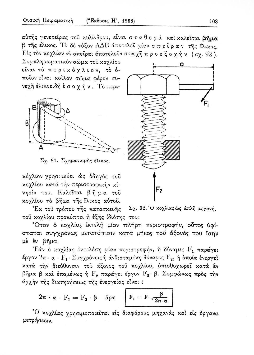Σχολικό εγχειρίδιο Φυσικής Πειραματικής που εστιάζει στα φυσικά φαινόμενα της μηχανικής, της ακουστικής και της θερμότητας. Φέρει το σύμβολο της δικτατορίας.