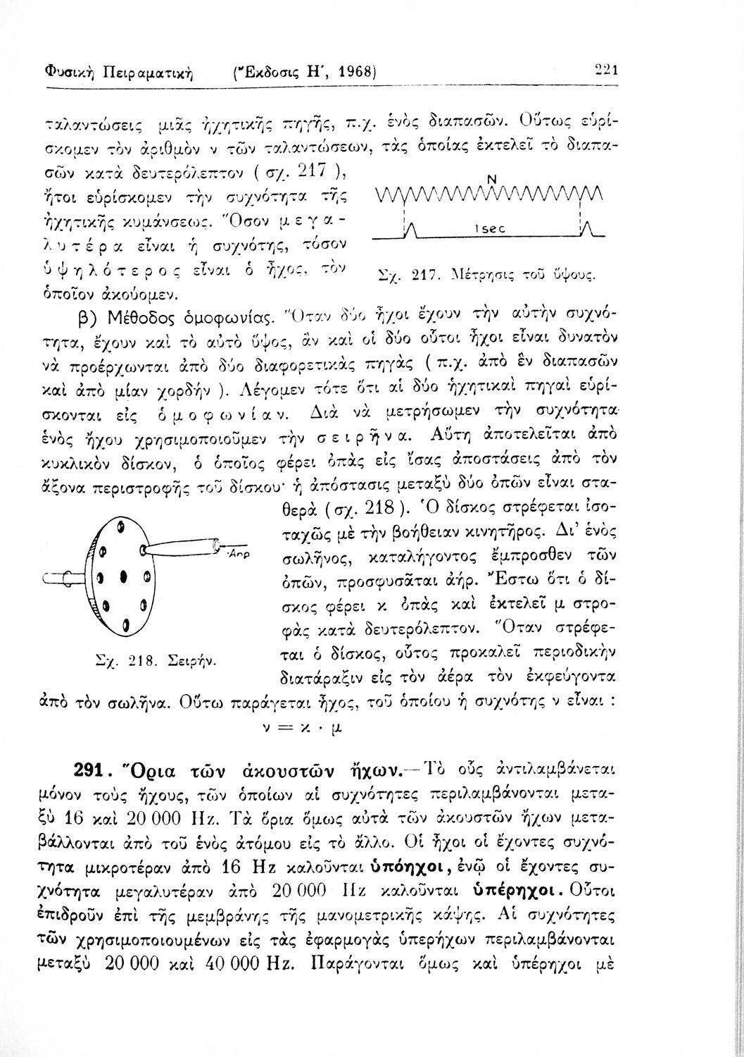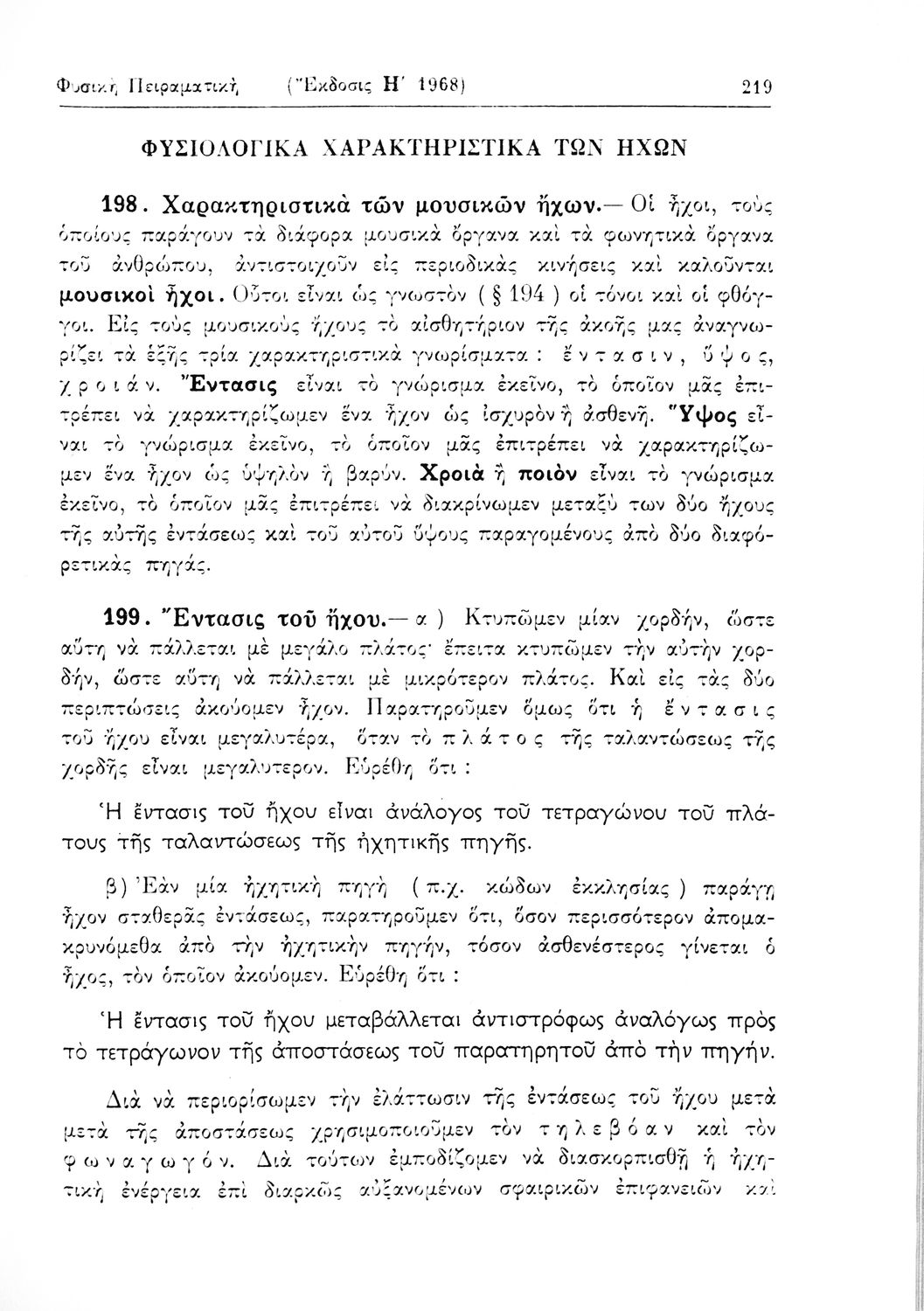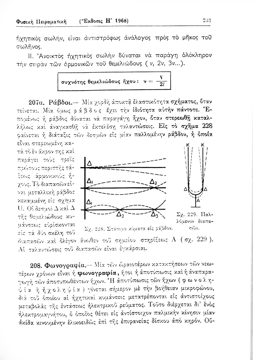 Σχολικό εγχειρίδιο Φυσικής Πειραματικής που εστιάζει στα φυσικά φαινόμενα της μηχανικής, της ακουστικής και της θερμότητας. Φέρει το σύμβολο της δικτατορίας.