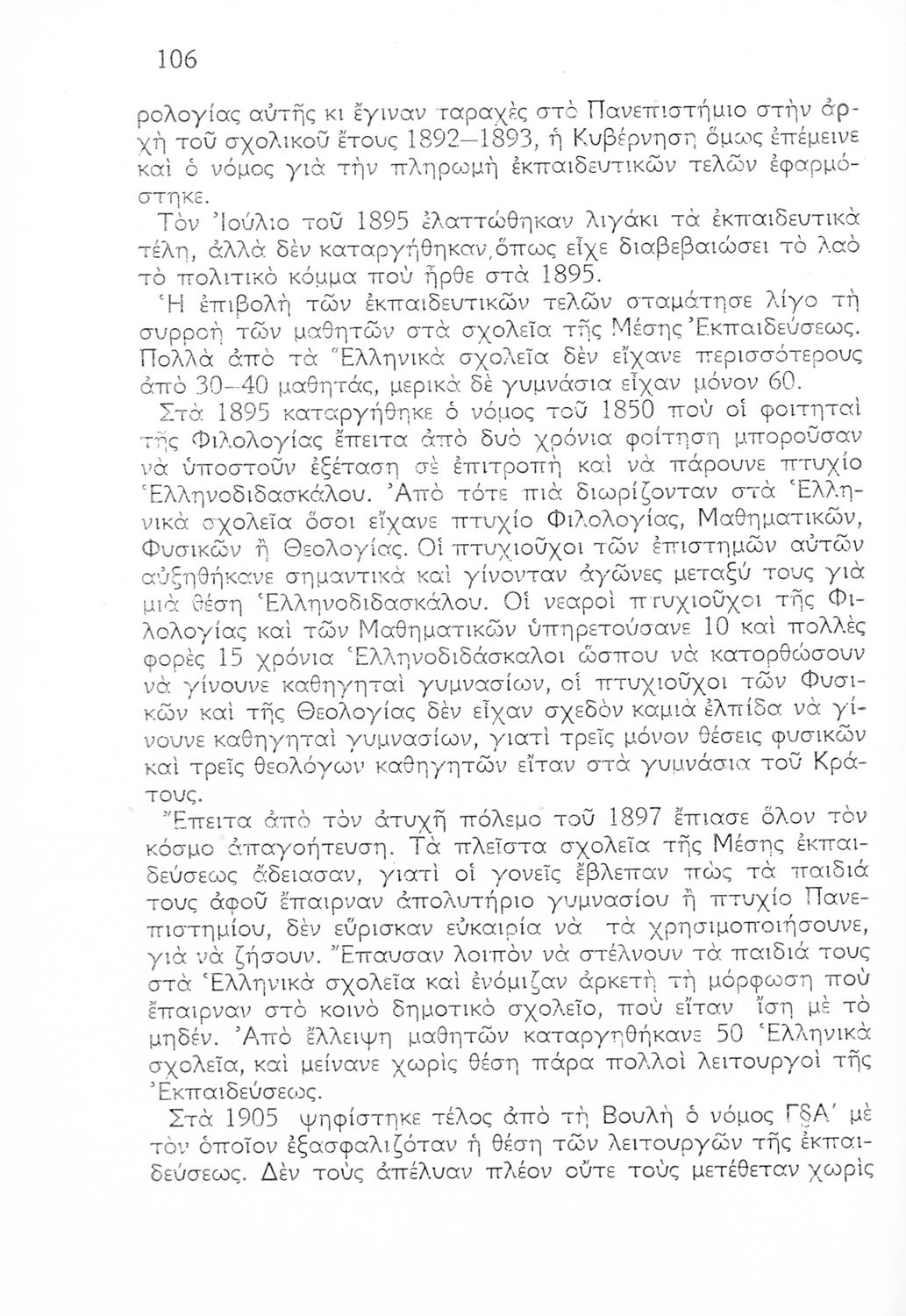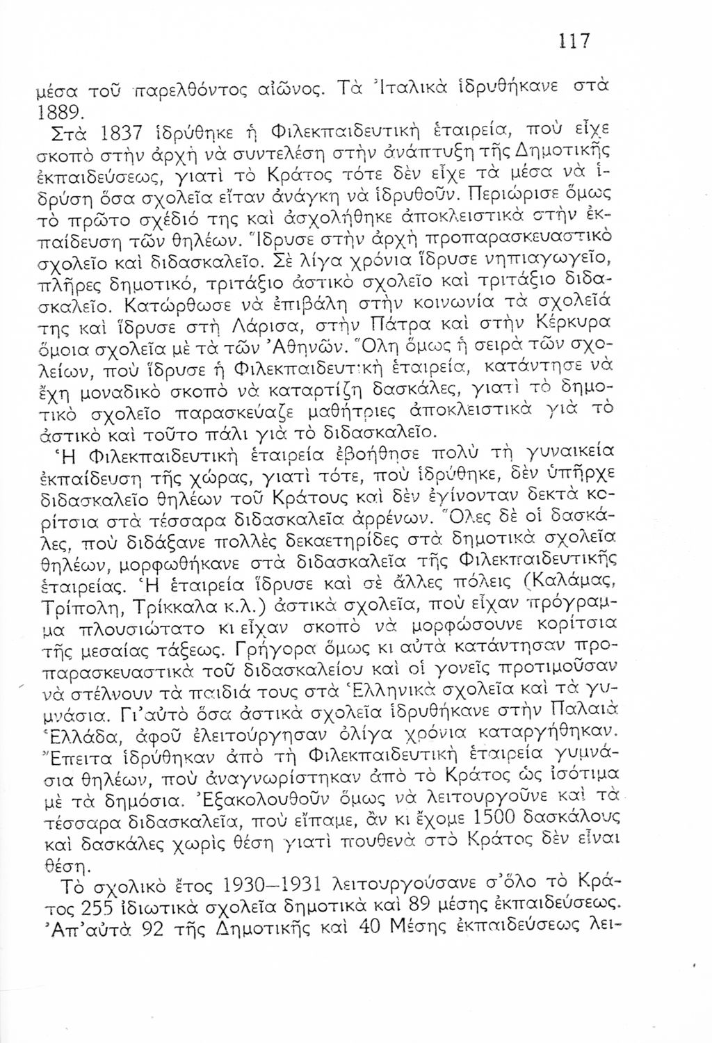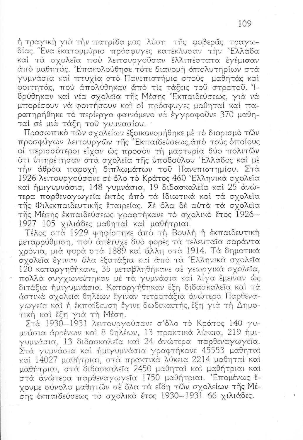 Ιστορική καταγραφή της κατάστασης του εκπαιδευτικού συστήματος από την ίδρυση του ελληνικού κράτους μέχρι το Μεσοπόλεμο μέσα από τεκμήρια. Οι συγγραφείς υπήρξαν επιθεωρητές ιδιωτικών και ξένων Δημοτικών Σχολείων.