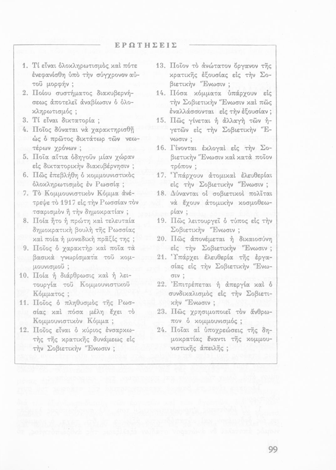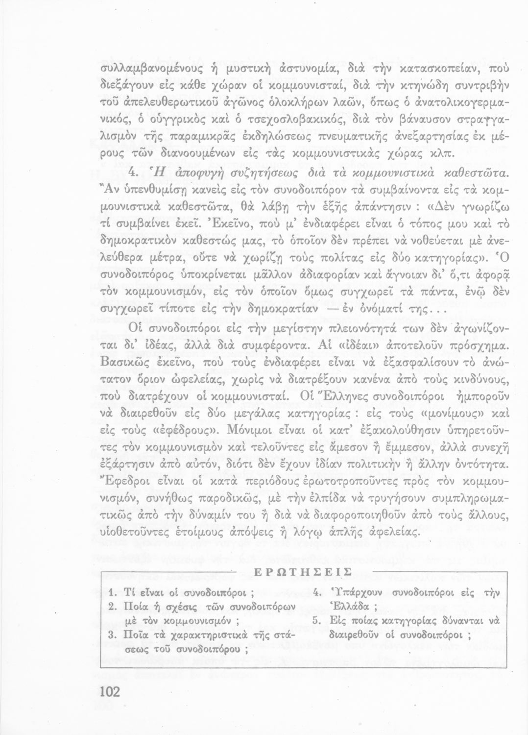 Σχολικό εγχειρίδιο της Γ΄ και ΣΤ΄ Γυμνασίου για το μάθημα της Πολιτικής Αγωγής. Αναφέρεται στις γενικές έννοιες του δικαίου, τις μορφές των πολιτευμάτων, τους θεσμούς, το διαχωρισμό των εξουσιών. Συνεχίζει με τη διοίκηση και τις εξουσίες στο Ελληνικό Κράτος. Έπειτα παρουσιάζει τα οικονομικά του κράτους και τους διάφορους τομείς της κοινωνικής ζωής. Αναφέρει την απειλή του Κομμουνισμού και επισημαίνει τα εθνικά σύμβολα. Τέλος γίνεται αναφορά στους Διεθνείς Οργανισμούς. Σκοπός του μαθήματος είναι να αποκτήσουν οι μαθητές ως πολίτες ειδικές αναμορφωμένες στα κοινά γνώσεις, καθώς και την καλλιέργειά της εθνικής συνείδησής.