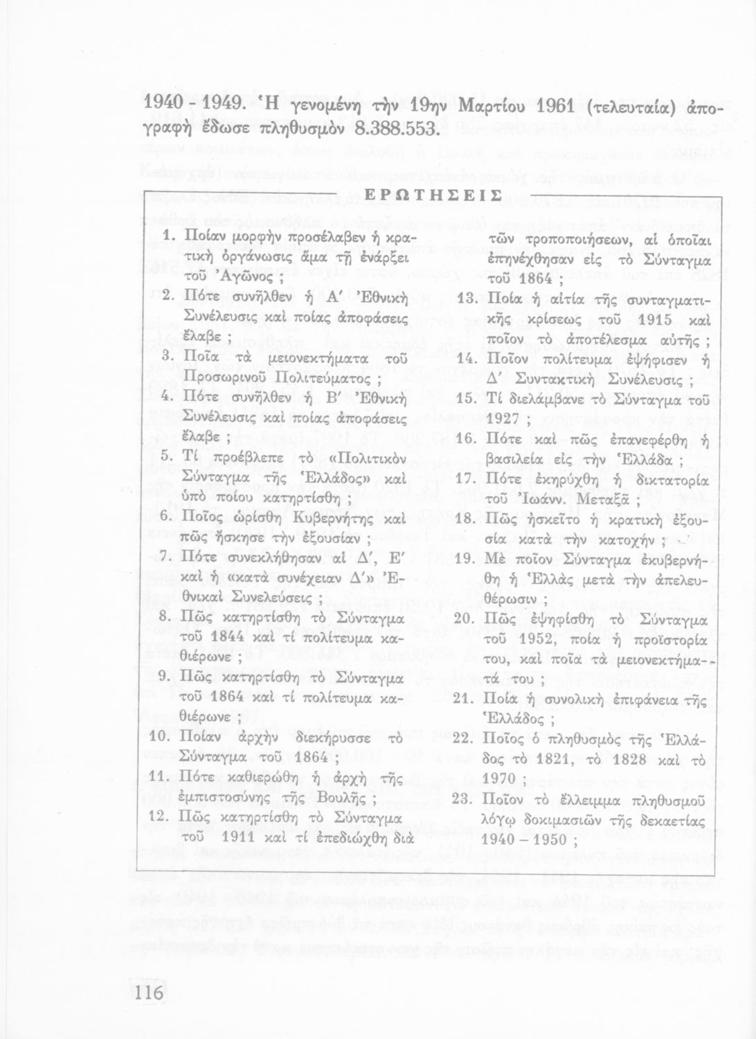 Παρουσίαση περιεχομένου: Σχολικό εγχειρίδιο της Γ΄ και ΣΤ΄ Γυμνασίου για το μάθημα της Πολιτικής Αγωγής. Αναφέρεται στις γενικές έννοιες του δικαίου, τις μορφές των πολιτευμάτων, τους θεσμούς, το διαχωρισμό των εξουσιών. Συνεχίζει με τη διοίκηση και τις εξουσίες στο Ελληνικό Κράτος. Έπειτα παρουσιάζει τα οικονομικά του κράτους και τους διάφορους τομείς της κοινωνικής ζωής. Αναφέρει την απειλή του Κομμουνισμού και επισημαίνει τα εθνικά σύμβολα. Τέλος γίνεται αναφορά στους Διεθνείς Οργανισμούς. Σκοπός του μαθήματος είναι να αποκτήσουν οι μαθητές ως πολίτες ειδικές αναμορφωμένες στα κοινά γνώσεις, καθώς και την καλλιέργειά της εθνικής συνείδησής.