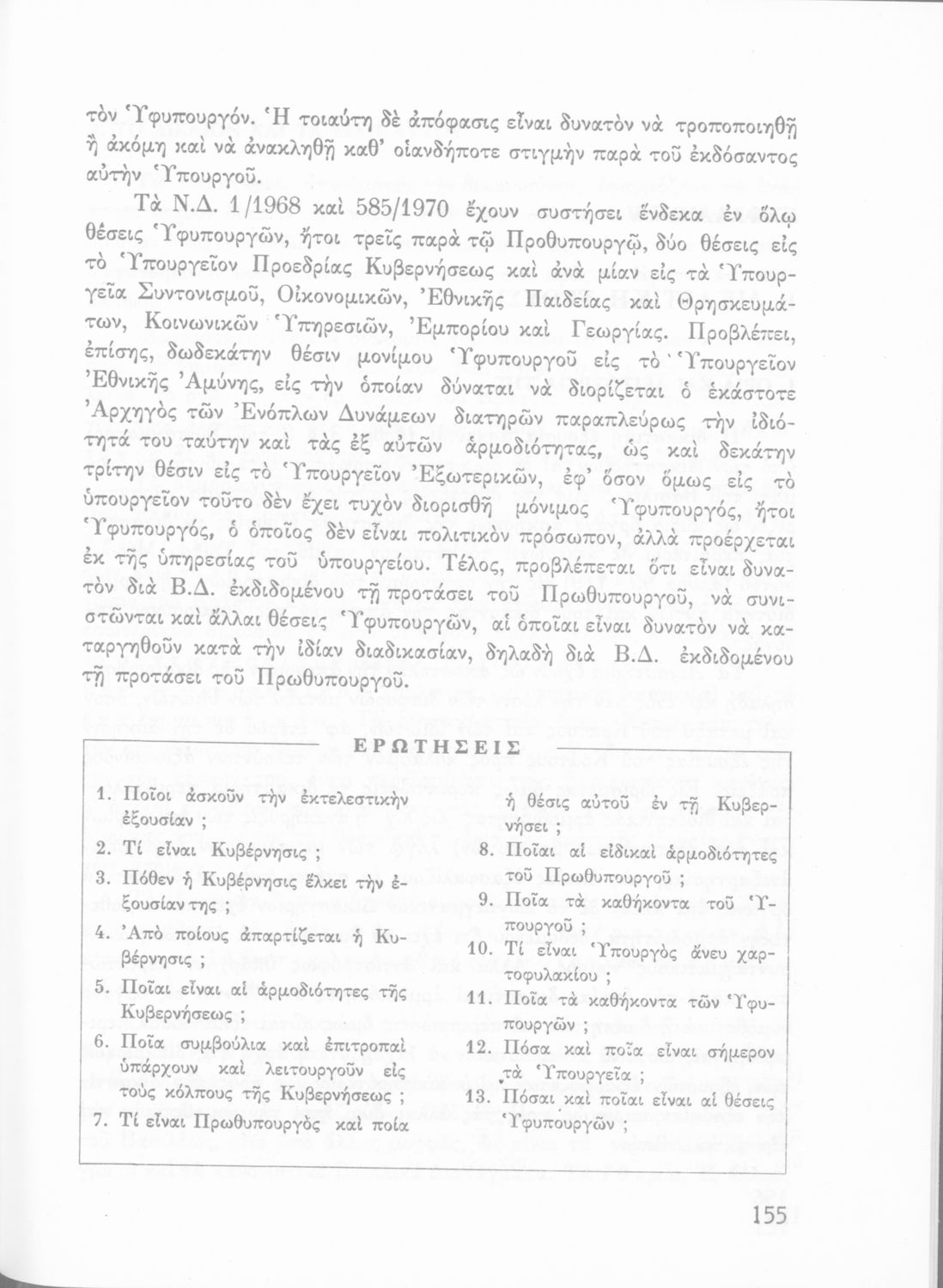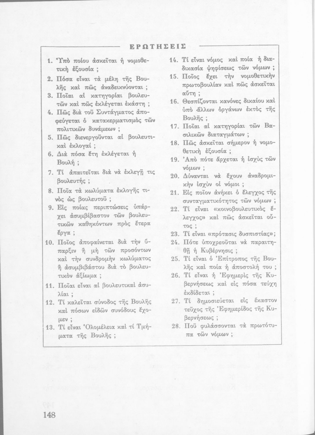 Σχολικό εγχειρίδιο της Γ΄ και ΣΤ΄ Γυμνασίου για το μάθημα της Πολιτικής Αγωγής. Αναφέρεται στις γενικές έννοιες του δικαίου, τις μορφές των πολιτευμάτων, τους θεσμούς, το διαχωρισμό των εξουσιών. Συνεχίζει με τη διοίκηση και τις εξουσίες στο Ελληνικό Κράτος. Έπειτα παρουσιάζει τα οικονομικά του κράτους και τους διάφορους τομείς της κοινωνικής ζωής. Αναφέρει την απειλή του Κομμουνισμού και επισημαίνει τα εθνικά σύμβολα. Τέλος γίνεται αναφορά στους Διεθνείς Οργανισμούς. Σκοπός του μαθήματος είναι να αποκτήσουν οι μαθητές ως πολίτες ειδικές αναμορφωμένες στα κοινά γνώσεις, καθώς και την καλλιέργειά της εθνικής συνείδησής.
