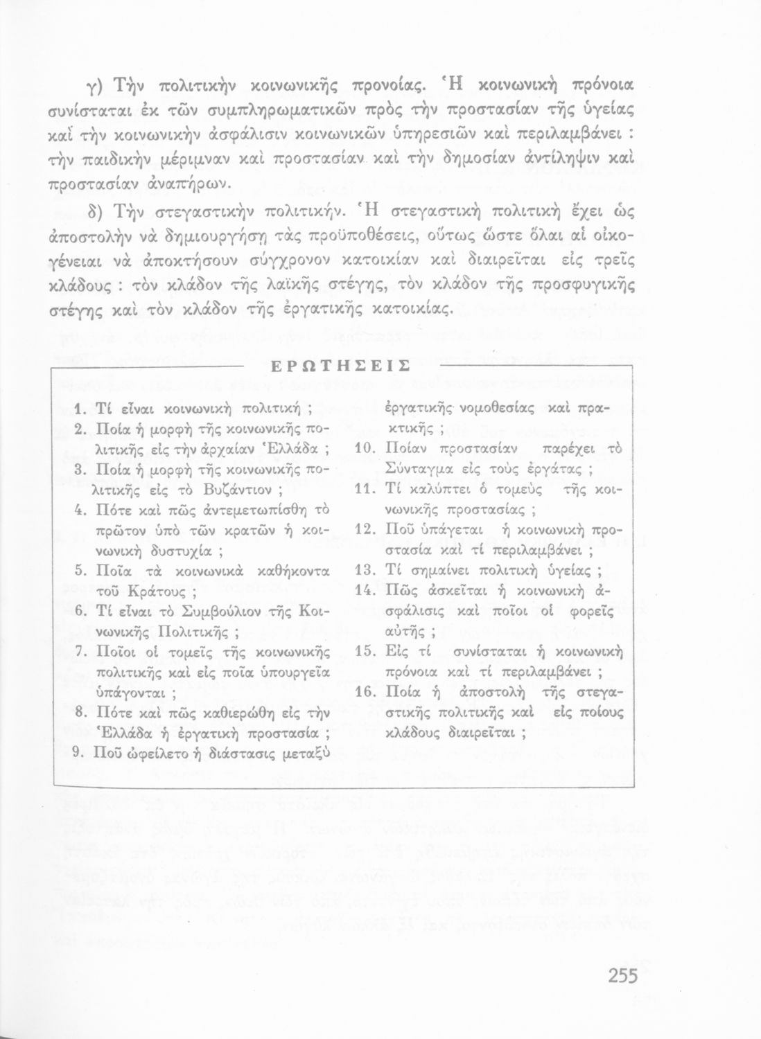 Σχολικό εγχειρίδιο της Γ΄ και ΣΤ΄ Γυμνασίου για το μάθημα της Πολιτικής Αγωγής. Αναφέρεται στις γενικές έννοιες του δικαίου, τις μορφές των πολιτευμάτων, τους θεσμούς, το διαχωρισμό των εξουσιών. Συνεχίζει με τη διοίκηση και τις εξουσίες στο Ελληνικό Κράτος. Έπειτα παρουσιάζει τα οικονομικά του κράτους και τους διάφορους τομείς της κοινωνικής ζωής. Αναφέρει την απειλή του Κομμουνισμού και επισημαίνει τα εθνικά σύμβολα. Τέλος γίνεται αναφορά στους Διεθνείς Οργανισμούς. Σκοπός του μαθήματος είναι να αποκτήσουν οι μαθητές ως πολίτες ειδικές αναμορφωμένες στα κοινά γνώσεις, καθώς και την καλλιέργειά της εθνικής συνείδησής.