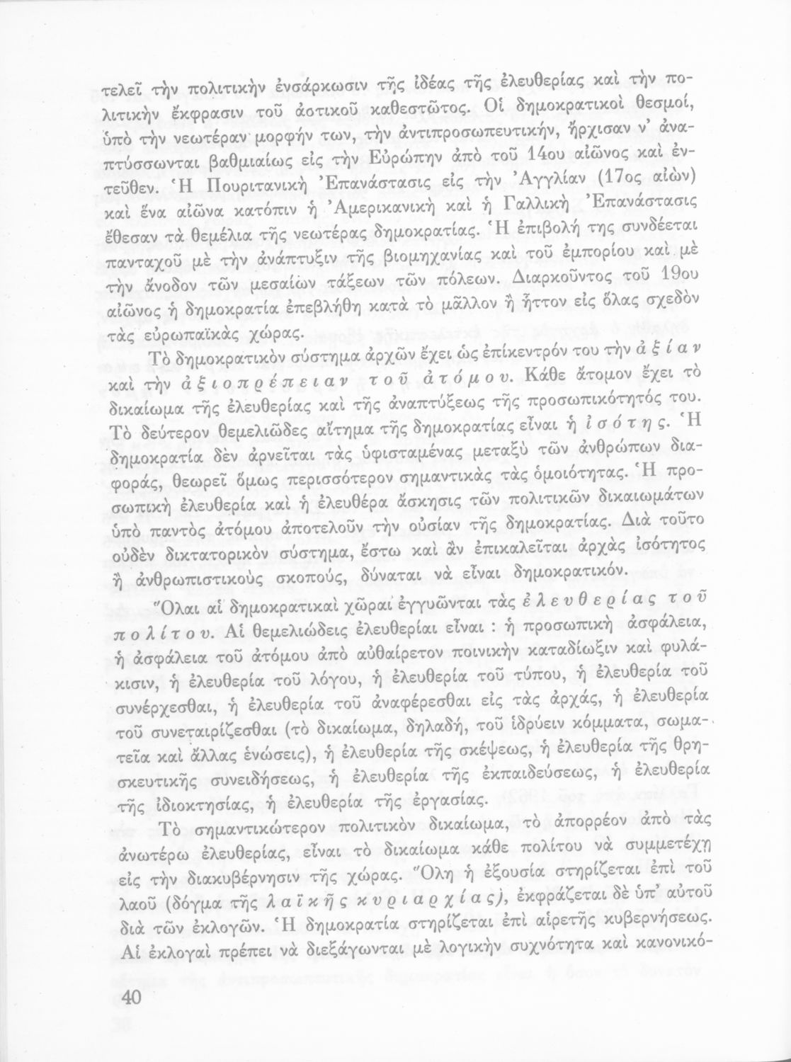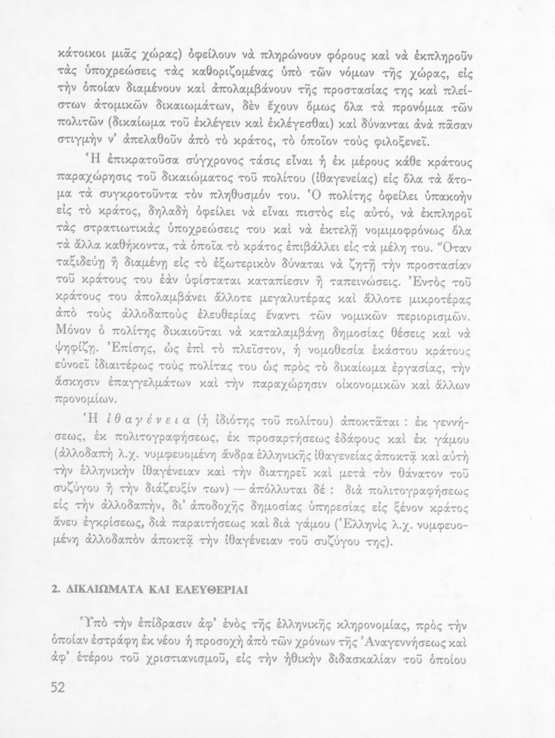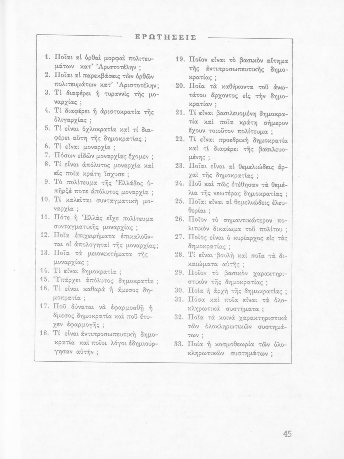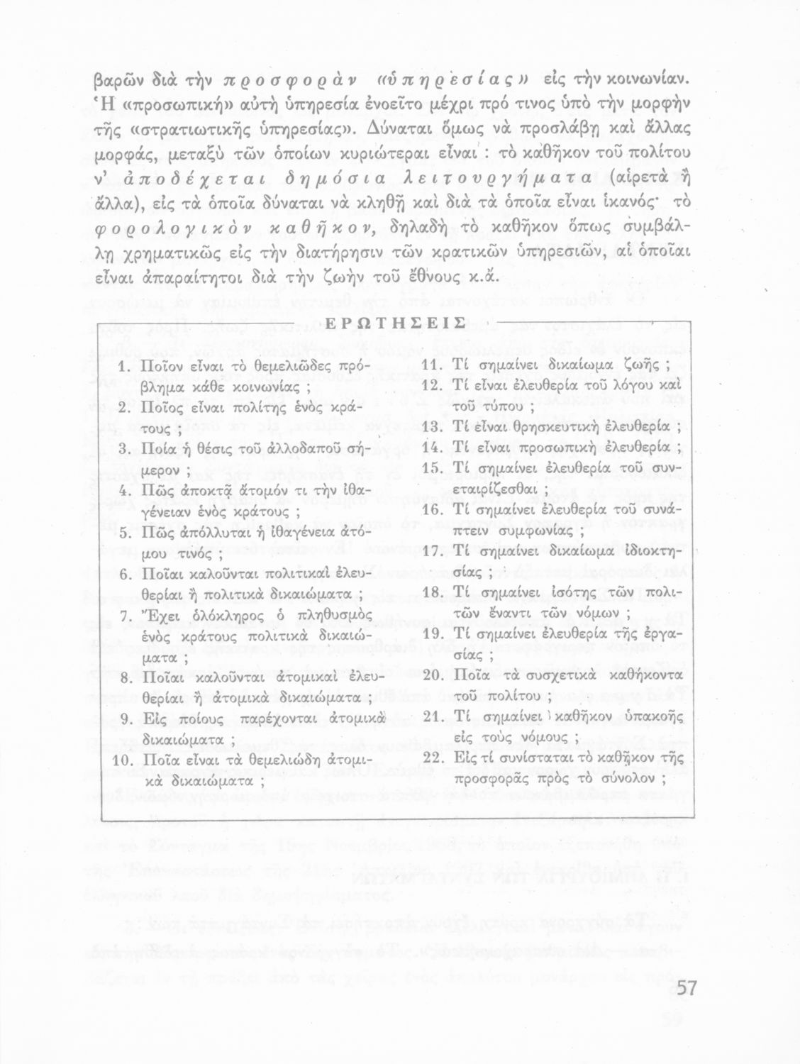 Σχολικό εγχειρίδιο της Γ΄ και ΣΤ΄ Γυμνασίου για το μάθημα της Πολιτικής Αγωγής. Αναφέρεται στις γενικές έννοιες του δικαίου, τις μορφές των πολιτευμάτων, τους θεσμούς, το διαχωρισμό των εξουσιών. Συνεχίζει με τη διοίκηση και τις εξουσίες στο Ελληνικό Κράτος. Έπειτα παρουσιάζει τα οικονομικά του κράτους και τους διάφορους τομείς της κοινωνικής ζωής. Αναφέρει την απειλή του Κομμουνισμού και επισημαίνει τα εθνικά σύμβολα. Τέλος γίνεται αναφορά στους Διεθνείς Οργανισμούς. Σκοπός του μαθήματος είναι να αποκτήσουν οι μαθητές ως πολίτες ειδικές αναμορφωμένες στα κοινά γνώσεις, καθώς και την καλλιέργειά της εθνικής συνείδησής.