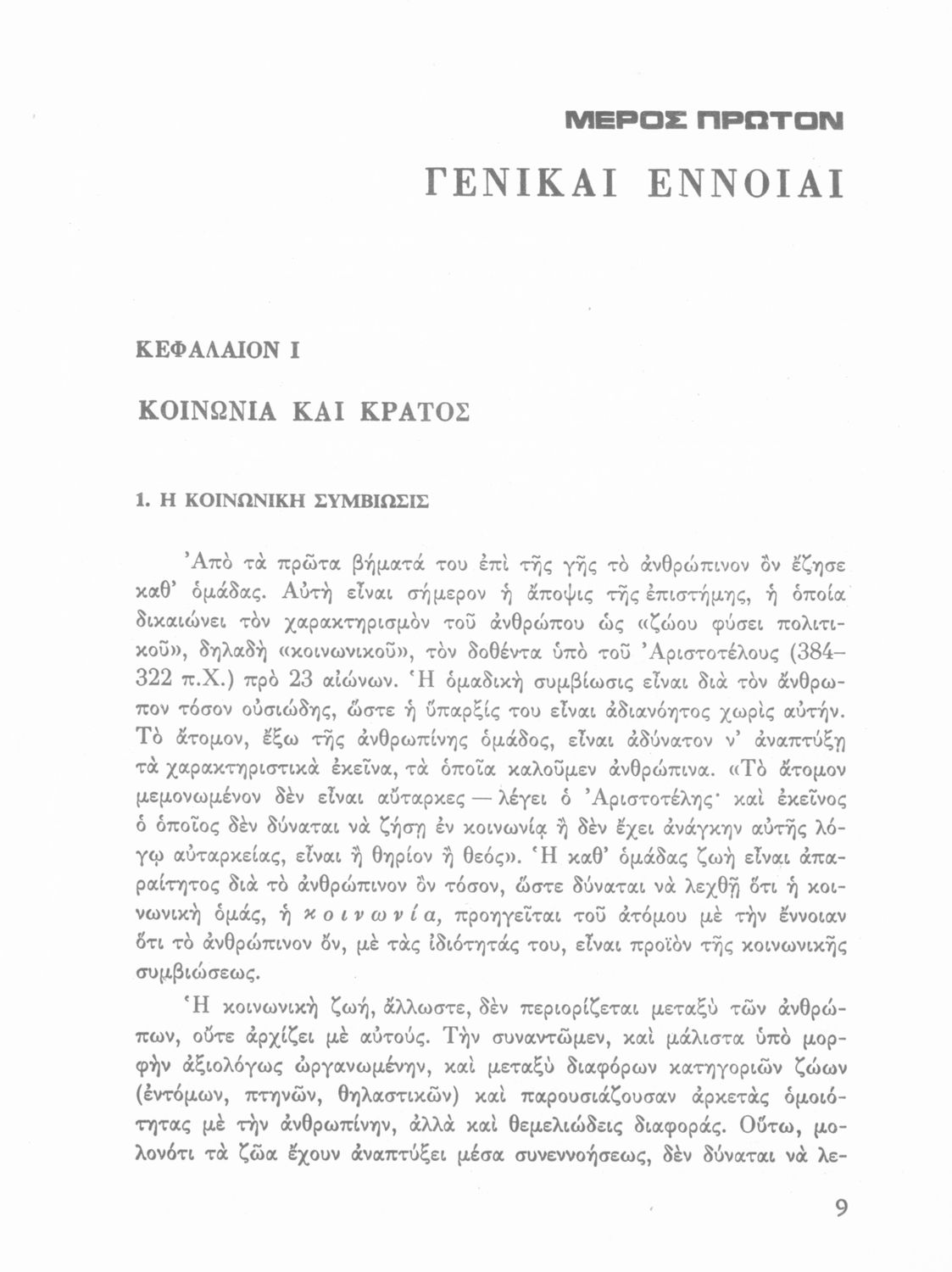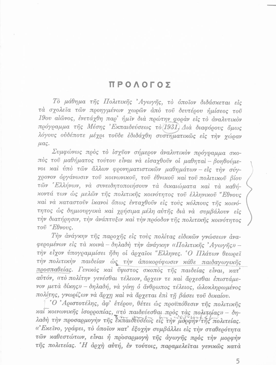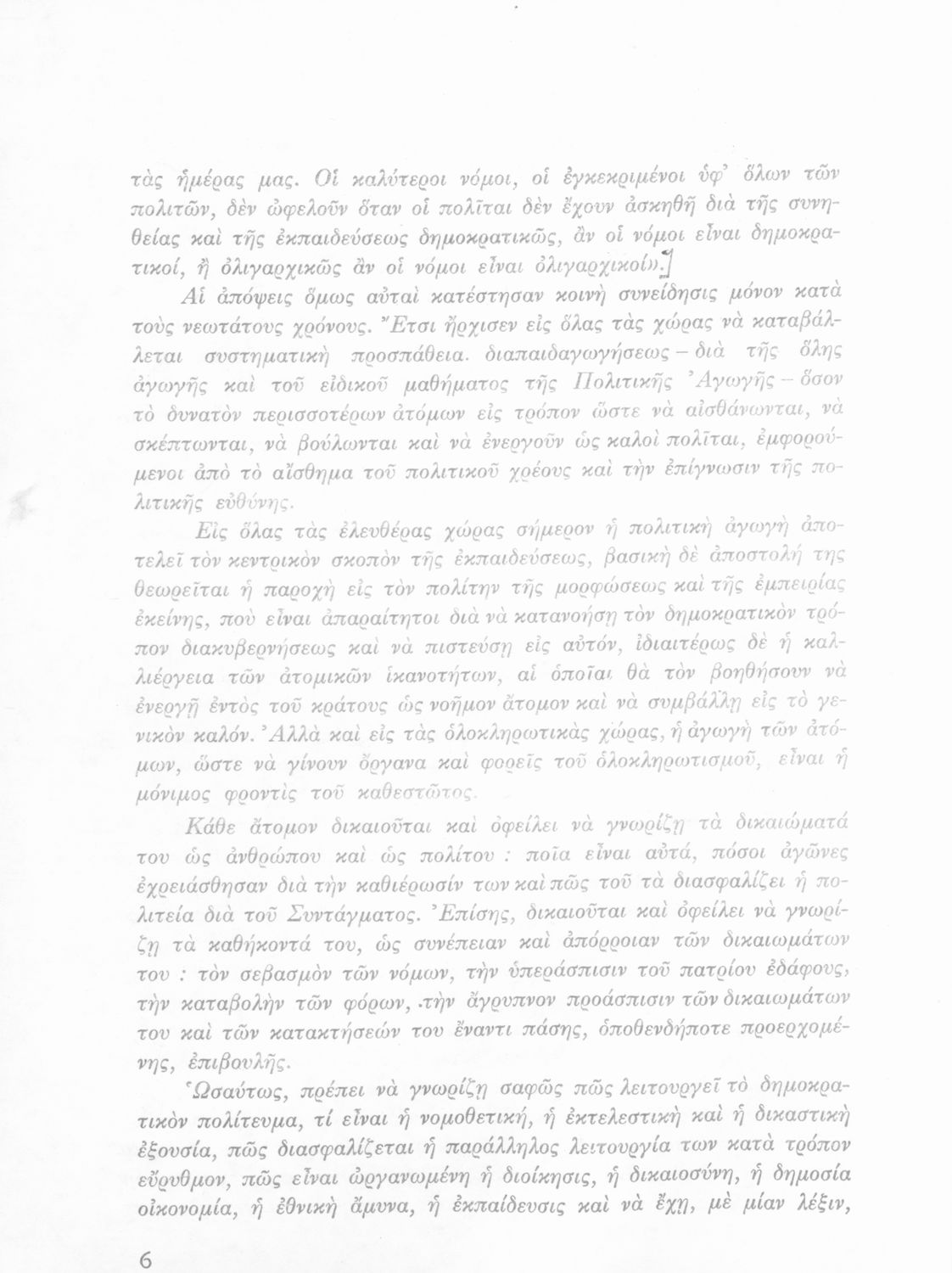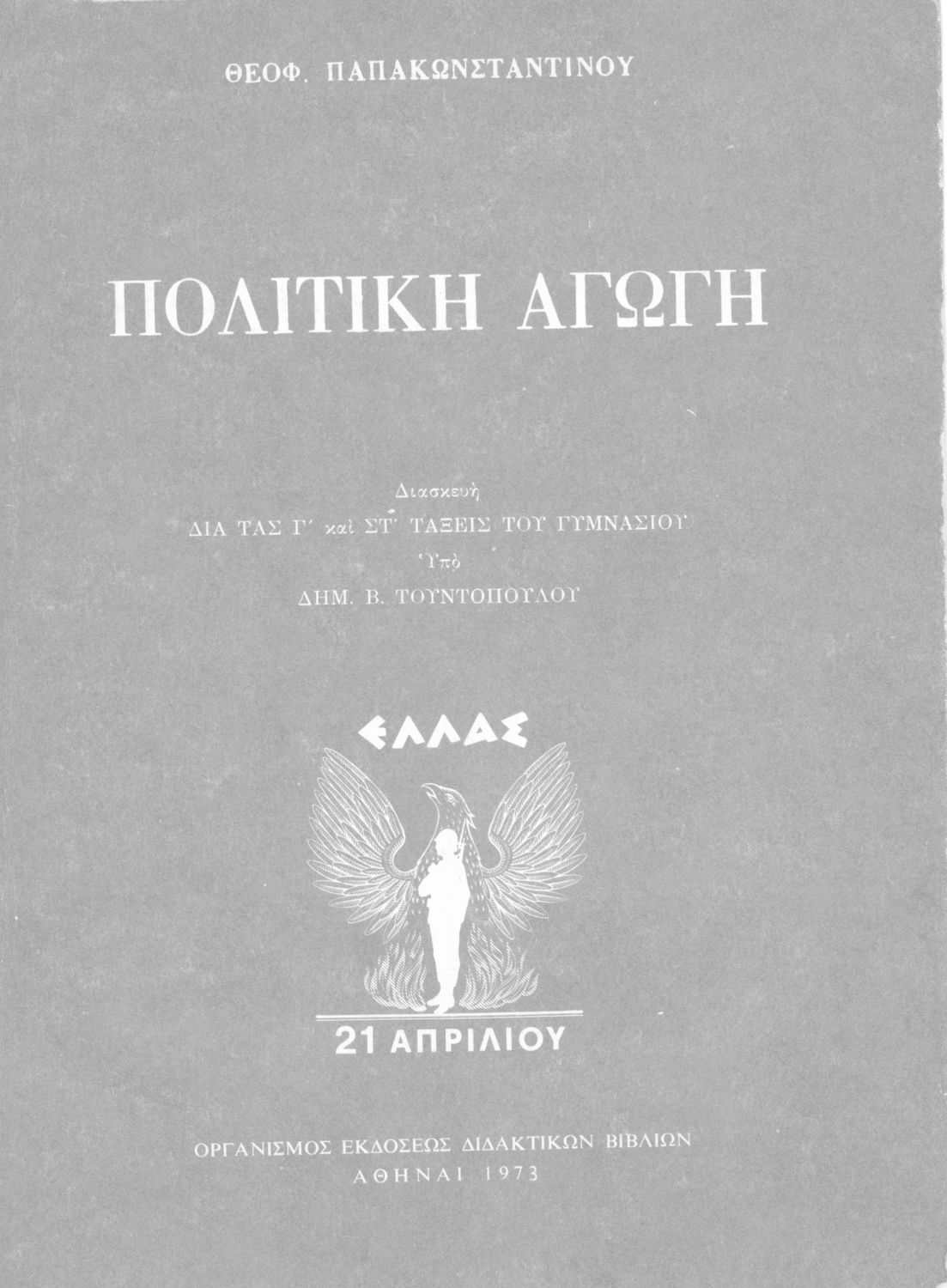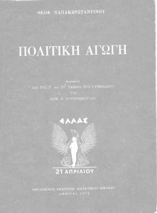 Σχολικό εγχειρίδιο της Γ΄ και ΣΤ΄ Γυμνασίου για το μάθημα της Πολιτικής Αγωγής. Αναφέρεται στις γενικές έννοιες του δικαίου, τις μορφές των πολιτευμάτων, τους θεσμούς, το διαχωρισμό των εξουσιών. Συνεχίζει με τη διοίκηση και τις εξουσίες στο Ελληνικό Κράτος. Έπειτα παρουσιάζει τα οικονομικά του κράτους και τους διάφορους τομείς της κοινωνικής ζωής. Αναφέρει την απειλή του Κομμουνισμού και επισημαίνει τα εθνικά σύμβολα. Τέλος γίνεται αναφορά στους Διεθνείς Οργανισμούς. Σκοπός του μαθήματος είναι να αποκτήσουν οι μαθητές ως πολίτες ειδικές αναμορφωμένες στα κοινά γνώσεις, καθώς και την καλλιέργειά της εθνικής συνείδησής.