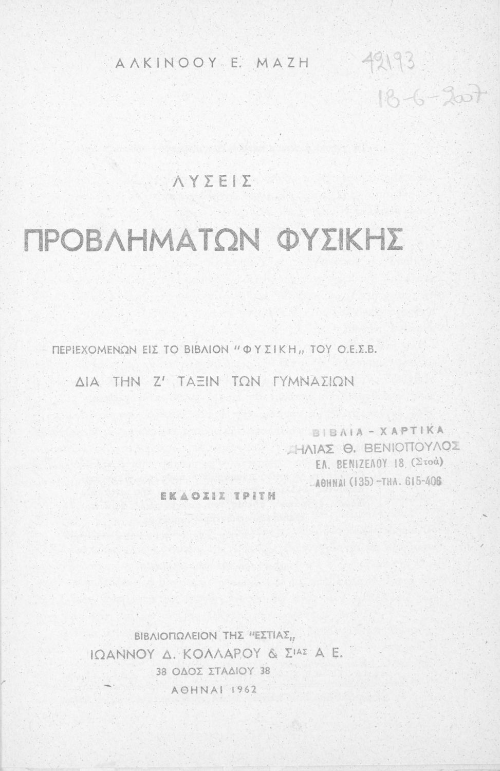 LDR 01168 2200193 4500 035 ## _a01-42193 040 ## _aΙνστιτούτο Εκπαιδευτικής Πολιτικής 041 ## _ael 100 ## _aΑλκίνοος Ε. Μάζης 110 ## _a42193 245 0# _aΛύσεις Προβλημάτων Φυσικής δια την Ζ΄ τάξιν των Γυμνασίων 260 ## _aΑθήνα _bΒιβλιοπωλείο της "Εστίας" & Καρ. Ε. Αθανασίου _c1963 300 ## _a200 _bΣχήματα (ασπρόμαυρα) 520 ## _aΜαθητικό βοήθημα Φυσικής Ζ' Γυμνασίου που περιλαμβάνει λύσεις ασκήσεων που αφορούν τις δυνάμεις και τη μηχανική στερεών, υγρών και αέριων σωμάτων. Περιλαμβάνει εφαρμογές διάδοσης της θερμότητας και του ήχου. 521 ## _aΖ' Γυμνασίου 522 ## _aΕλλάδα 546 ## _aΚαθαρεύουσα 563 ## _aΜαλακό Εξώφυλλο 650 #4 _aΔύναμη _aΕνέργεια _aΉχος _aΘερμότητα _aΙσορροπία