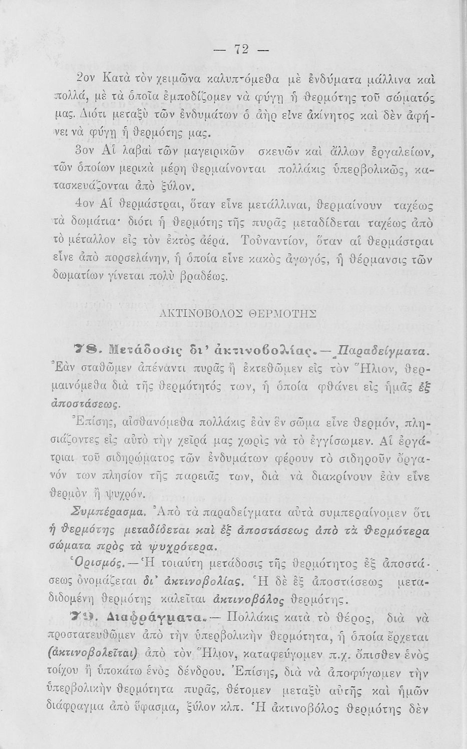 Παρουσίαση περιεχομένου: Σχολικό εγχειρίδιο για τις Τάξεις των Ελληνικών Σχολείων και Παρθεναγωγείων για το μάθημα της Φυσικής. Παρέχει βασικές γνώσεις της φυσικής επιστήμης και της χημείας. Αναλύει τις ιδιότητες των σωμάτων, καθώς και της θερμότητας, του ηλεκτρισμού και του μαγνητισμού, την υδροστατική, την βαρύτητα και την αεροστατική. Αναφέρει πολλά από τα όργανα, που χρησιμοποιούνται στη φυσική, καθώς και τις πρακτικές εφαρμογές της επιστήμης στην καθημερινότητα. Περιέχει εικόνες και σχεδιαγράμματα τα οποία βοηθούν τη διδασκαλία.