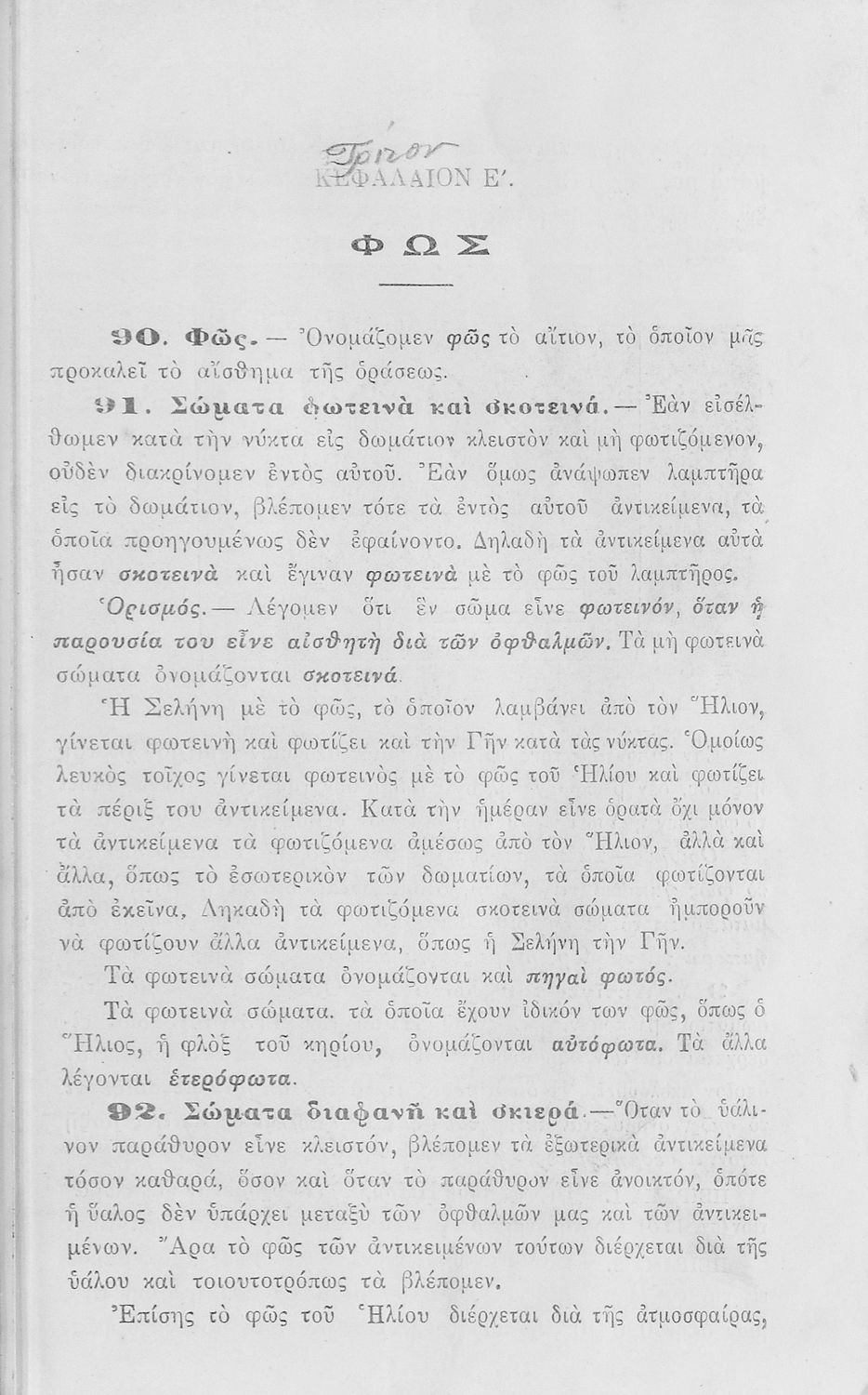 Σχολικό εγχειρίδιο για τις Τάξεις των Ελληνικών Σχολείων και Παρθεναγωγείων για το μάθημα της Φυσικής. Παρέχει βασικές γνώσεις της φυσικής επιστήμης και της χημείας. Αναλύει τις ιδιότητες των σωμάτων, καθώς και της θερμότητας, του ηλεκτρισμού και του μαγνητισμού, την υδροστατική, την βαρύτητα και την αεροστατική. Αναφέρει πολλά από τα όργανα, που χρησιμοποιούνται στη φυσική, καθώς και τις πρακτικές εφαρμογές της επιστήμης στην καθημερινότητα. Περιέχει εικόνες και σχεδιαγράμματα τα οποία βοηθούν τη διδασκαλία.