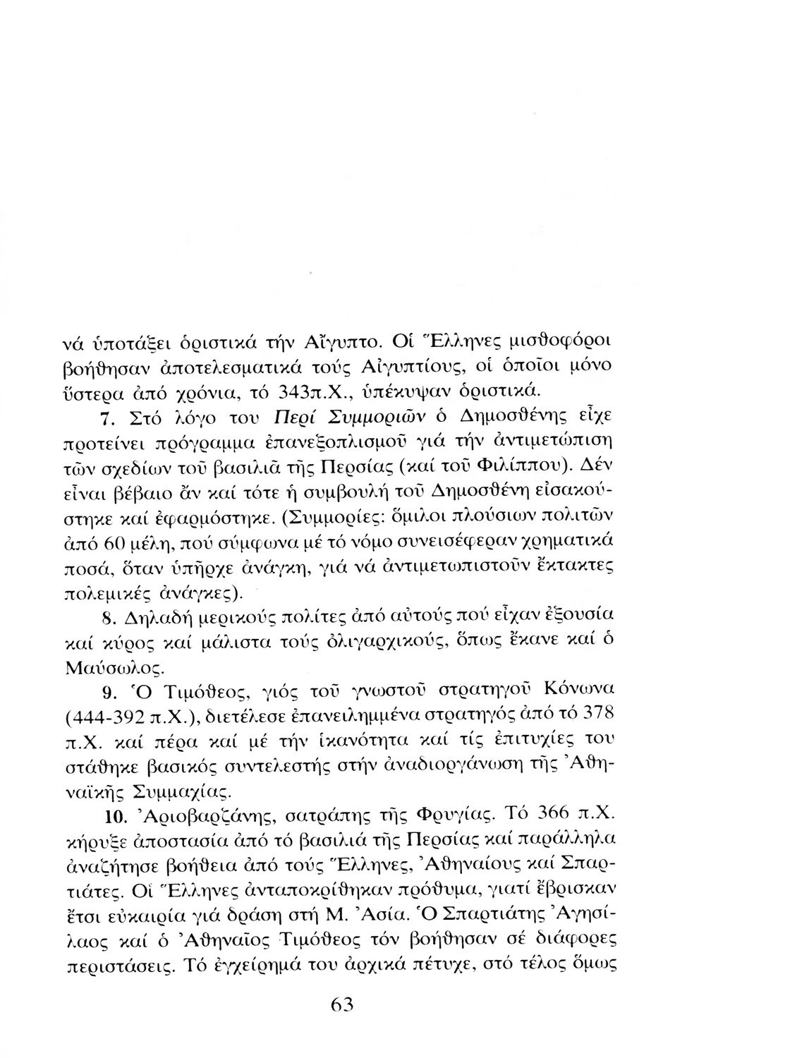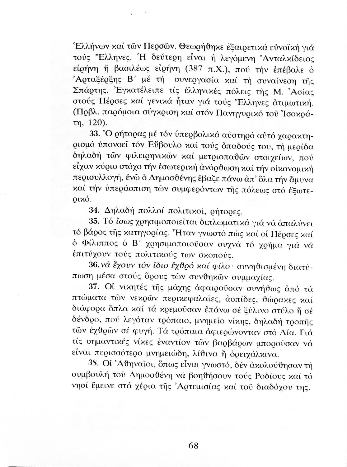 Σχολικό εγχειρίδιο Αρχαίων Ελληνικών Γ΄ Γυμνασίου περιλαμβάνει εισαγωγή στη ζωή και το έργο του Δημοσθένη, τους Λόγους του Γ΄ Ολυνθιακός και Υπέρ της ελευθερίας των Ροδίων σε μετάφραση και ερμηνευτικές σημειώσεις.