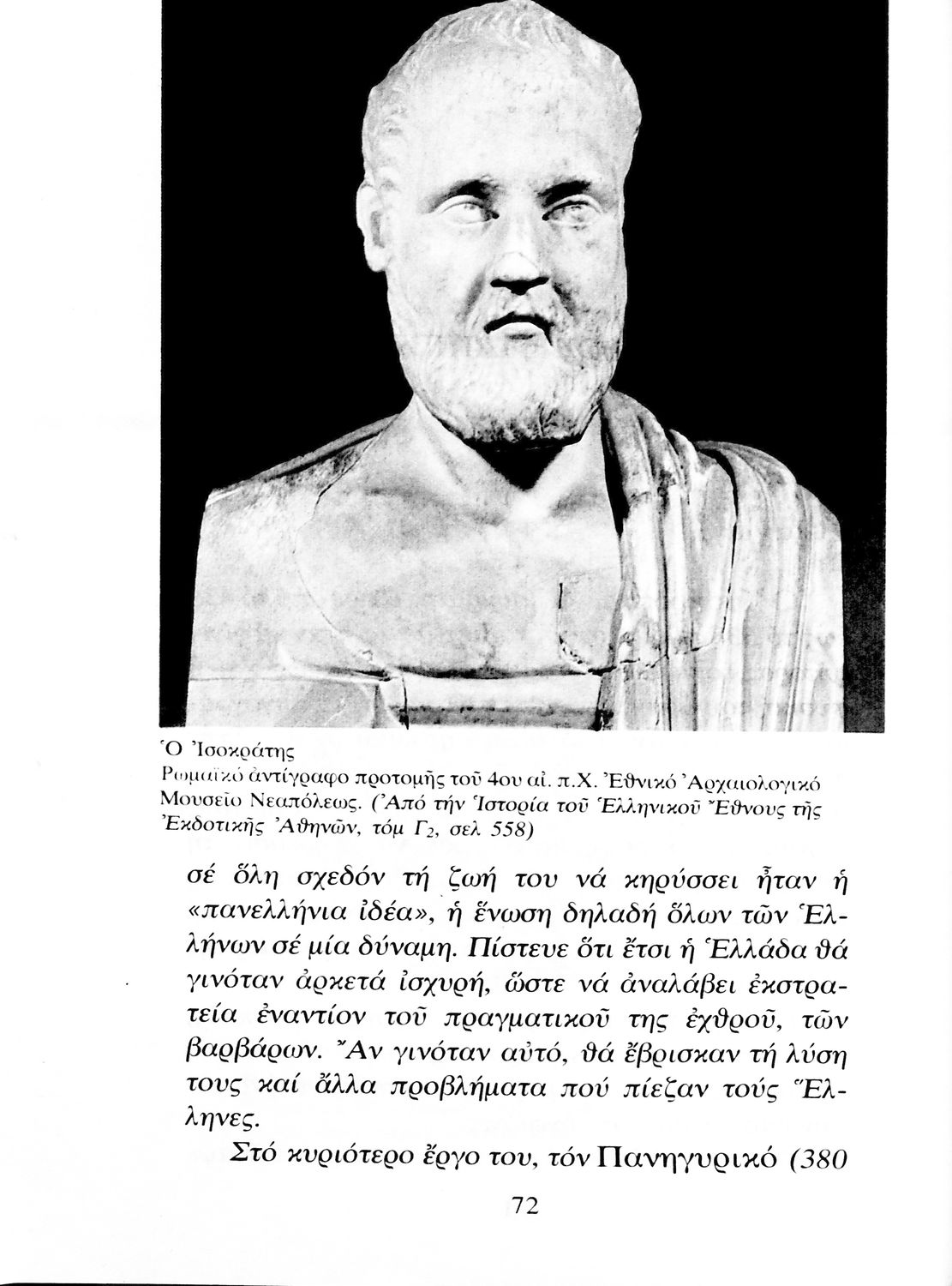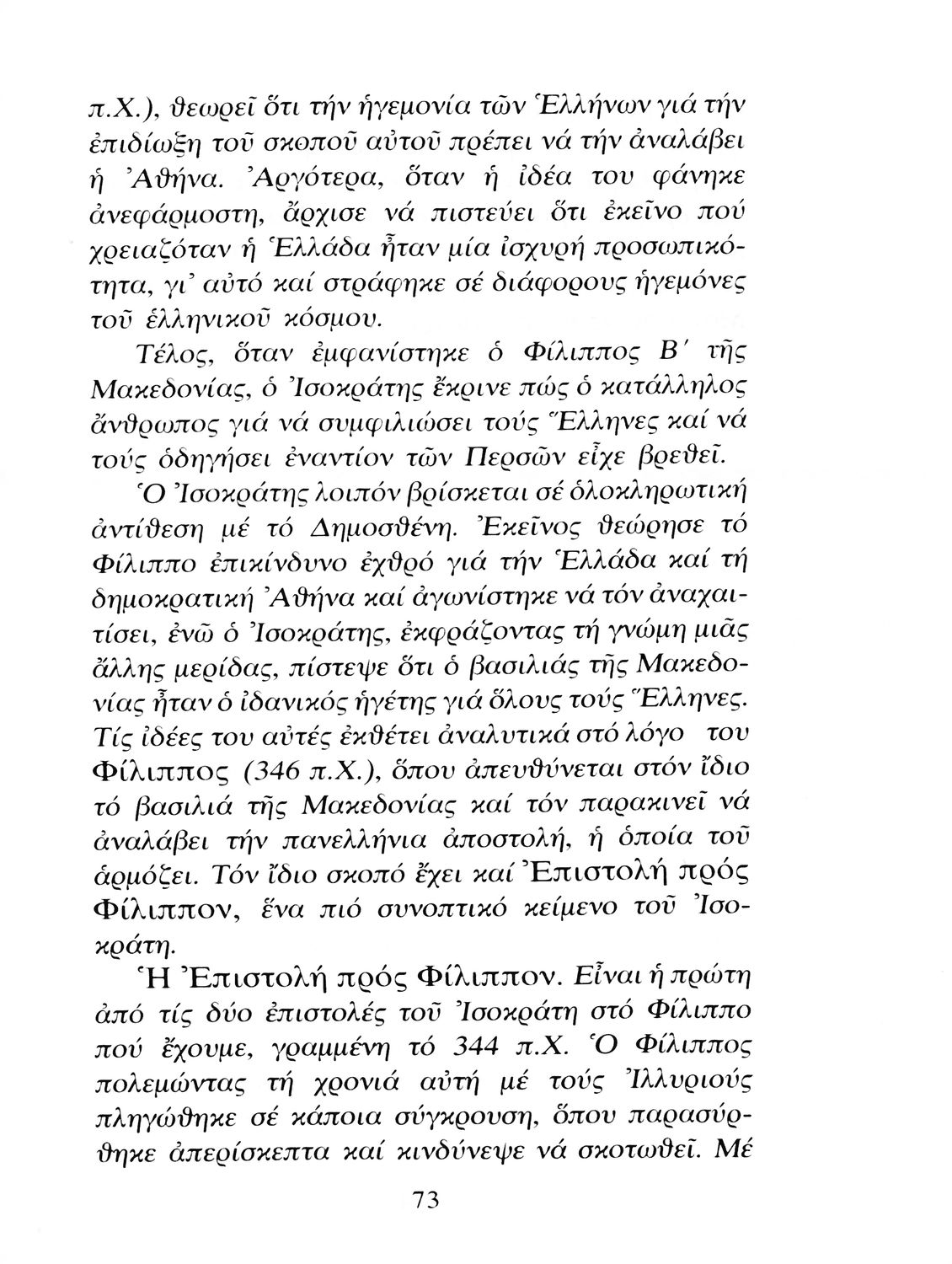 Σχολικό εγχειρίδιο Αρχαίων Ελληνικών Δ΄ Γυμνασίου που περιλαμβάνει τους Ολυνθιακούς Α΄ και Β΄ και τους Φιλιππικούς Α΄ και Β' του Δημοσθένη, τον Λόγο κατά Λεωκράτους του Λυκούργου και Επιστολές του Ισοκράτη, ...