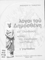 Σχολικό εγχειρίδιο Αρχαίων Ελληνικών Γ΄ Γυμνασίου περιλαμβάνει εισαγωγή στη ζωή και το έργο του Δημοσθένη, τους Λόγους του Γ΄ Ολυνθιακός και Υπέρ της ελευθερίας των Ροδίων σε μετάφραση και ερμηνευτικές ...