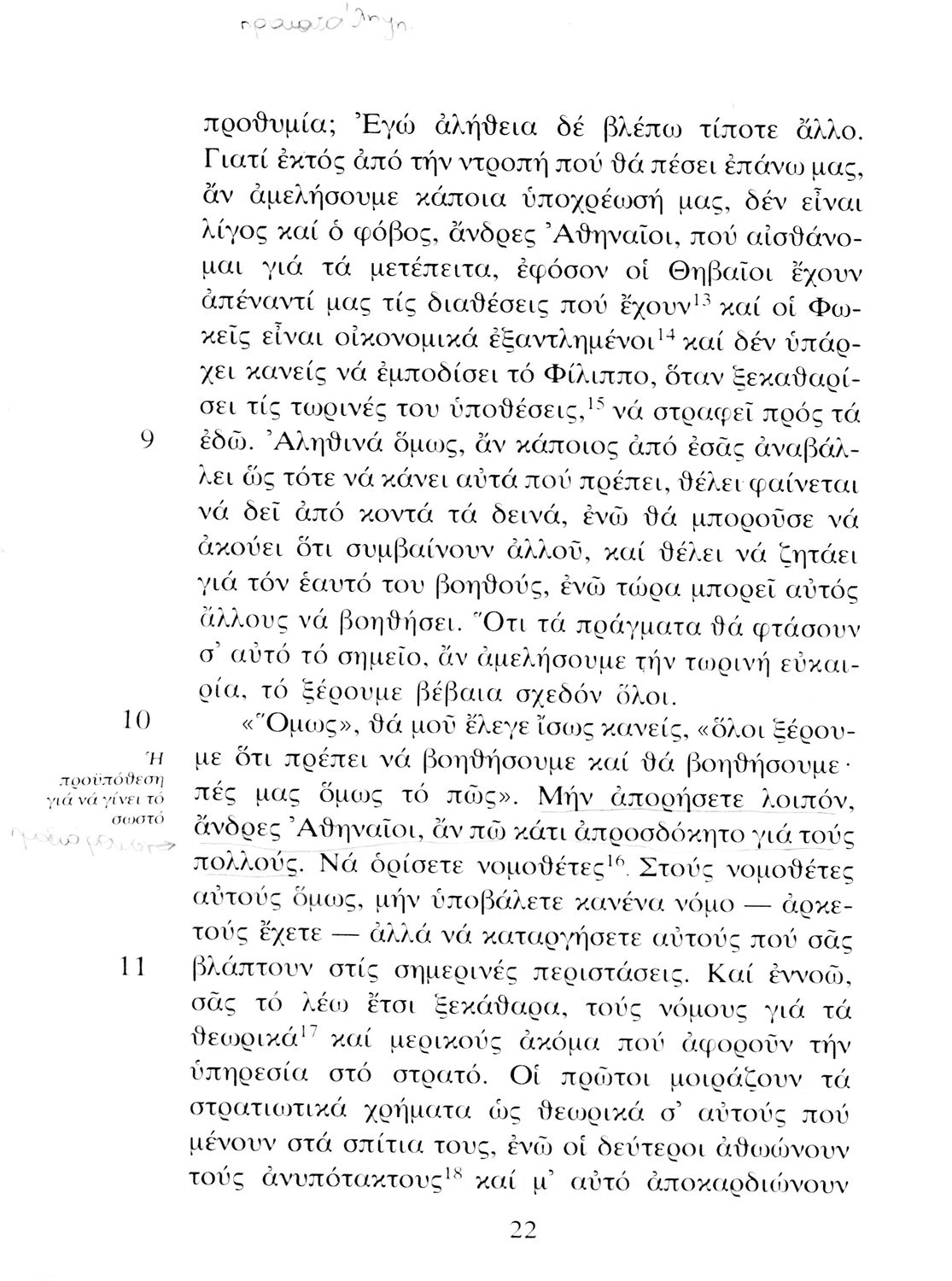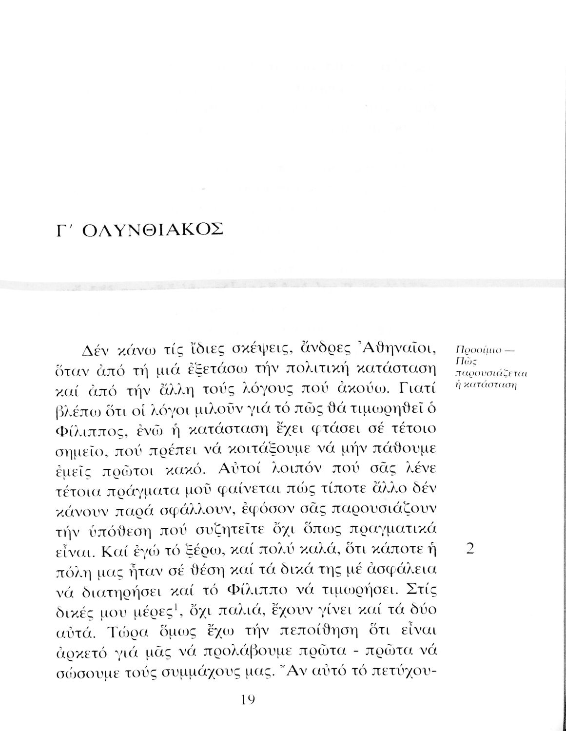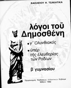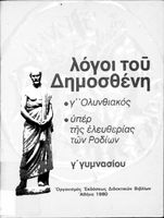 Σχολικό εγχειρίδιο Αρχαίων Ελληνικών Γ΄ Γυμνασίου περιλαμβάνει εισαγωγή στη ζωή και το έργο του Δημοσθένη, τους Λόγους του Γ΄ Ολυνθιακός και Υπέρ της ελευθερίας των Ροδίων σε μετάφραση και ερμηνευτικές σημειώσεις.