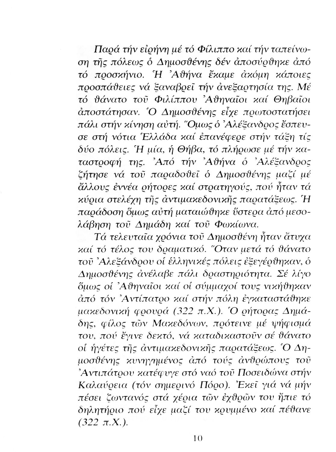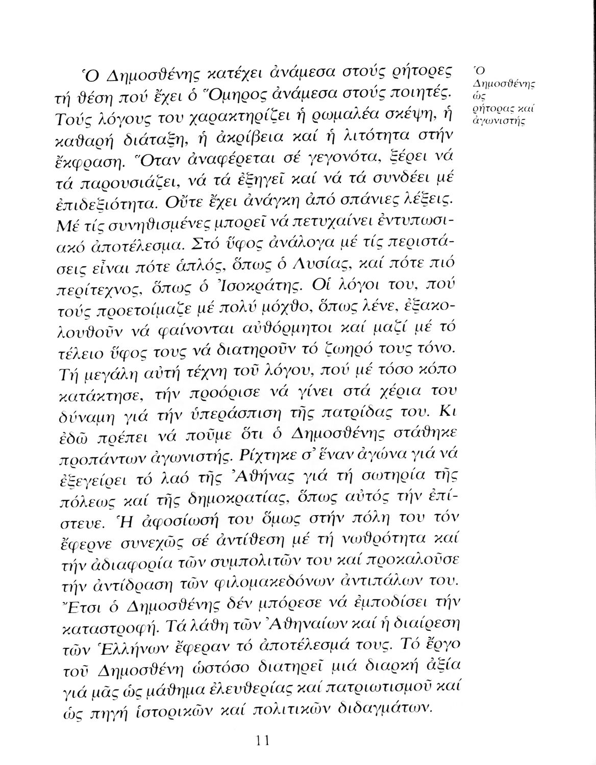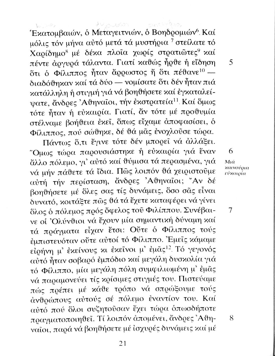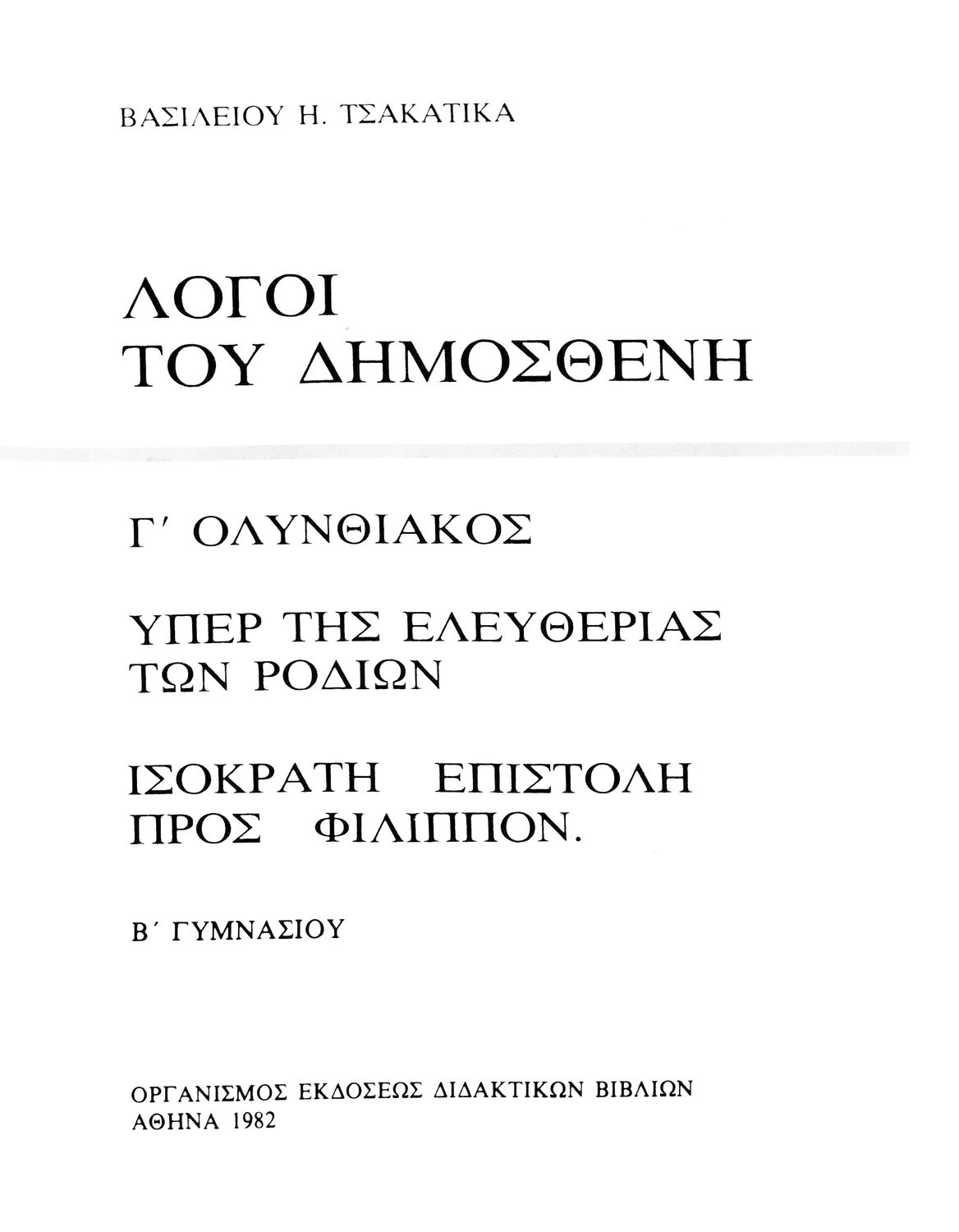 Σχολικό εγχειρίδιο Αρχαίων Ελληνικών Δ΄ Γυμνασίου που περιλαμβάνει εισαγωγή στη ζωή και στο έργο του Δημοσθένη, τον Α΄ κατά Φιλίππου, και τους Α΄ και Β΄ Ολυνθιακούς και ερμηνευτικά και ετυμολογικά σχόλια.