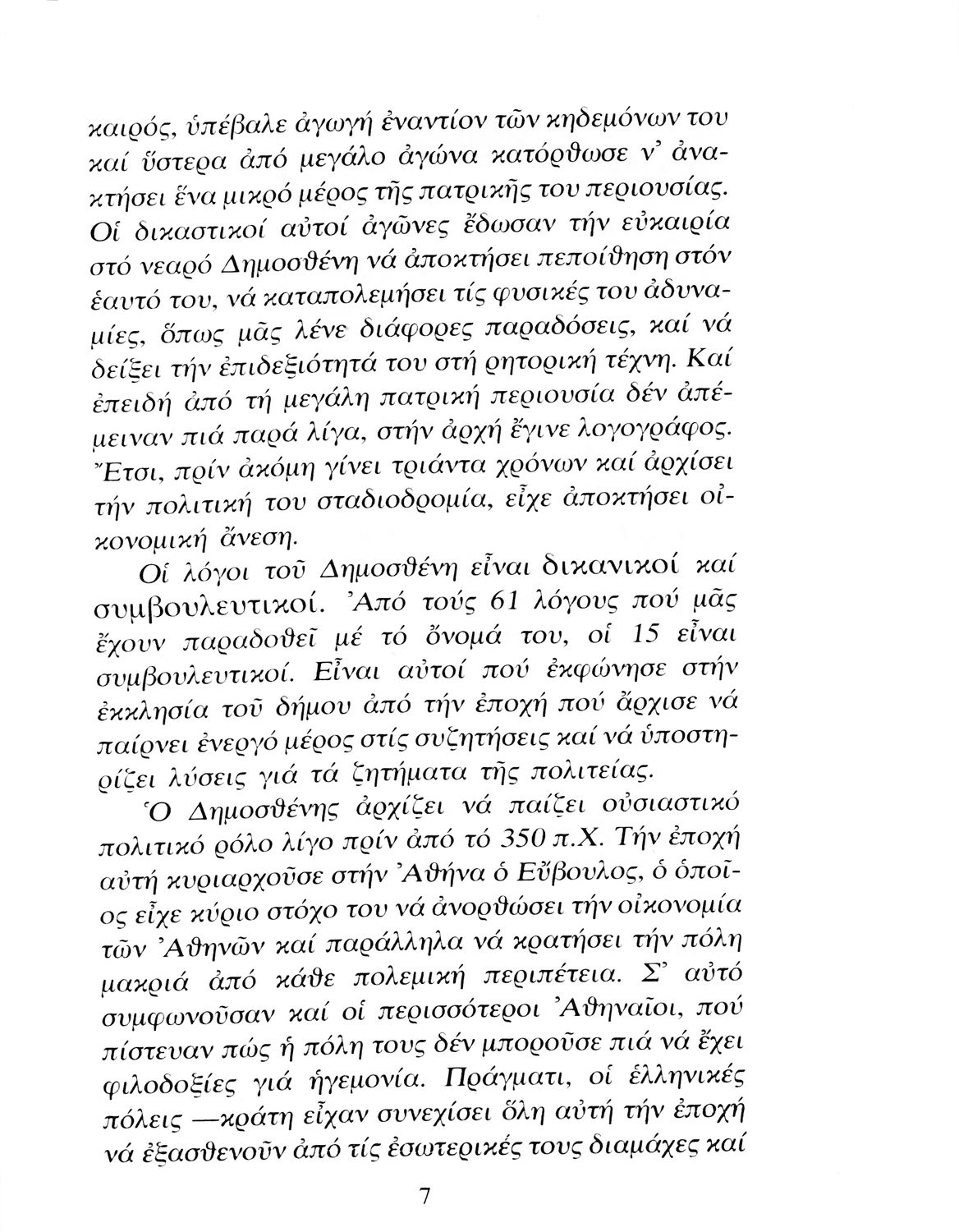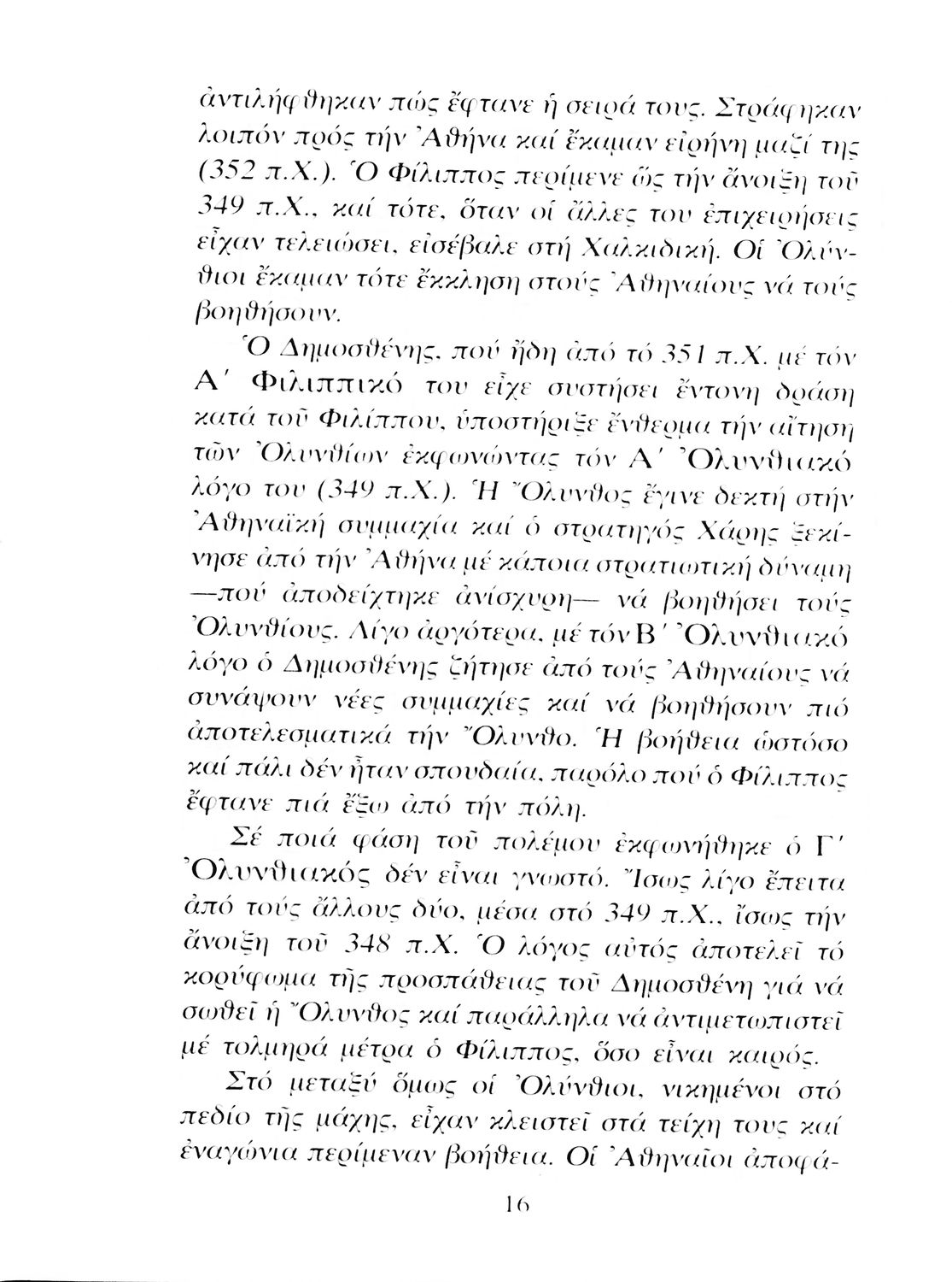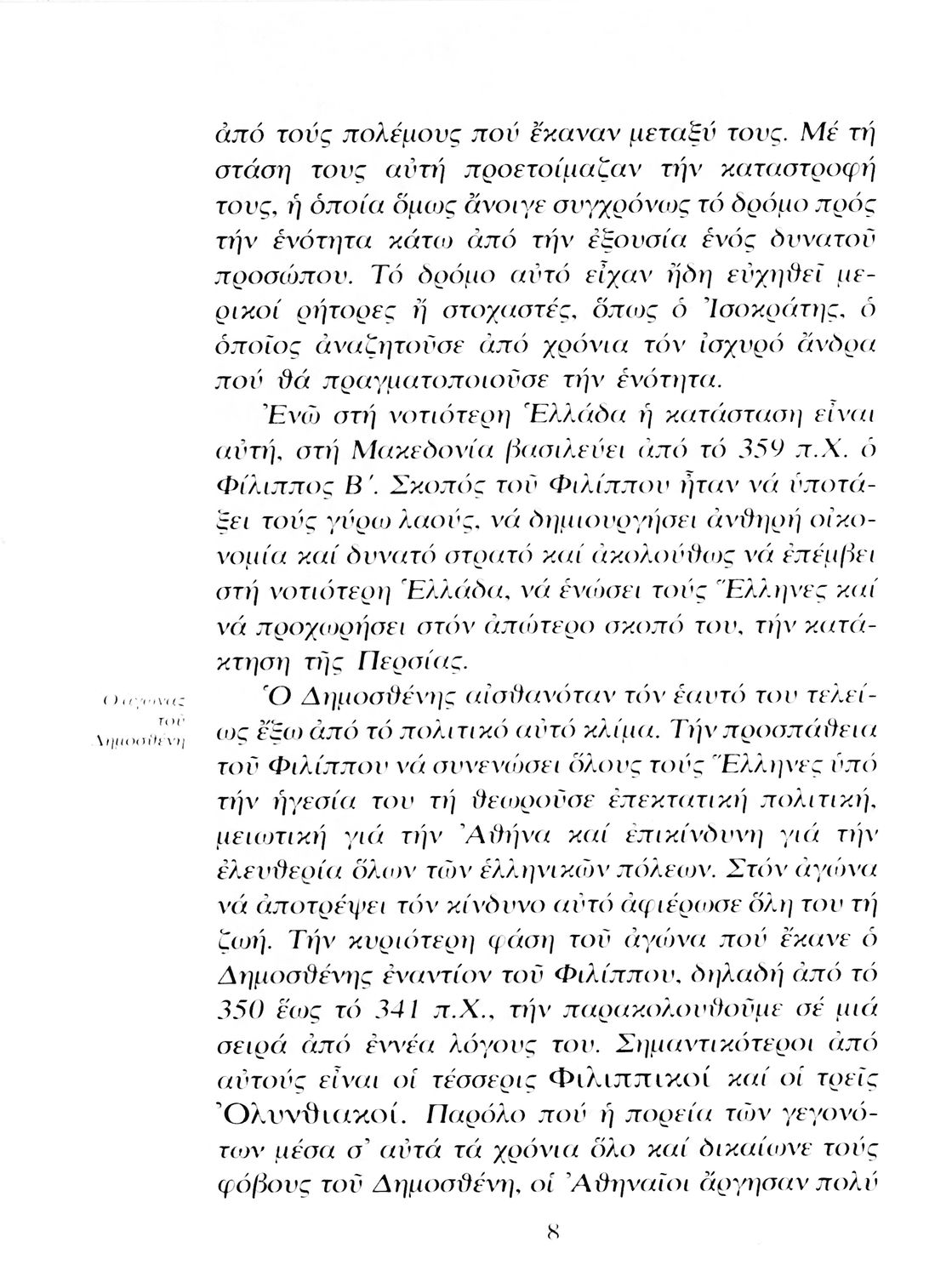 Σχολικό εγχειρίδιο Αρχαίων Ελληνικών Δ΄ Γυμνασίου που περιλαμβάνει εισαγωγή στη ζωή και στο έργο του Δημοσθένη, τον Α΄ κατά Φιλίππου, και τους Α΄ και Β΄ Ολυνθιακούς και ερμηνευτικά και ετυμολογικά σχόλια.