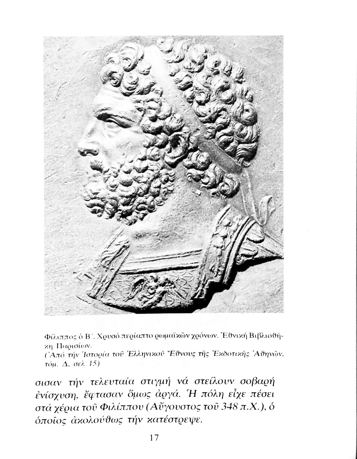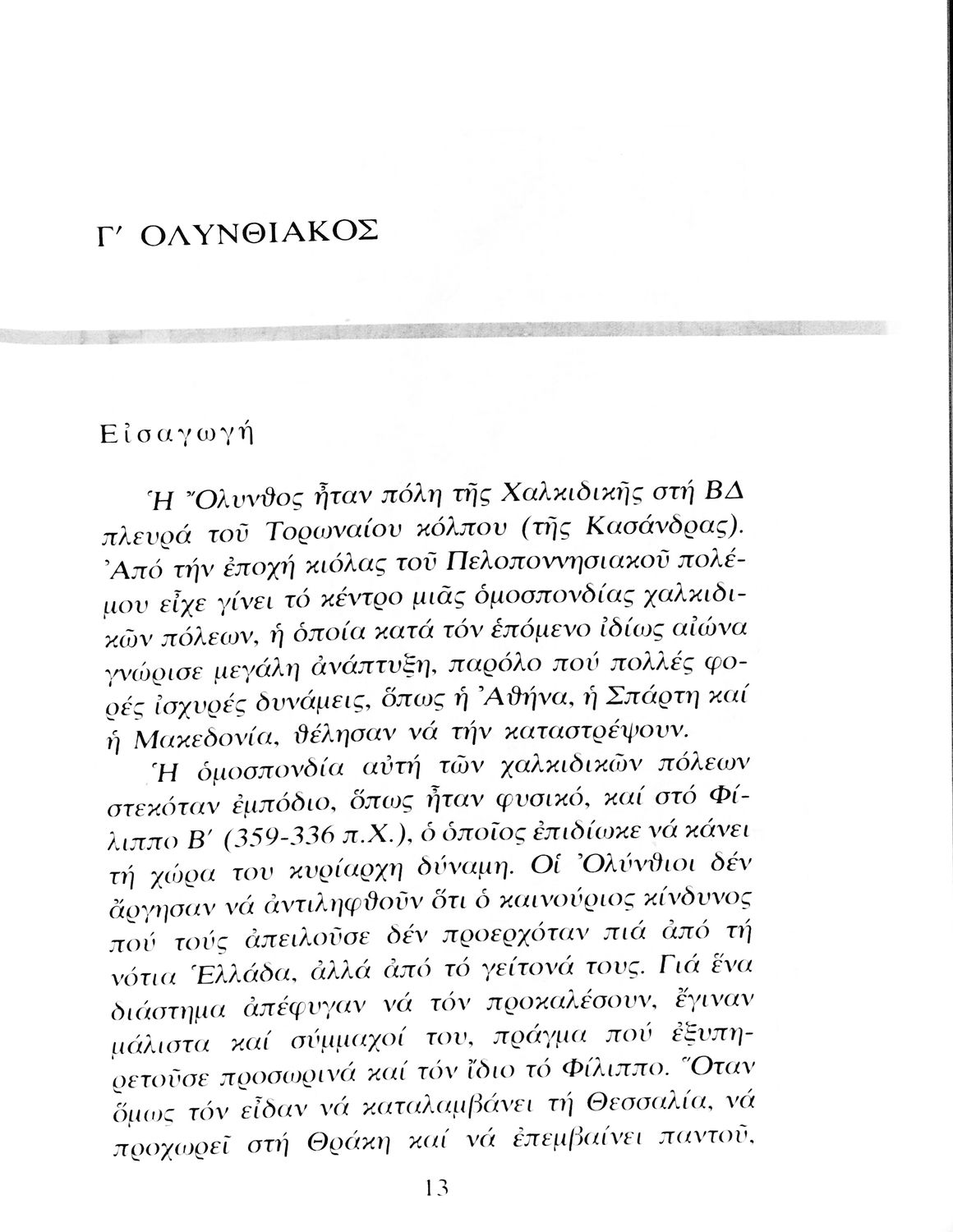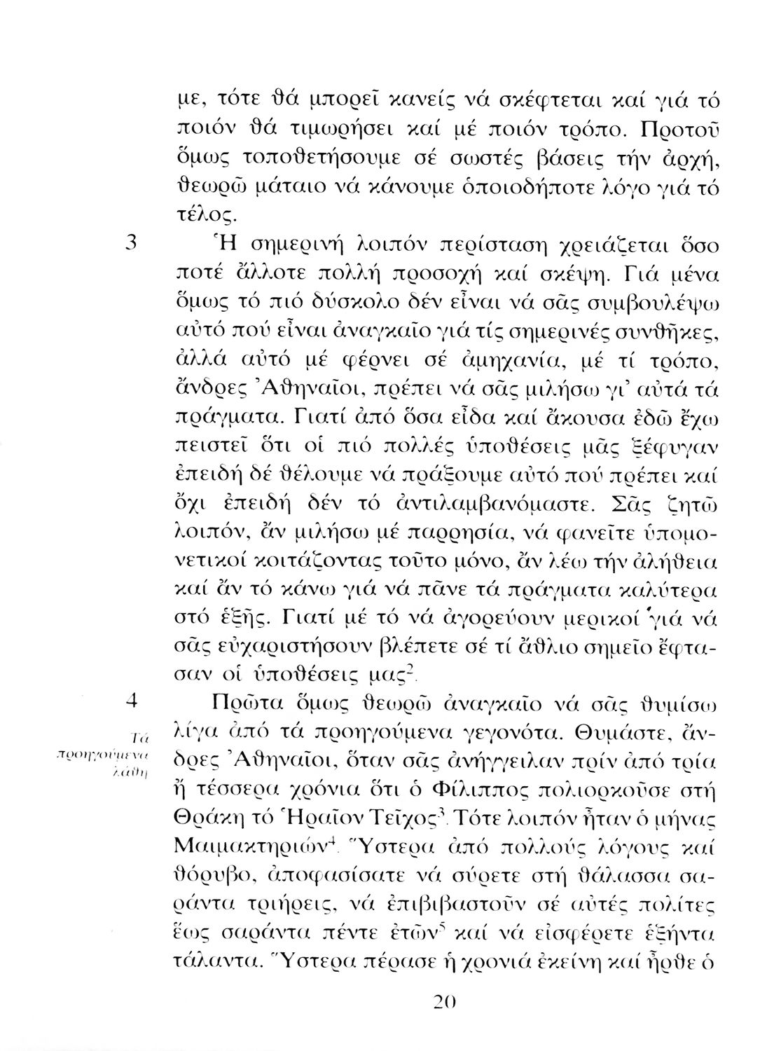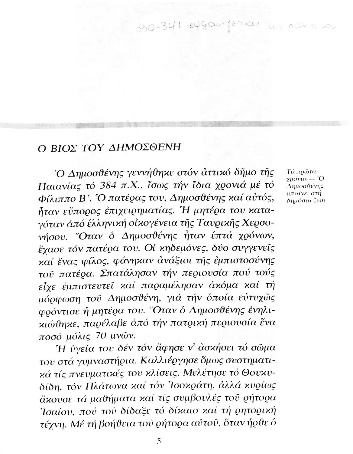 Σχολικό εγχειρίδιο Αρχαίων Ελληνικών Δ΄ Γυμνασίου που περιλαμβάνει εισαγωγή στη ζωή και στο έργο του Δημοσθένη, τον Α΄ κατά Φιλίππου, και τους Α΄ και Β΄ Ολυνθιακούς και ερμηνευτικά και ετυμολογικά σχόλια.