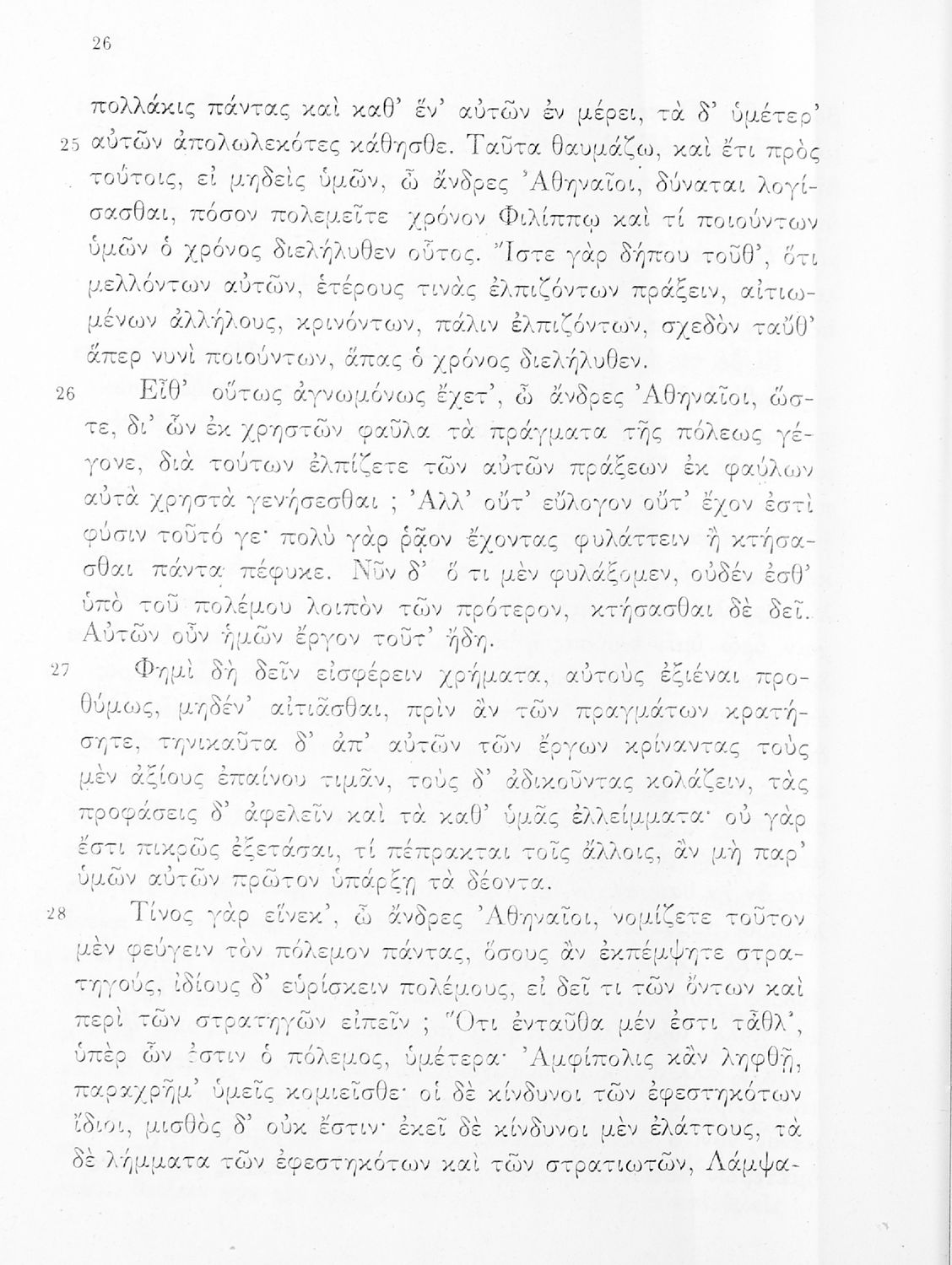 Σχολικό εγχειρίδιο Αρχαίων Ελληνικών Γυμνασίου που περιλαμβάνει τους Ολυνθιακούς Α΄ και Β΄ και τους Φιλιππικούς Α΄ και Β' του Δημοσθένη, εισαγωγή και ερμηνευτικά σχόλια.