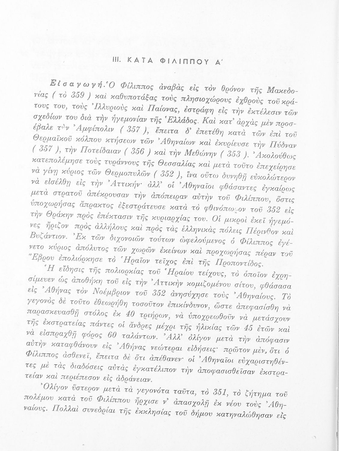 Σχολικό εγχειρίδιο Αρχαίων Ελληνικών Δ΄ Γυμνασίου που περιλαμβάνει τους Ολυνθιακούς Α΄ και Β΄ και τους Φιλιππικούς Α΄ και Β' του Δημοσθένη, εισαγωγή και ερμηνευτικά σχόλια. Φέρει το σύμβολο της δικτατορίας.
