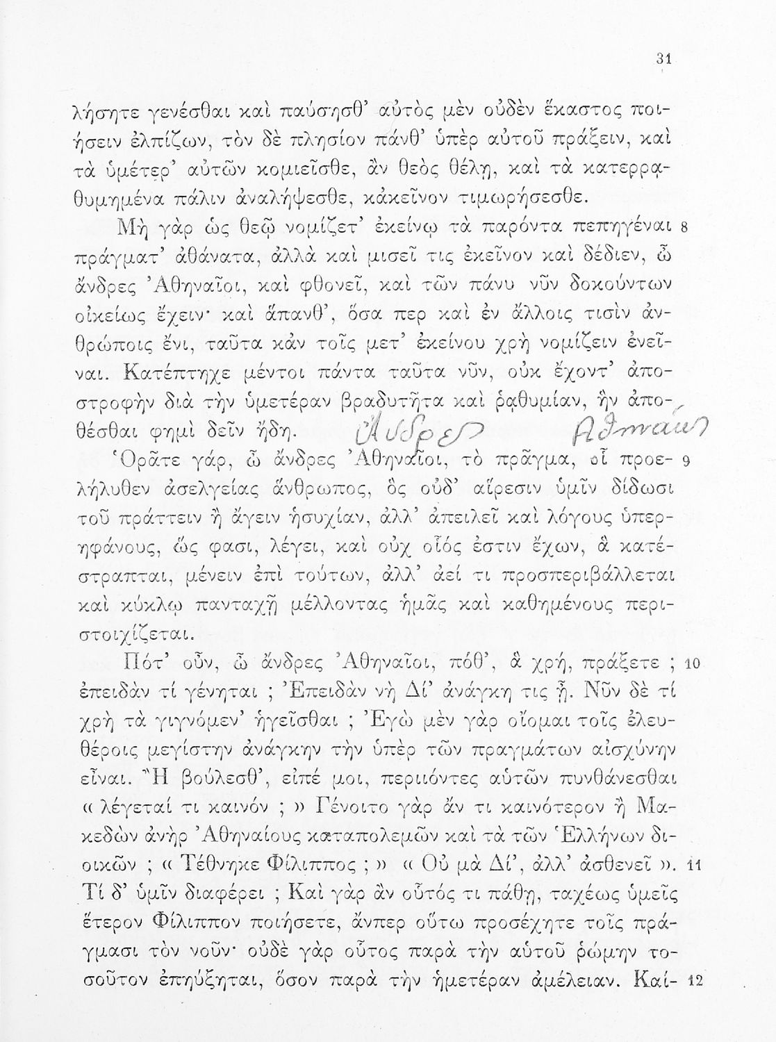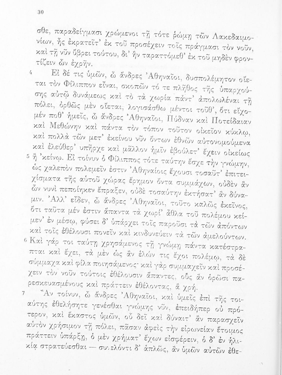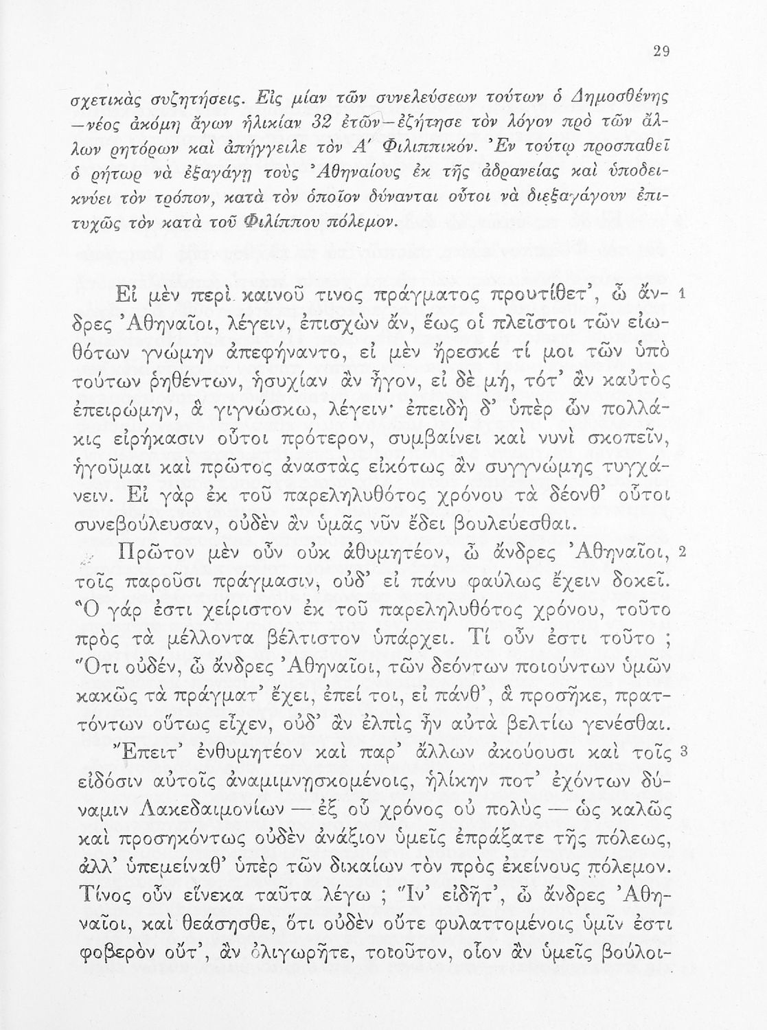 Σχολικό εγχειρίδιο Αρχαίων Ελληνικών Δ΄ Γυμνασίου που περιλαμβάνει εισαγωγή στη ζωή και στο έργο του Δημοσθένη, τον Α΄ κατά Φιλίππου, και τους Α΄ και Β΄ Ολυνθιακούς και ερμηνευτικά και ετυμολογικά σχόλια.