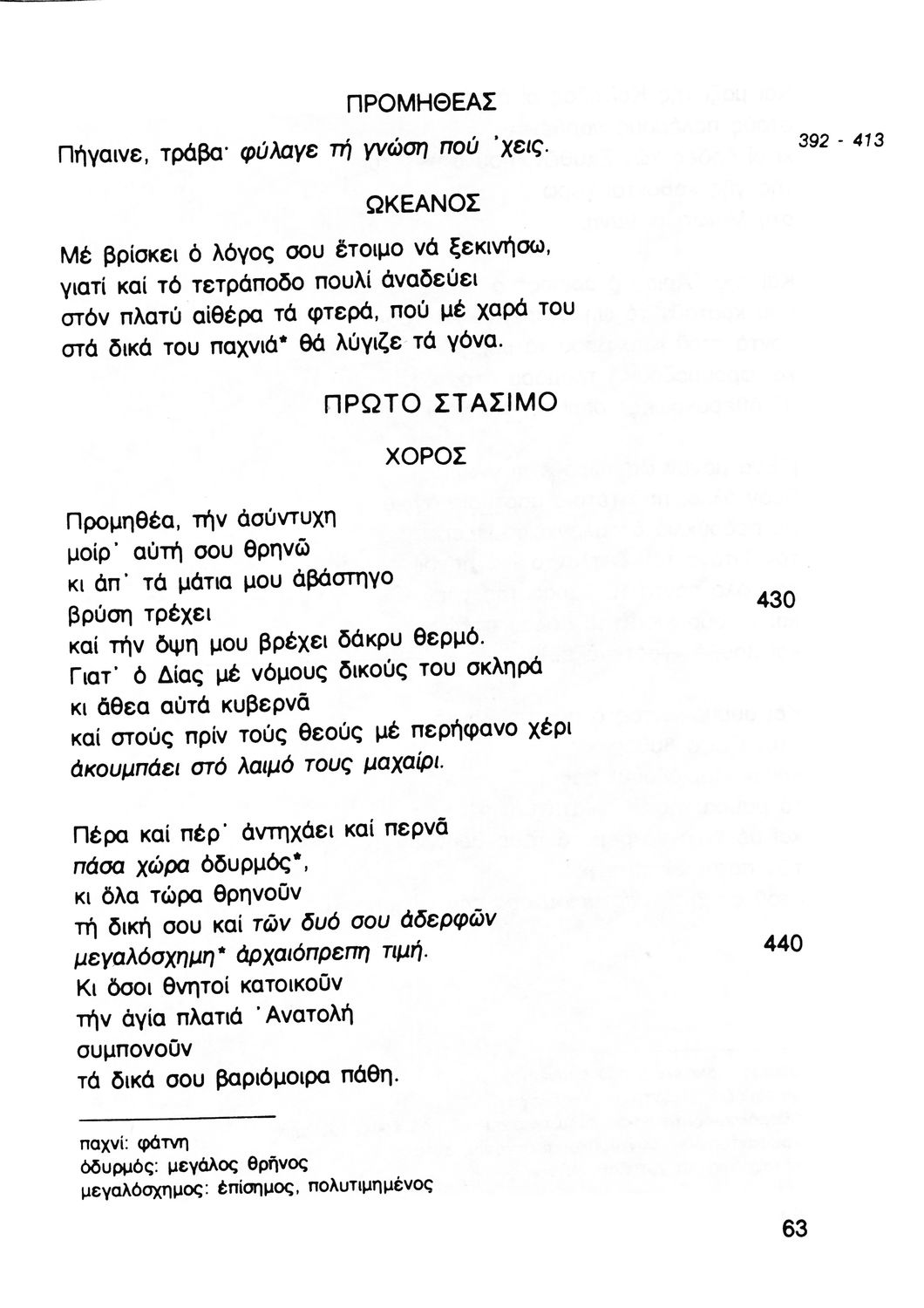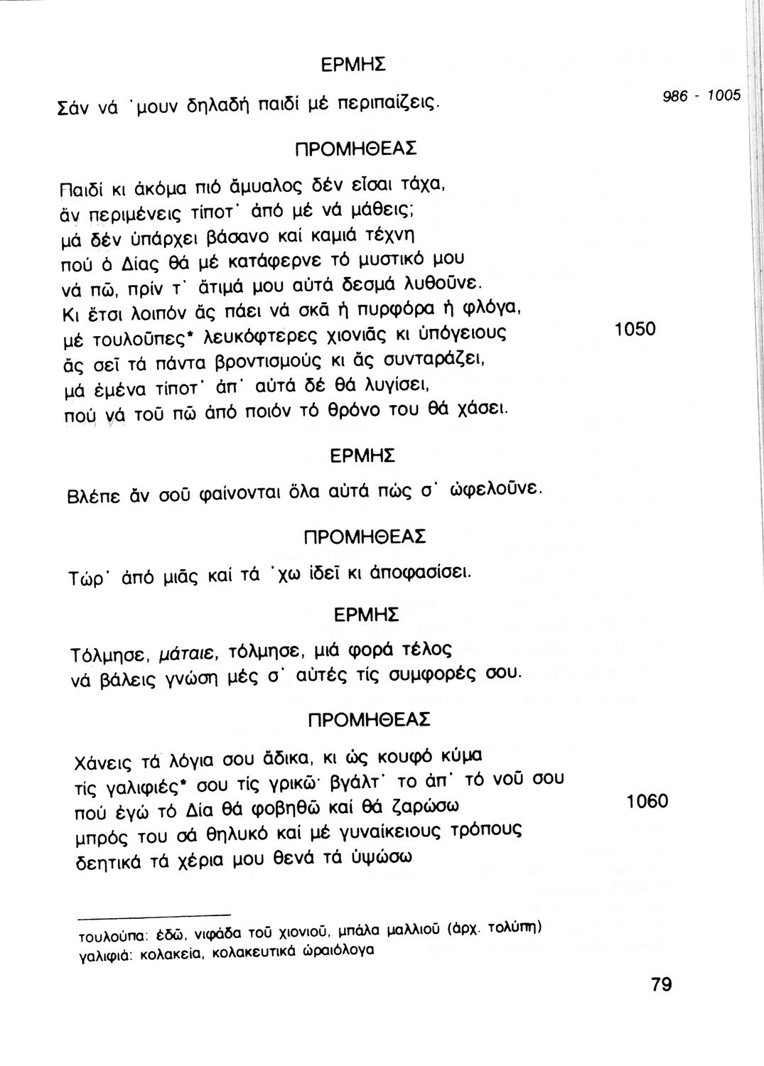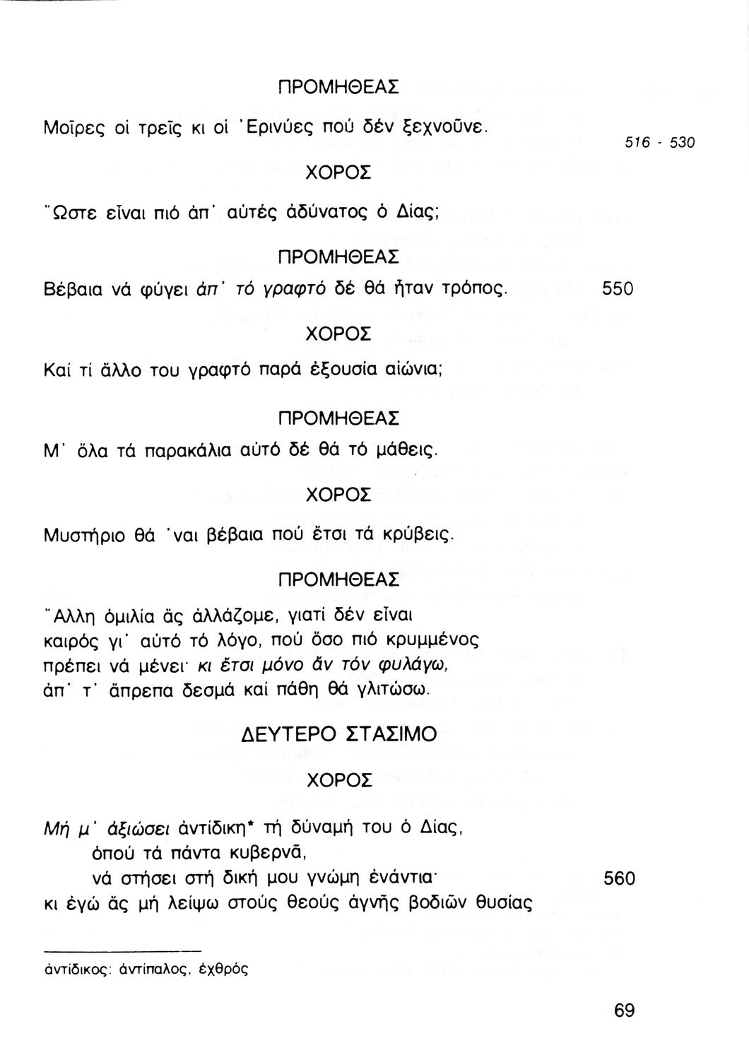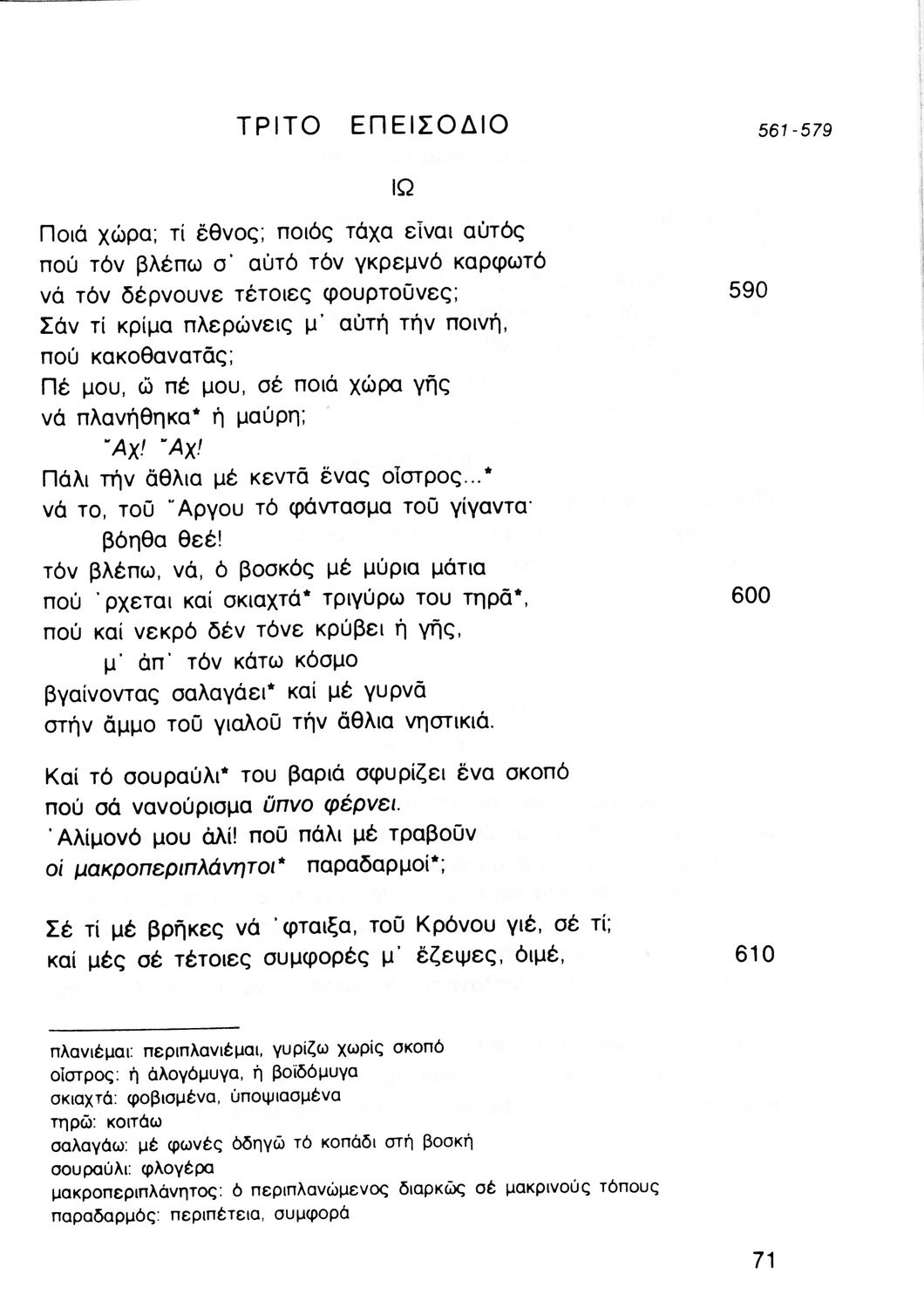 Σχολικό εγχειρίδιο Αρχαίων Ελληνικών Γ΄ Γυμνασίου που περιλαμβάνει εισαγωγή στη δραματική ποίηση, το αρχαίο θέατρο και την τραγωδία, μετάφραση των έργων Προμηθέας Δεσμώτης του Αισχύλου, Αντιγόνη του Σοφοκλή και Ιφιγένεια η εν Ταύροις του Ευριπίδη και ερμηνευτικά σχόλια.