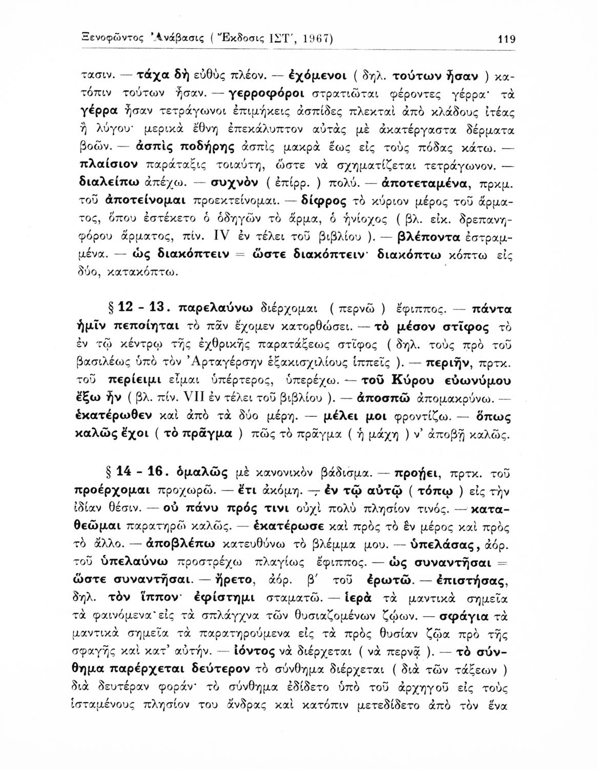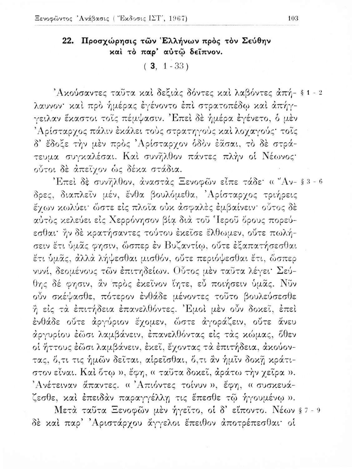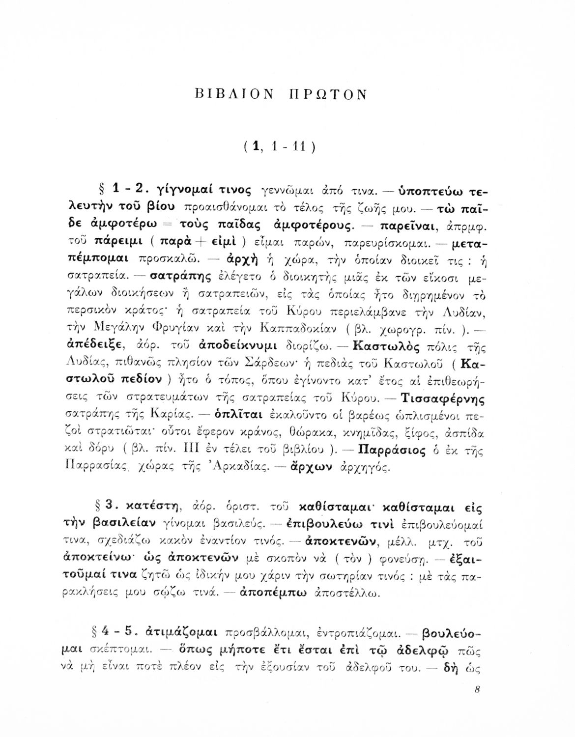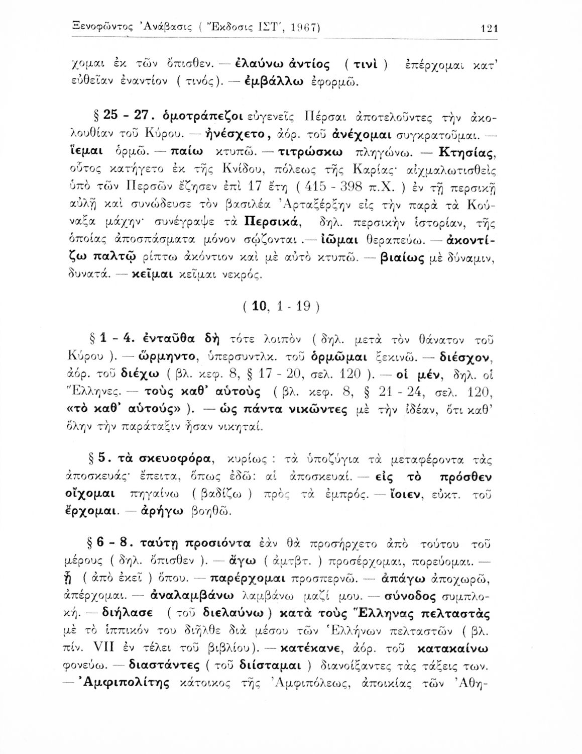 Σχολικό εγχειρίδιο Αρχαίων Ελληνικών για τη Γ' Γυμνασίου που περιέχει αποσπάσματα από την Ανάβαση του Ξενοφώντα και ερμηνευτικά και ετυμολογικά σχόλια.