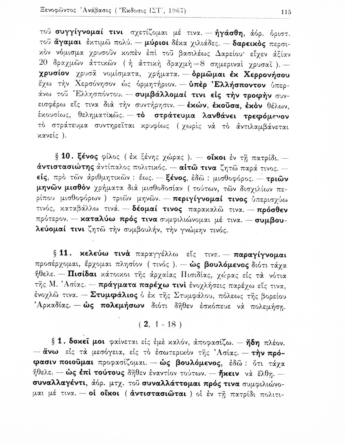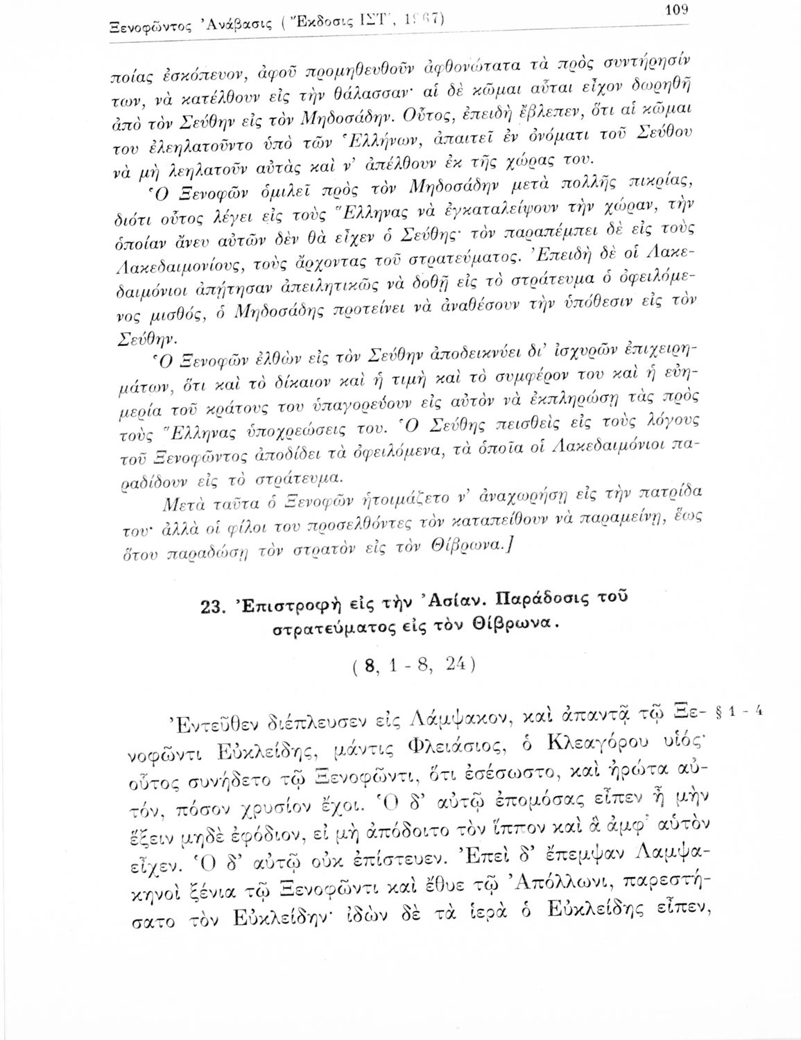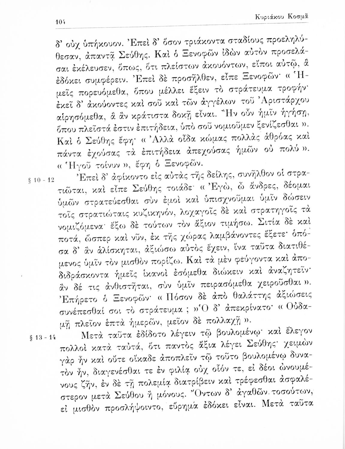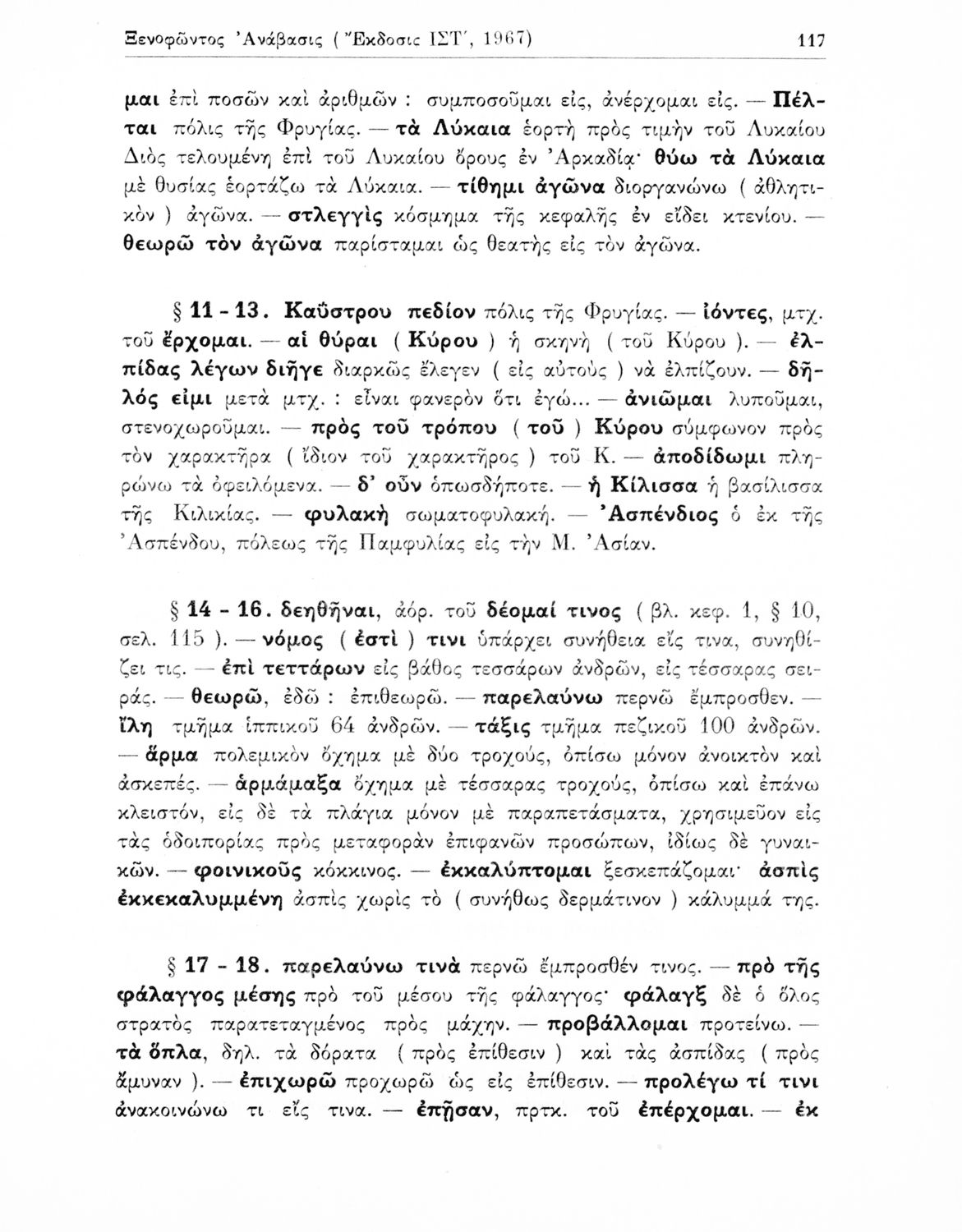 Σχολικό εγχειρίδιο Αρχαίων Ελληνικών για τη Γ' Γυμνασίου που περιέχει αποσπάσματα από την Ανάβαση του Ξενοφώντα και ερμηνευτικά και ετυμολογικά σχόλια.